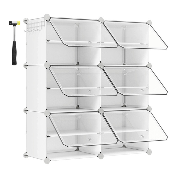 Modulárny plastový botník v bielej farbe ponúka šesť samostatných priehradiek s dvierkami, ktoré umožňujú prehľadné a praktické uskladnenie obuvi. Každá priehradka je vybavená priehľadnými dvierkami s otváraním smerom nahor, čo uľahčuje prístup a zároveň chráni obsah pred prachom. Vďaka modulárnemu prevedeniu je botník možné jednoducho zostaviť a prispôsobiť priestoru podľa potreby. Plastový materiál sa ľahko udržiava a zabezpečuje ľahkosť celého systému. Súčasťou balenia je aj gumová palička pre jednoduchú montáž.