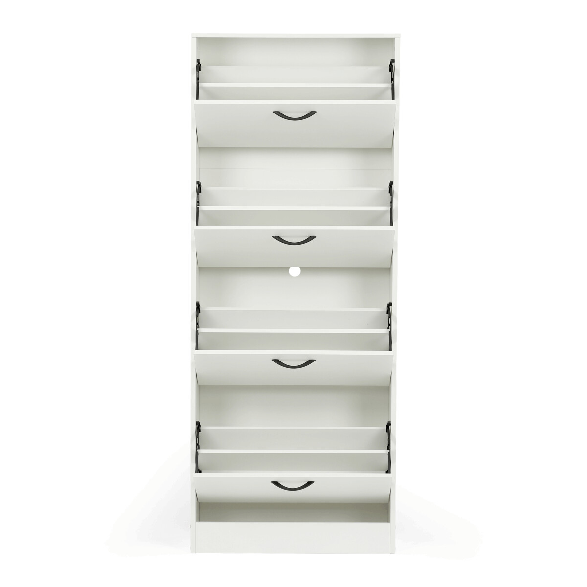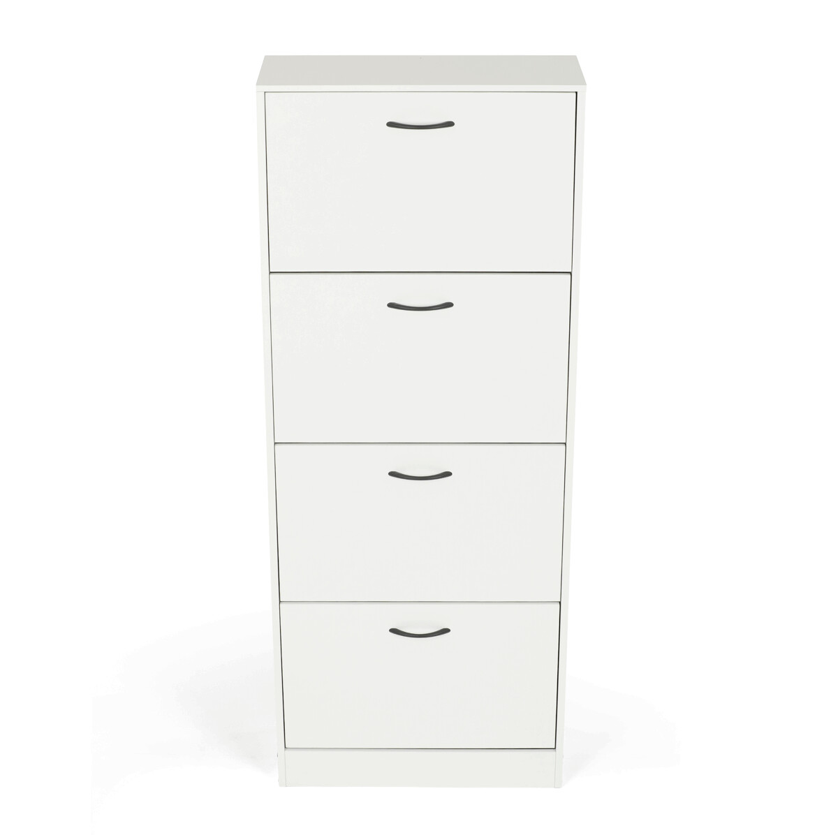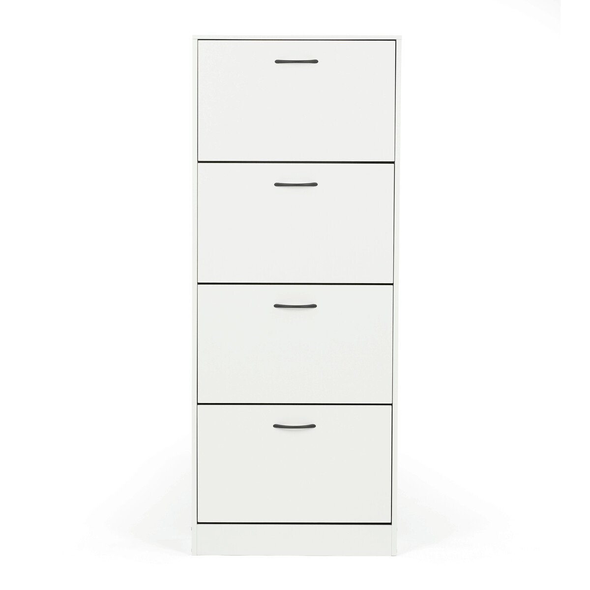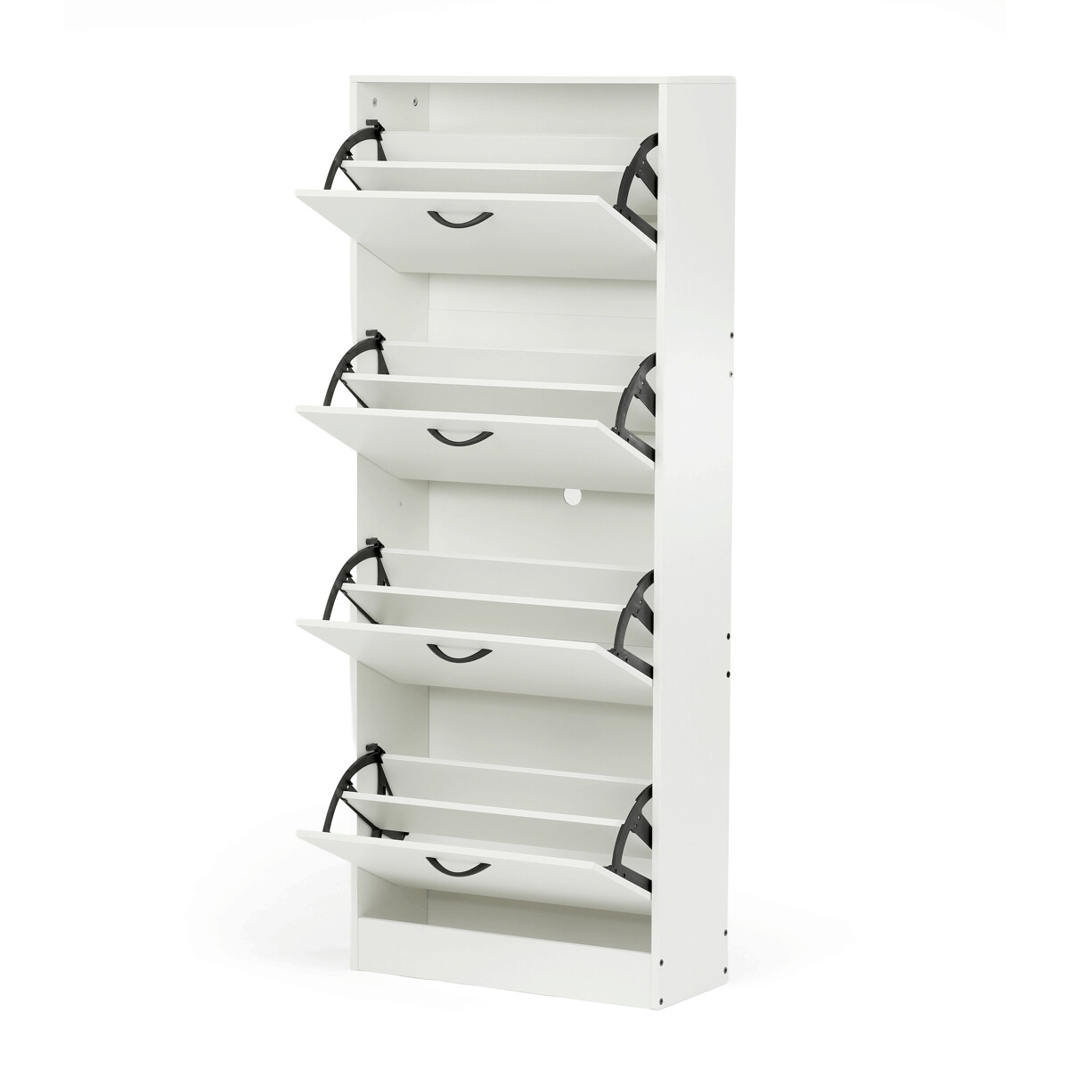 Botník so štyrmi priehradkami je vyrobený z MDF dosiek v bielej farbe, ktorá ľahko zapadne do rôznych interiérov. Každá priehradka je vybavená čiernymi úchytmi a otvára sa smerom von, čo umožňuje prehľadné a praktické uskladnenie obuvi. Pevné pánty zabezpečujú stabilné a tiché otváranie, zatiaľ čo kompaktné rozmery šetria miesto v predsieni alebo chodbe. Povrchová úprava MDF dosiek je hladká a ľahko sa udržiava, čo prispieva k dlhej životnosti botníka. Celkový dizajn kombinuje funkčnosť s jednoduchým moderným vzhľadom vhodným na každodenné použitie.
