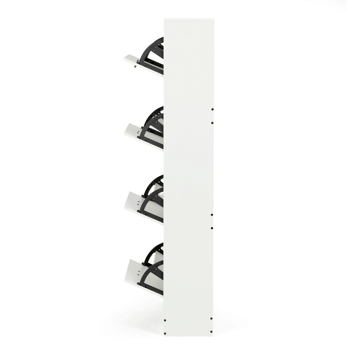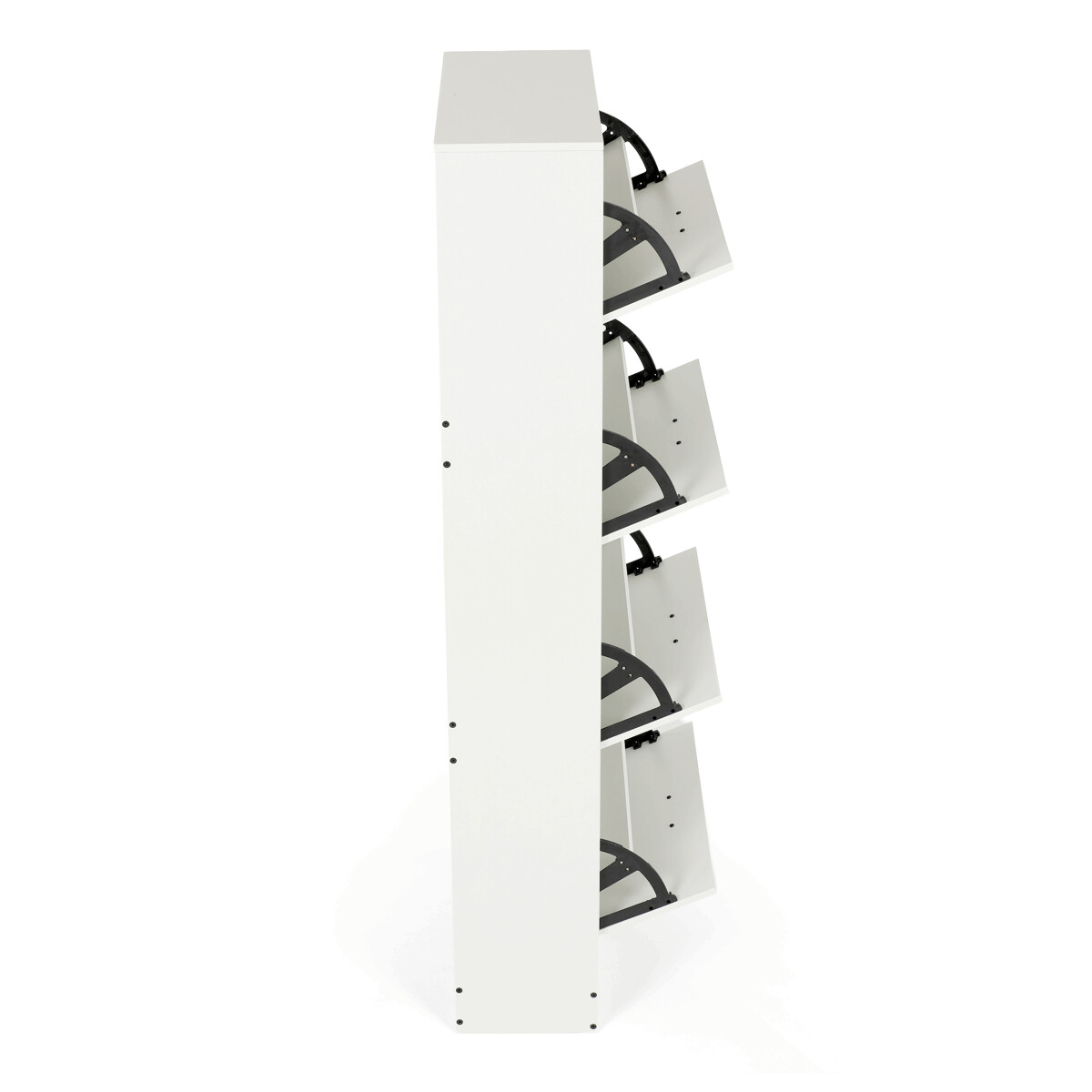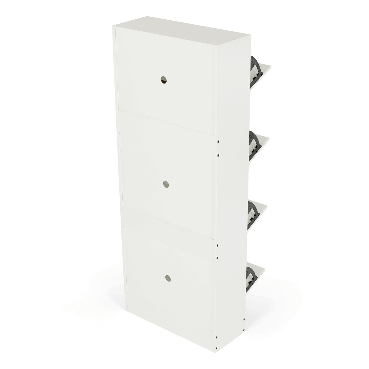 Botník so štyrmi priehradkami je vyrobený z MDF dosiek v bielej farbe, ktorá ľahko zapadne do rôznych interiérov. Každá priehradka je vybavená čiernymi úchytmi a otvára sa smerom von, čo umožňuje prehľadné a praktické uskladnenie obuvi. Pevné pánty zabezpečujú stabilné a tiché otváranie, zatiaľ čo kompaktné rozmery šetria miesto v predsieni alebo chodbe. Povrchová úprava MDF dosiek je hladká a ľahko sa udržiava, čo prispieva k dlhej životnosti botníka. Celkový dizajn kombinuje funkčnosť s jednoduchým moderným vzhľadom vhodným na každodenné použitie.