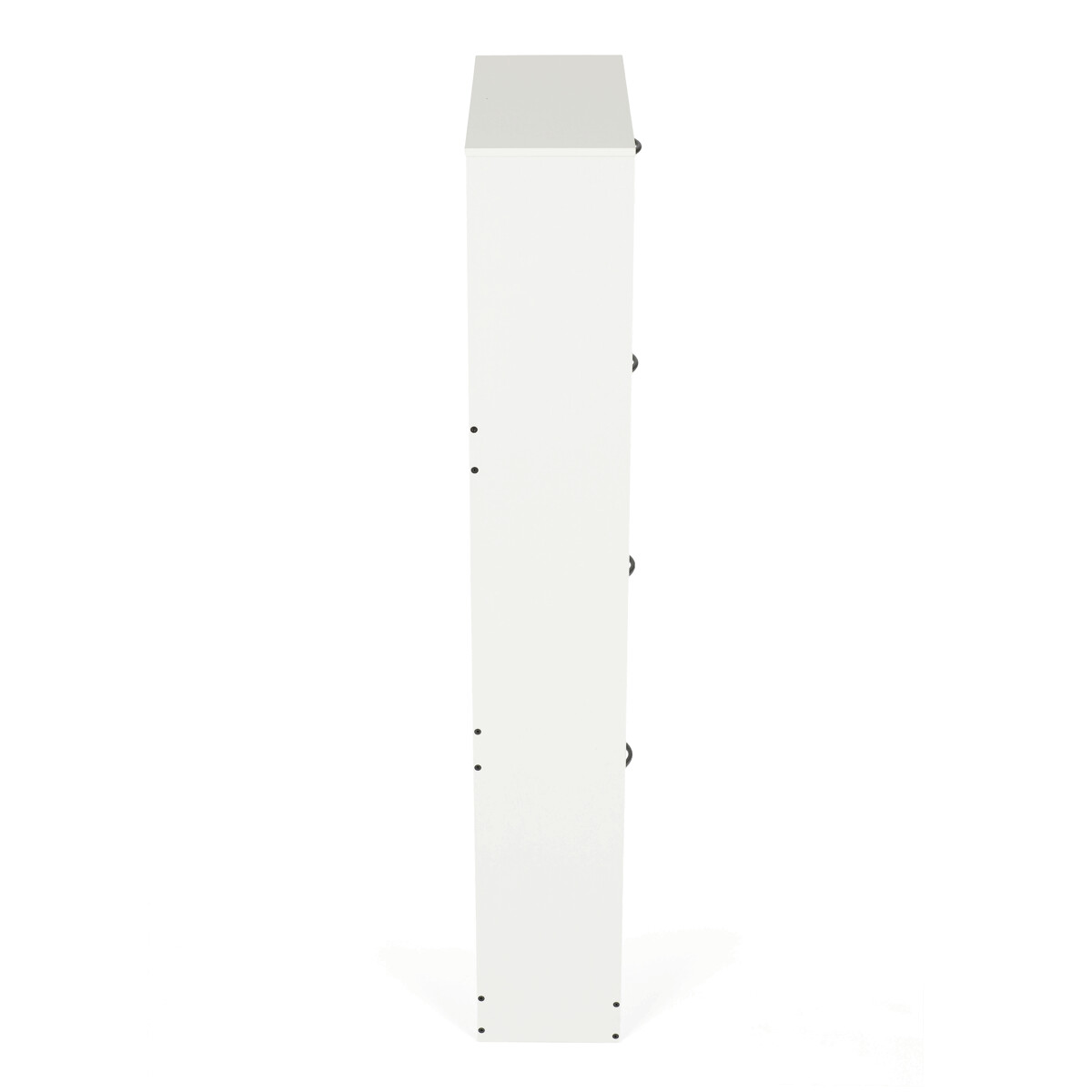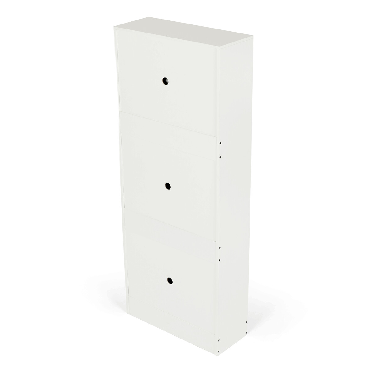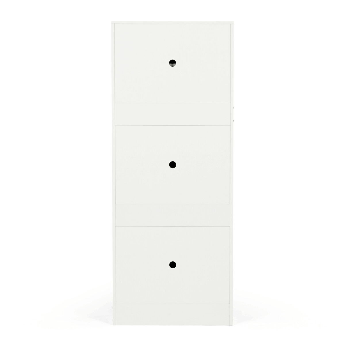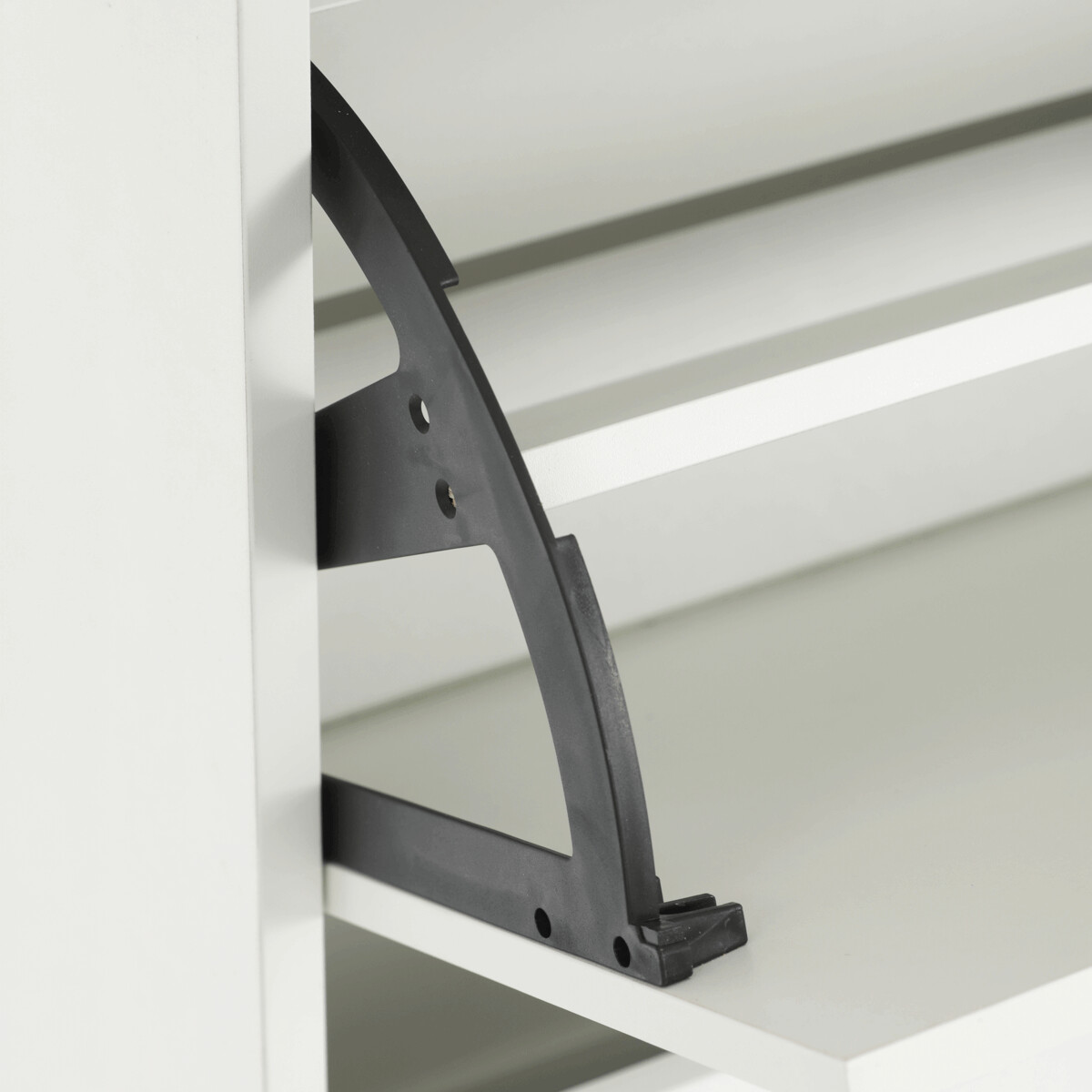Botník so štyrmi priehradkami je vyrobený z MDF dosiek v bielej farbe, ktorá ľahko zapadne do rôznych interiérov. Každá priehradka je vybavená čiernymi úchytmi a otvára sa smerom von, čo umožňuje prehľadné a praktické uskladnenie obuvi. Pevné pánty zabezpečujú stabilné a tiché otváranie, zatiaľ čo kompaktné rozmery šetria miesto v predsieni alebo chodbe. Povrchová úprava MDF dosiek je hladká a ľahko sa udržiava, čo prispieva k dlhej životnosti botníka. Celkový dizajn kombinuje funkčnosť s jednoduchým moderným vzhľadom vhodným na každodenné použitie.