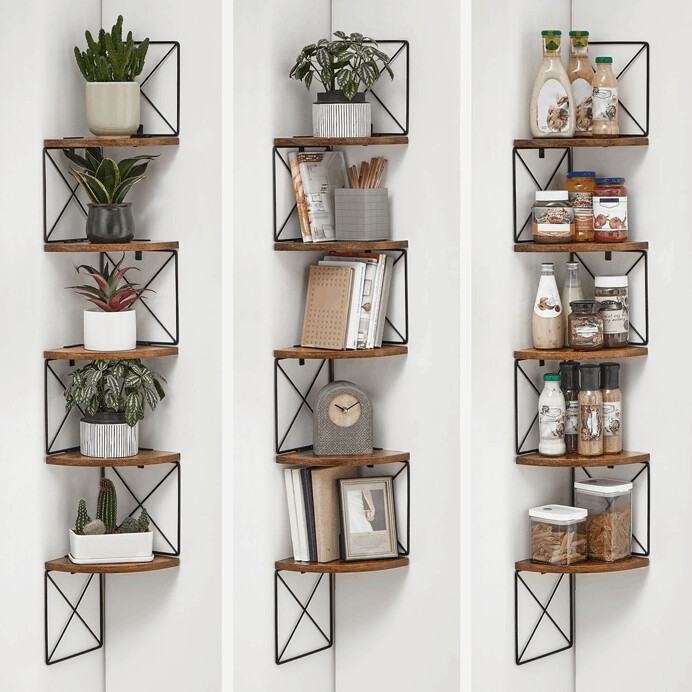 Nástenná rohová polica v dekore old wood kombinuje teplé hnedé odtiene MDF dosiek s čiernym kovovým rámo...zobraziť celý popis produktu