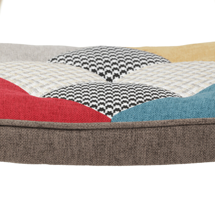 Relaxačné kreslo s podnožkou v patchworkovom dizajne kombinuje viacfarebnú látku s pevnými nohami z masívneho kaučukovníka, ktoré zabezpečujú stabilitu a dlhú životnosť. Čalúnenie je tvorené kvalitnou látkou s rôznorodými vzormi, ktorá dodáva kreslu výrazný vizuálny efekt a zároveň príjemný povrch na sedenie. Kreslo je vybavené pevnými podrúčkami, ktoré podporujú pohodlný posed, a doplnené o samostatný taburet pre maximálnu relaxáciu nôh. Ergonomicky tvarované operadlo a sedák poskytujú komfortnú oporu pre oddych. Tento set je ideálnou voľbou pre interiéry, kde sa kladie dôraz na farebnosť a pohodlie.