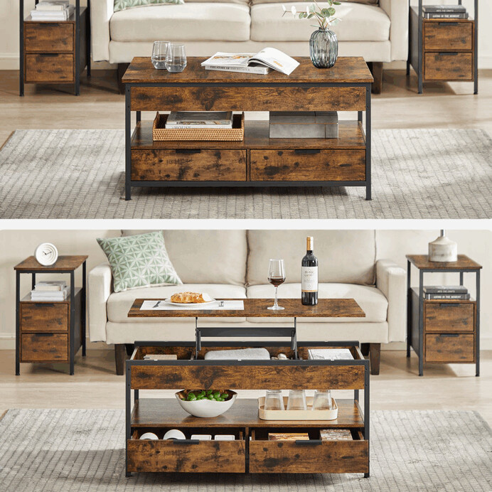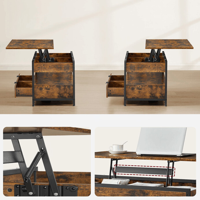 Konferenčný stolík AKF-E1252 OLW kombinuje praktický úložný priestor s industriálnym dizajnom v odtieni old wood. Doska stola je vyrobená z MDF s povrchovou úpravou pripomínajúcou staré drevo, ktorá dodáva stolíku rustikálny charakter a jednoduchú údržbu. Pevná kovová podnož zabezpečuje stabilitu a dlhú životnosť, zatiaľ čo výklopná horná doska odhaľuje priestranný úložný priestor vhodný na uloženie časopisov, diaľkových ovládačov alebo iných drobností. Dve spodné zásuvky s kovovými úchytkami dopĺňajú funkčnosť stolíka a umožňujú organizáciu menších predmetov. Rozmery 50x100x48-63 cm poskytujú dostatok priestoru pre pohodlné použitie v obývacej izbe.