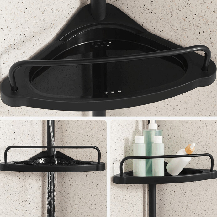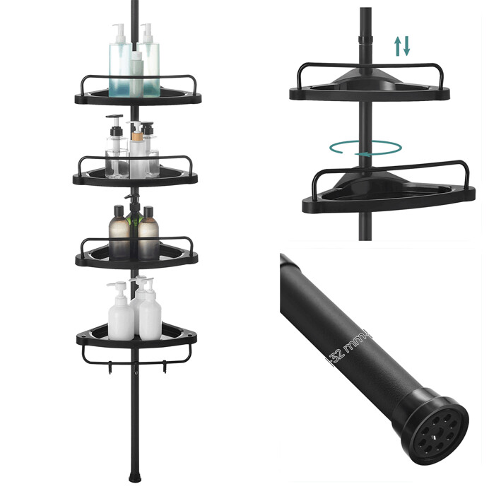 Nastaviteľná rohová polica do kúpeľne ponúka štyri odkladacie plochy v čiernom plastovom prevedení, ktoré efektívne využijú priestor v rohu miestnosti. Výšku police je možné flexibilne nastaviť v rozmedzí 85 až 305 cm, čo umožňuje prispôsobenie rôznym výškam stropu a potrebám používateľa. Každá polica je vybavená nízkym zábradlím, ktoré zabraňuje skĺznutiu predmetov, a spodná polica navyše disponuje dvoma háčikmi na zavesenie uterákov alebo ďalších doplnkov. Stabilná teleskopická tyč zabezpečuje pevné uchytenie medzi podlahou a stropom bez nutnosti vŕtania. Vďaka kompaktným rozmerom a praktickému dizajnu je vhodná na organizáciu kúpeľňových potrieb aj v menších priestoroch.