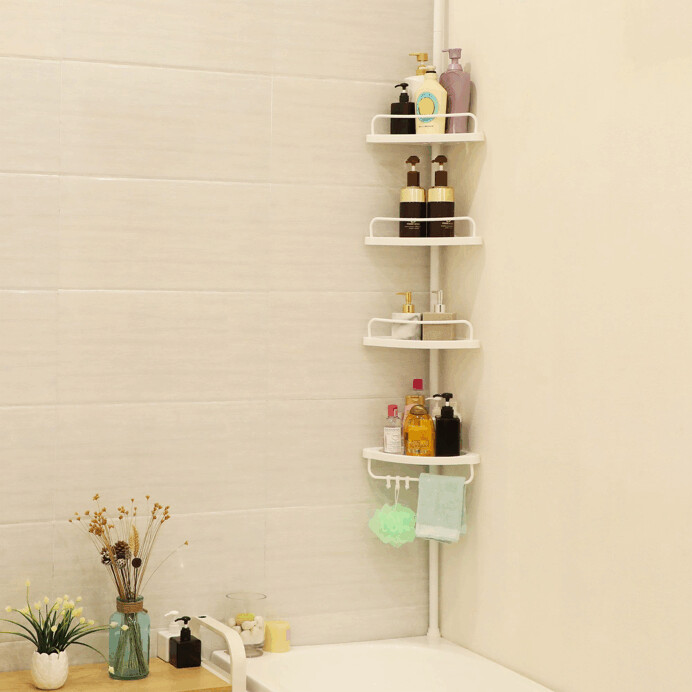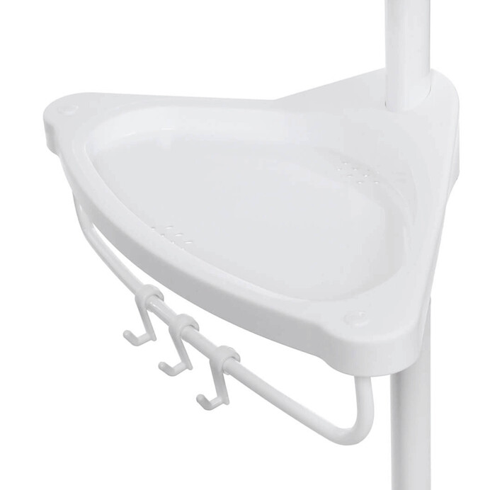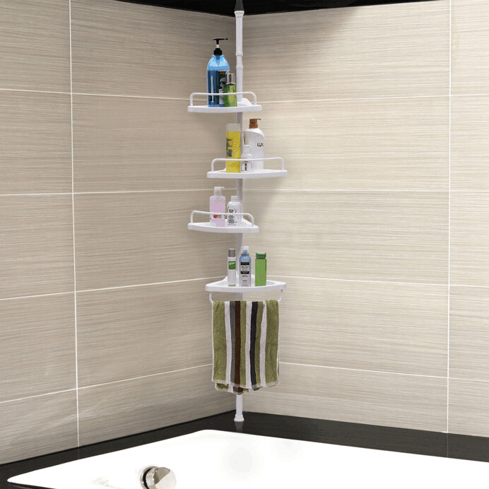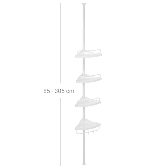 Nastaviteľná rohová polica do kúpeľne v bielom prevedení ponúka štyri praktické police na usporiadanie drobných predmetov a hygienických potrieb. Výšku je možné flexibilne nastaviť v rozmedzí 85 až 305 cm, čo umožňuje prispôsobenie rôznym priestorovým podmienkam. Police sú vyrobené z odolného plastu, ktorý sa ľahko udržiava a je vhodný do vlhkého prostredia kúpeľne. Súčasťou sú aj malé háčiky na spodnej polici na zavesenie doplnkov. Vďaka jednoduchému a čistému dizajnu sa hodí do moderných aj klasických kúpeľní.