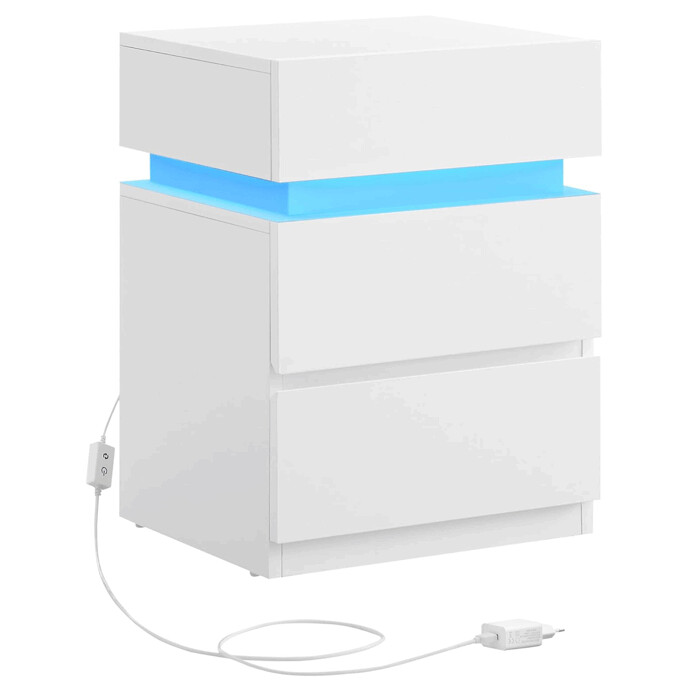 Nočný stolík ANT-E1163 WT z MDF v bielom prevedení ponúka praktický úložný priestor v dvoch zásuvkách s hladkým povrchom a bezúchytkovým otváraním. Jeho minimalistický dizajn dopĺňa integrované LED osvetlenie s modrým svetlom umiestnené medzi hornou doskou a telom stolíka, ktoré vytvára jemnú atmosféru a zároveň uľahčuje orientáciu v priestore. Stolík je vybavený napájacím káblom s ovládacím tlačidlom pre jednoduché zapnutie a vypnutie osvetlenia. Vďaka kompaktným rozmerom a kvalitnému bielemu matnému dekoru je vhodný do moderných interiérov spální aj obývacích izieb.