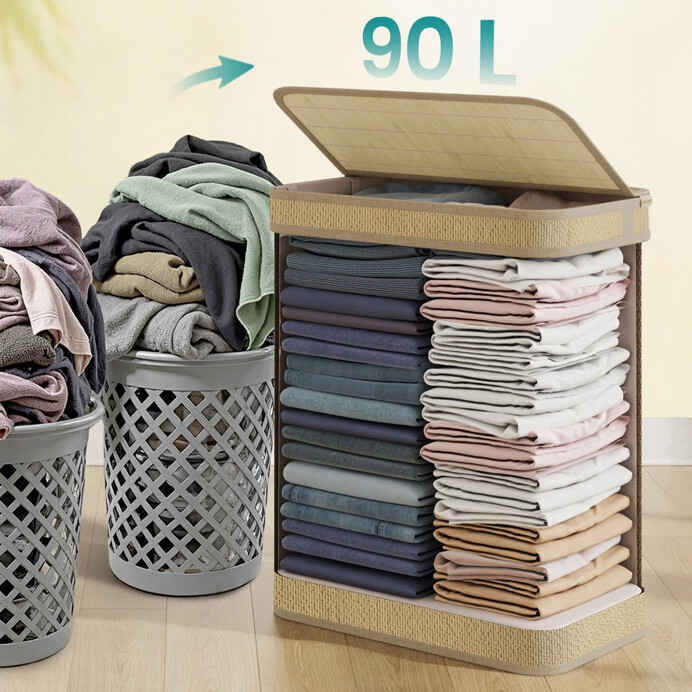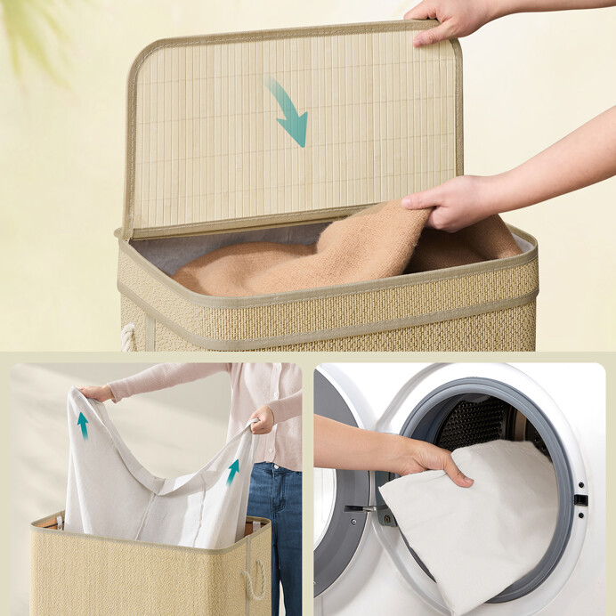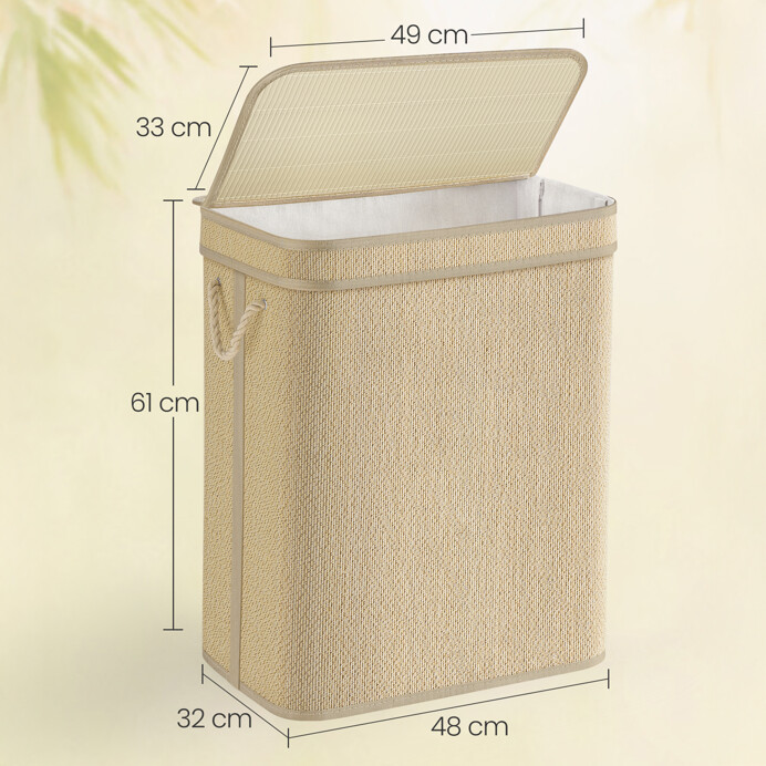 Kôš na bielizeň s rozmermi 49x33x61 cm je vyrobený z prírodného bambusu, ktorý zabezpečuje pevné a stabilné prevedenie. Nosné vzpery z kovu dodávajú košu potrebnú tuhosť a umožňujú jednoduché udržiavanie tvaru aj pri plnom naplnení. Praktické madlo uľahčuje manipuláciu a prenášanie koša. Vnútorná časť je vybavená textilnou vložkou, ktorá uľahčuje ukladanie bielizne a zároveň chráni bambusovú štruktúru. Vďaka prírodnému odtieňu sa kôš hodí do rôznych typov interiérov, kde prináša funkčný a zároveň estetický prvok.