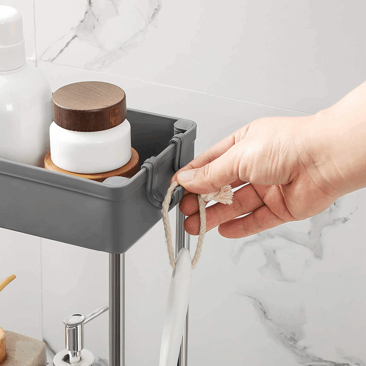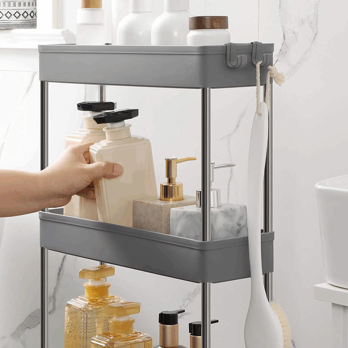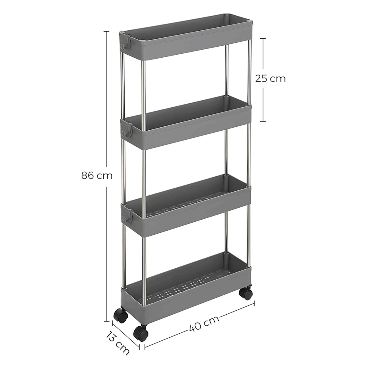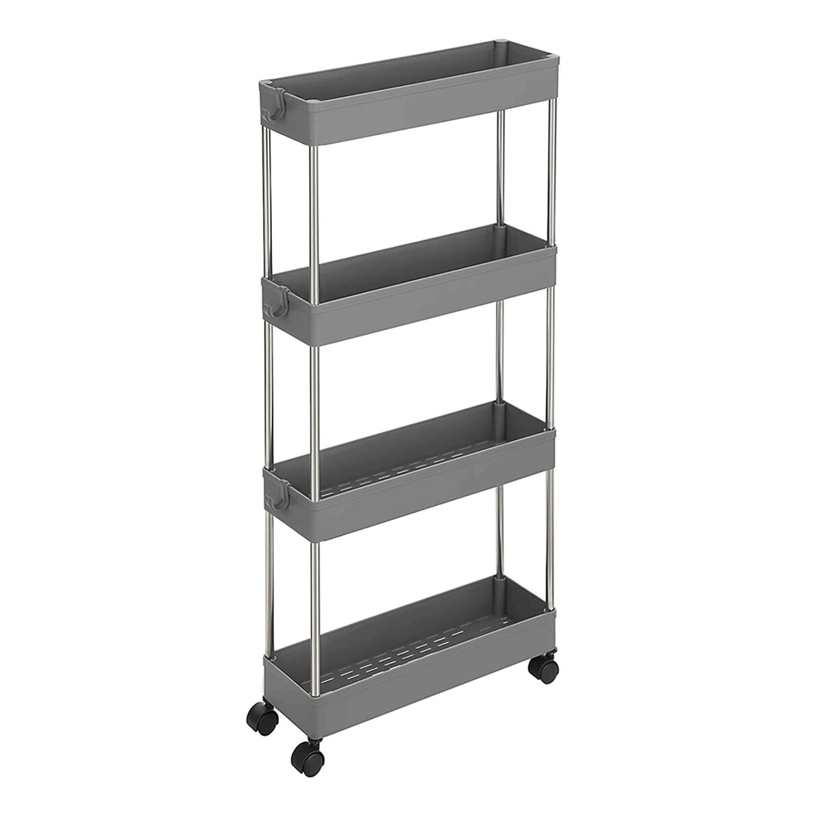 Úložný vozík so štyrmi policami kombinuje pevnú kovovú konštrukciu s odolnými sivými plastovými policami, ktoré poskytujú dostatok priestoru na organizáciu rôznych predmetov. Vozík je vybavený plastovými kolieskami, ktoré zabezpečujú ľahkú mobilitu a umožňujú pohodlné presunutie aj v obmedzených priestoroch. Vďaka kompaktným rozmerom a praktickému usporiadaniu políc je vhodný do kancelárií, dielní aj domácností. Kovové stĺpiky dodávajú stabilitu a zaručujú dlhú životnosť produktu. Celková konštrukcia je navrhnutá tak, aby uľahčila prístup k uloženým veciam a zároveň šetrila miesto.