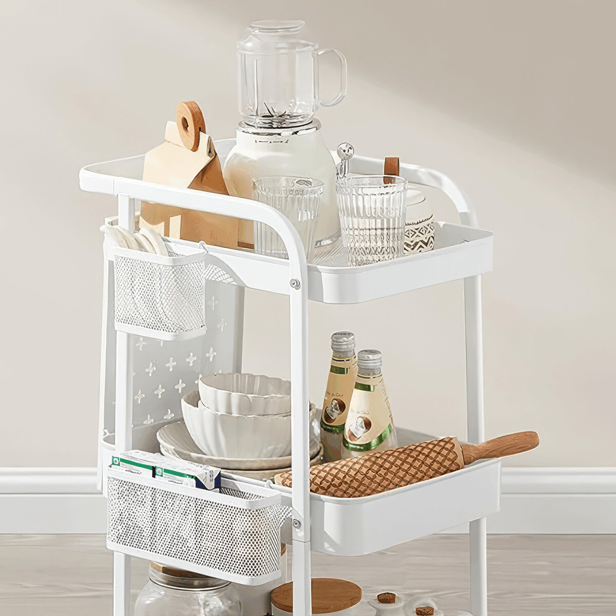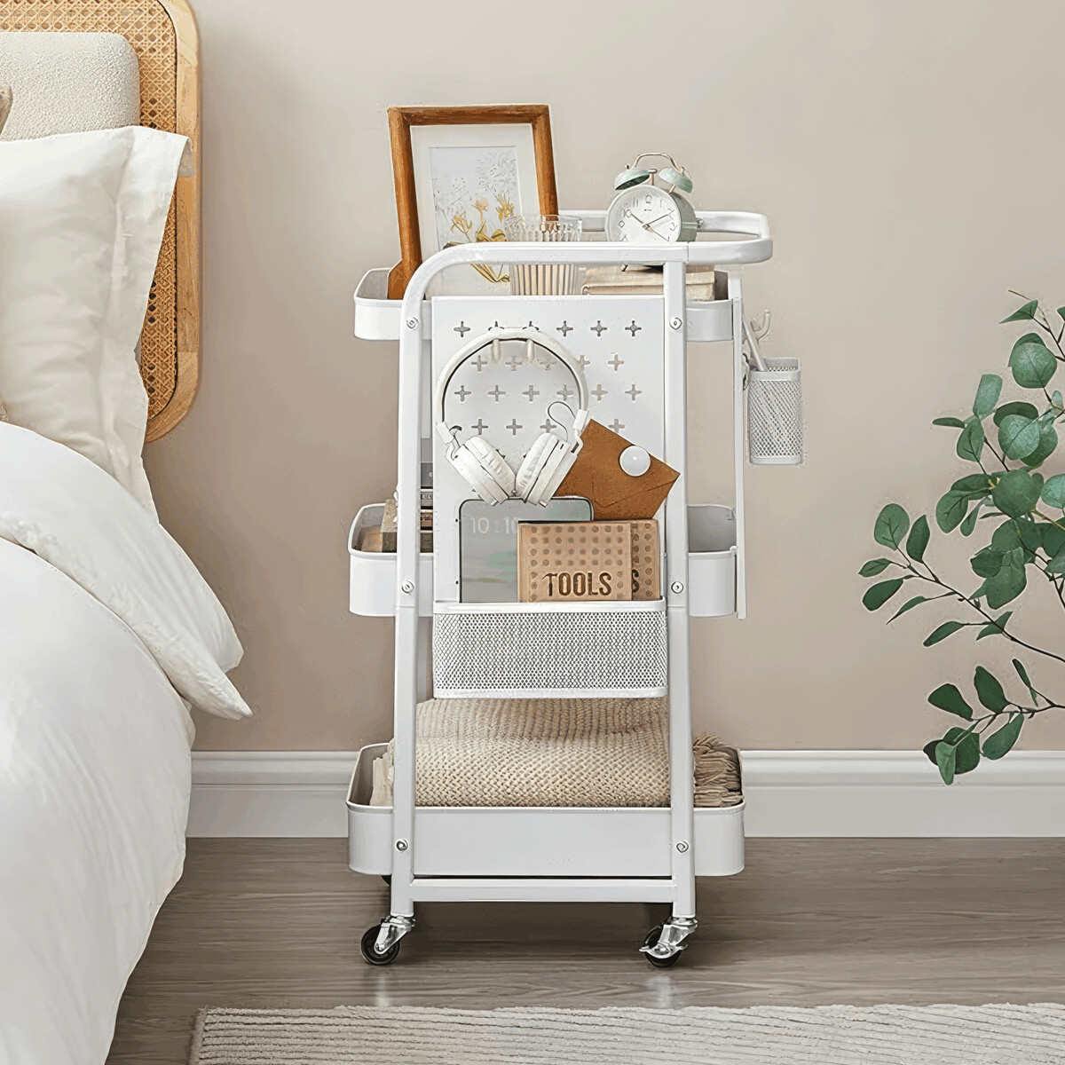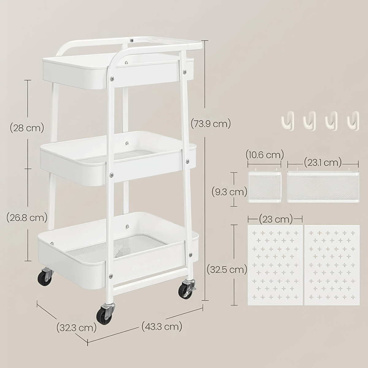 Pojazdný úložný vozík v bielom prevedení je vyrobený z pevného kovu s práškovým lakom, ktorý zabezpečuje odolnosť proti poškriabaniu a jednoduchú údržbu. Konštrukcia ponúka tri priestranné police s perforovanými bočnými panelmi, ktoré umožňujú pripevnenie doplnkových košíkov a háčikov pre efektívnu organizáciu drobných predmetov. Vozík je vybavený štyrmi otočnými kolieskami, z ktorých dve majú brzdový mechanizmus pre stabilnú fixáciu na mieste. Vďaka kompaktným rozmerom a mobilite je ideálny na použitie v kancelárii, dielni alebo domácnosti na prehľadné uskladnenie náradia, kancelárskych potrieb či kreatívnych materiálov.