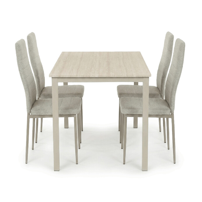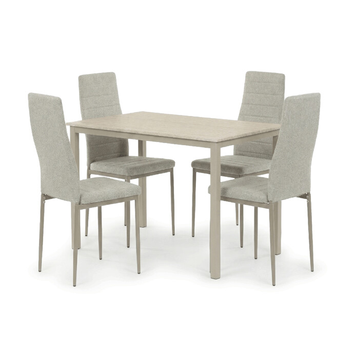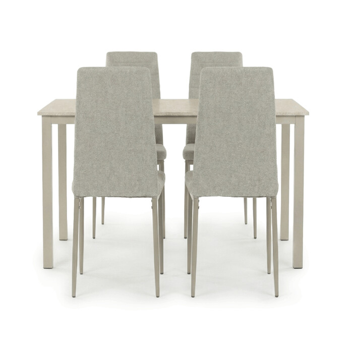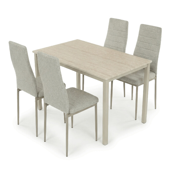Jedálenský set 1+4 kombinuje praktický stôl s rozmermi 110x70x75 cm a štyri pohodlné stoličky v krémovom odtieni. Doska stola je vyrobená z MDF s dekoratívnym povrchom v odtieni travertínu, ktorý napodobňuje prírodný kameň a ľahko sa udržiava. Stabilné kovové nohy stola v farbe cashmere zabezpečujú pevnosť a dlhú životnosť, zatiaľ čo stoličky majú kovovú konštrukciu v cappuccino odtieni a sú čalúnené príjemnou látkou, ktorá podporuje komfort pri sedení. Nadčasový dizajn celého setu sa hodí do rôznych interiérov a vďaka kvalitnému spracovaniu je vhodný na každodenné použitie v domácnosti aj menších prevádzkach.