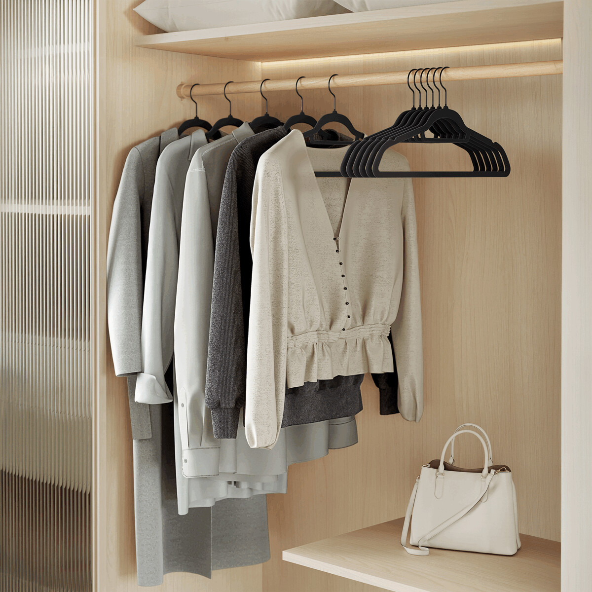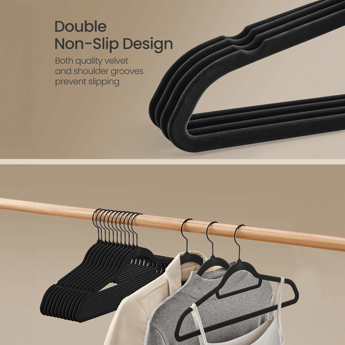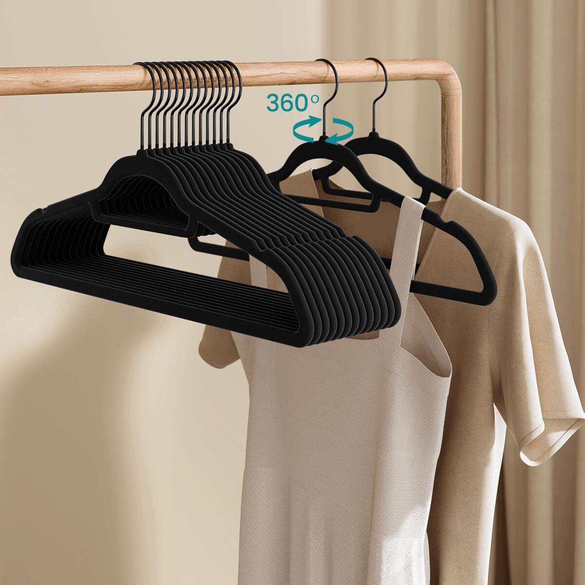 Sada 50 čiernych sametových ramienok je ideálna na usporiadanie šatníka s dôrazom na ochranu odevov pred skĺznutím. Ramienka majú hladký povrch s jemnou sametovou úpravou, ktorá zabraňuje poškodeniu tkanín a zároveň pôsobí elegantne. Kovové háčiky sú otočné o 360°, čo uľahčuje zavesenie a manipuláciu. Vďaka tenkému profilu šetria miesto v šatníkovej skrini a umožňujú prehľadné uloženie rôznych typov odevov. Sú vhodné na domáce aj komerčné použitie.