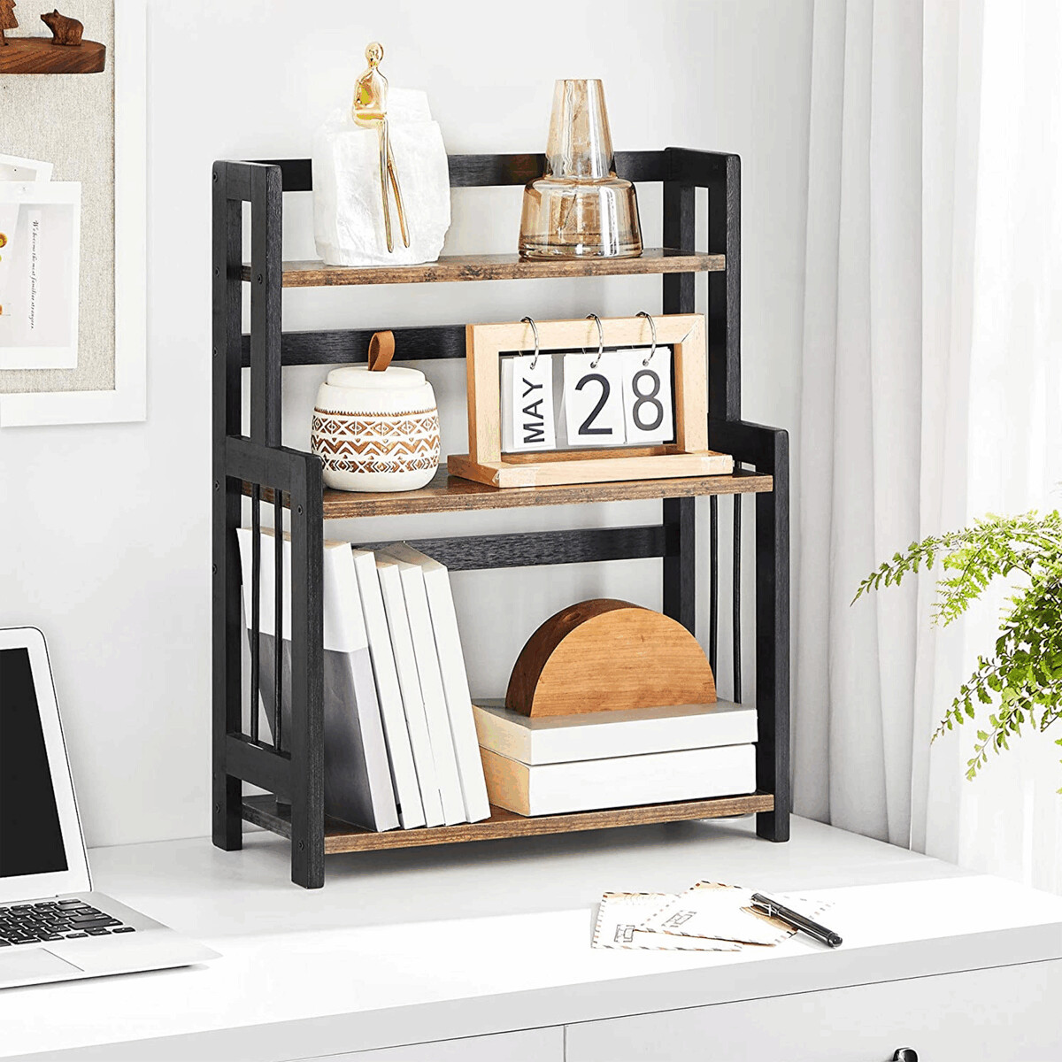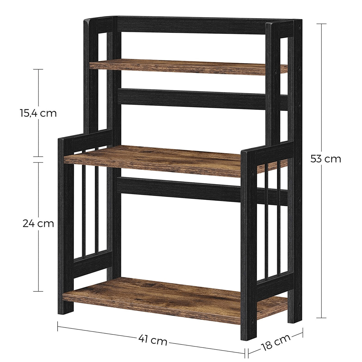 Organizér s tromi policami kombinuje pevný bambusový rám v čiernom prevedení s odkladacími plochami z hnedej MDF dosky, ktoré ponúkajú dostatok miesta na usporiadanie drobných predmetov. Robustný rám z bambusu zabezpečuje stabilitu a dlhú životnosť, zatiaľ čo MDF dosky sú hladké a ľahko udržiavateľné. Otvorená konštrukcia umožňuje rýchly prístup k uloženým veciam a zároveň prispieva k vzdušnému vzhľadu. Vďaka kompaktným rozmerom je organizér vhodný na použitie v rôznych priestoroch, ako sú kancelárie, kuchyne alebo obývacie izby. Praktický dizajn s tromi úrovňami uľahčuje efektívne využitie priestoru.