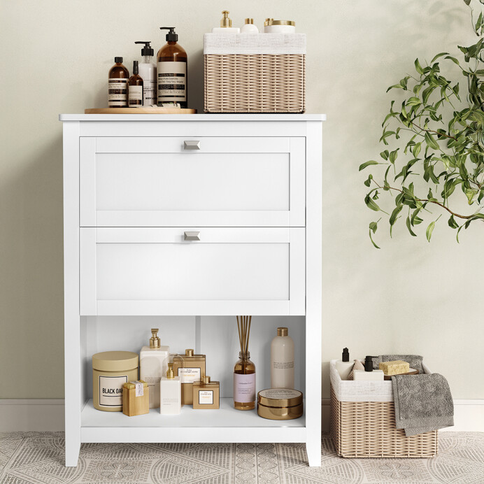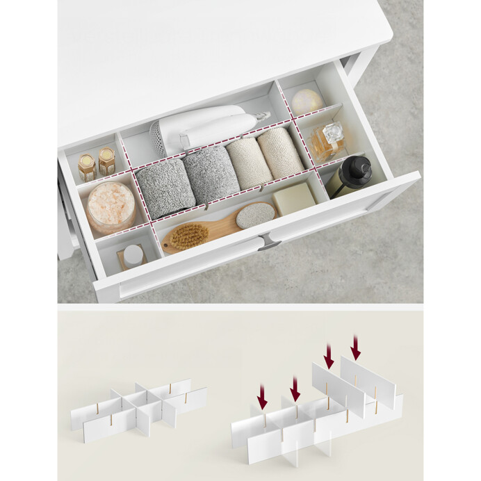 Kúpeľňová skrinka v oblátkovo bielej farbe je vyrobená z MDF dosiek s hladkým povrchom, ktorý sa ľahko udržiava. Ponúka praktický úložný priestor vo forme dvoch zásuviek s decentnými kovovými úchytkami a otvoreného priestoru s dvoma košíkmi z prírodnej ľanovej tkaniny a plastu, ktoré umožňujú organizáciu drobných predmetov. Stabilné nožičky zabezpečujú pevnosť a odolnosť nábytku, zatiaľ čo kompaktné rozmery 60 × 30 × 80 cm umožňujú umiestnenie aj do menších priestorov. Skrinka kombinuje funkčnosť s jednoduchým dizajnom vhodným do moderných kúpeľní.