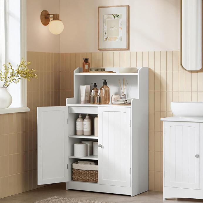 Kúpeľňová skrinka v oblátkovo bielom prevedení je vyrobená z MDF materiálu, ktorý je navrhnutý pre dlhú životnosť a jednoduchú údržbu. Kompaktné rozmery 60x30x100 cm umožňujú efektívne využitie priestoru aj v menších kúpeľniach. Skrinka ponúka praktický úložný priestor za dvierkami s decentnými kovovými úchytkami a otvorenú poličku hore pre ľahký prístup k často používaným predmetom. Zaoblené hrany a jednoduchý dizajn prispievajú k bezpečnosti a estetickému zladiu s moderným aj klasickým interiérom. Stabilné prevedenie zabezpečuje pevnosť a spoľahlivosť pri každodennom používaní.