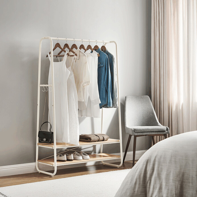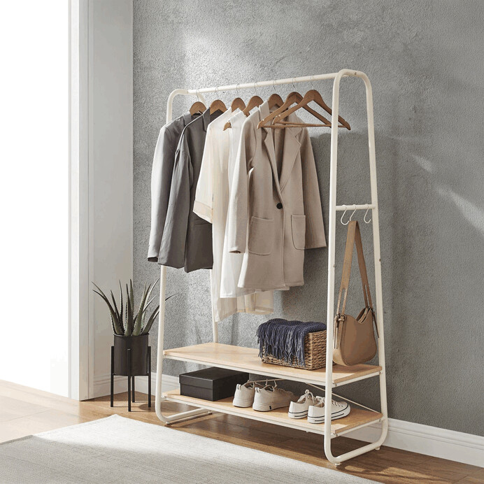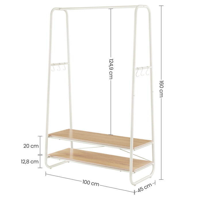 Vešiak s dvoma policami v bielom prevedení kombinuje pevnú kovovú konštrukciu s praktickými policami z MDF s dubovým dekorom, ktoré poskytujú dostatok úložného priestoru na obuv alebo doplnky. Stabilný rám je navrhnutý v nadčasovom dizajne s oblými hranami, čo zabezpečuje bezpečné a pohodlné používanie. Horná časť vešiaka ponúka dostatočnú dĺžku na zavesenie odevov na ramienka, zatiaľ čo po stranách sú umiestnené kovové háčiky na zavesenie menších predmetov. Povrchová úprava kovu je hladká a ľahko udržiavateľná, čo prispieva k dlhej životnosti produktu. Rozmery a nosnosť zodpovedajú bežným požiadavkám na domáce aj komerčné použitie.