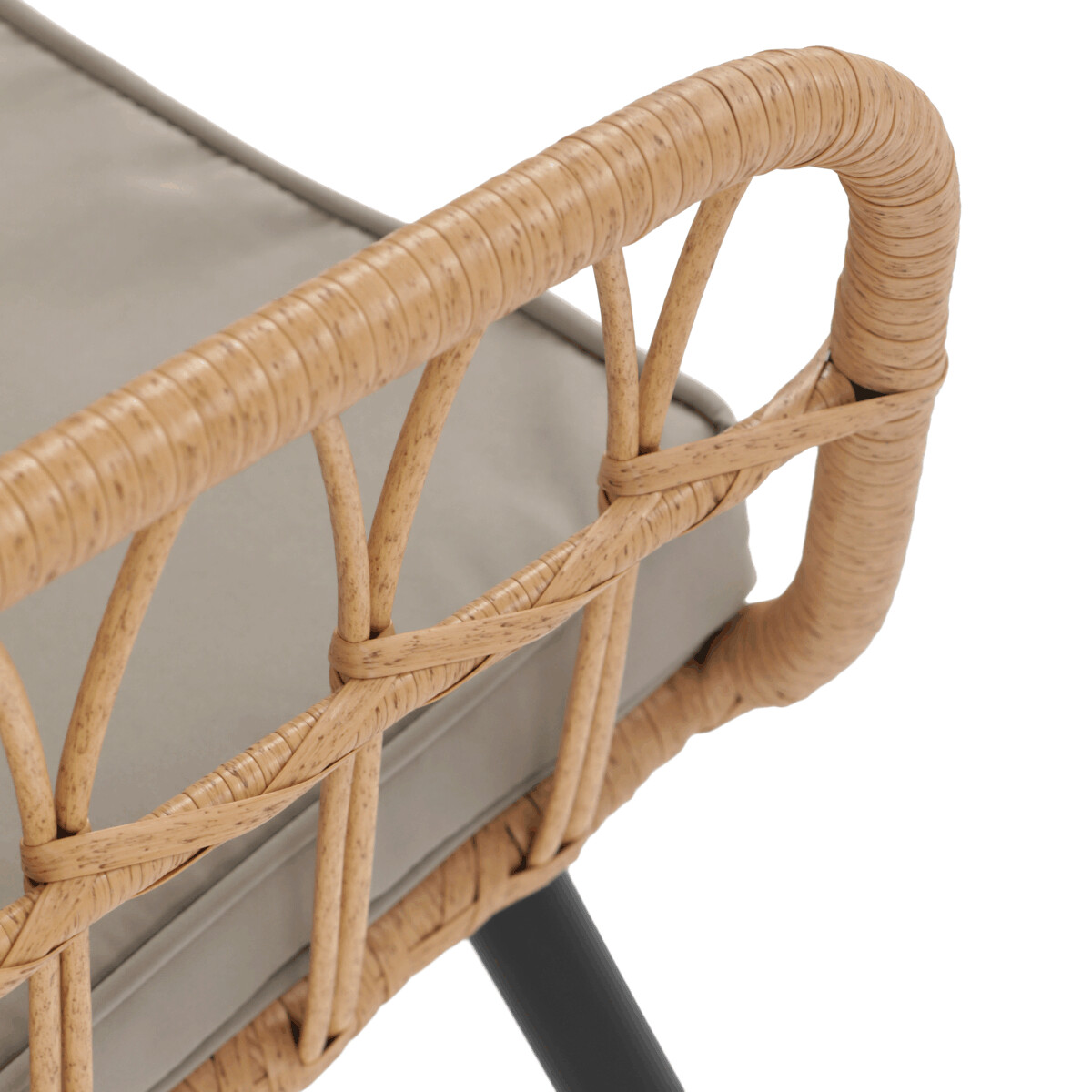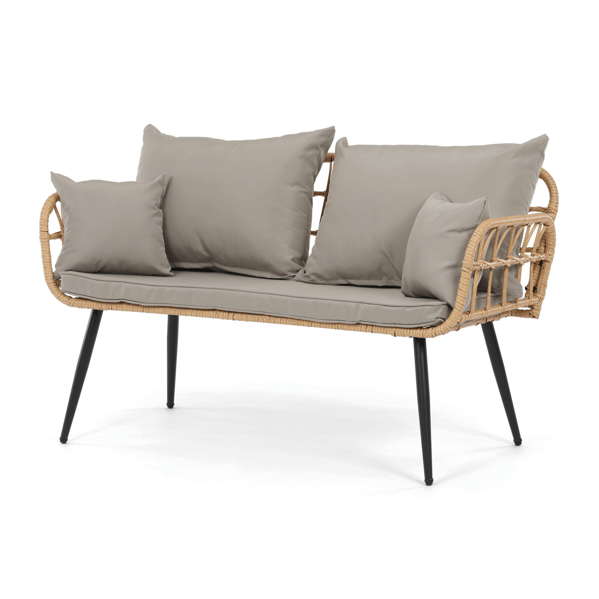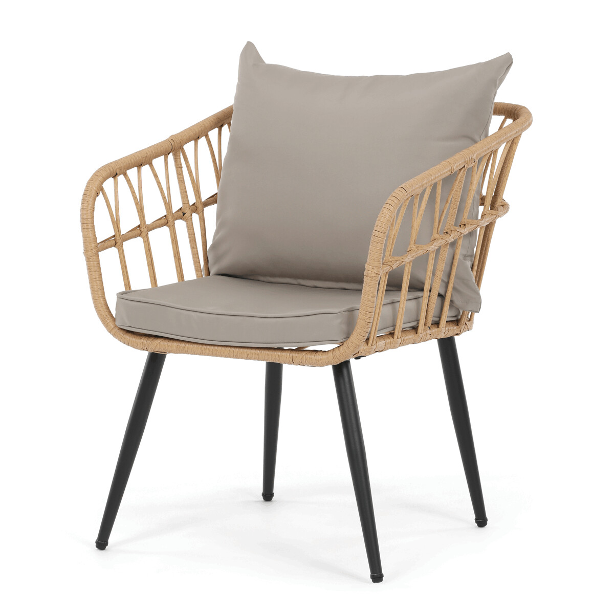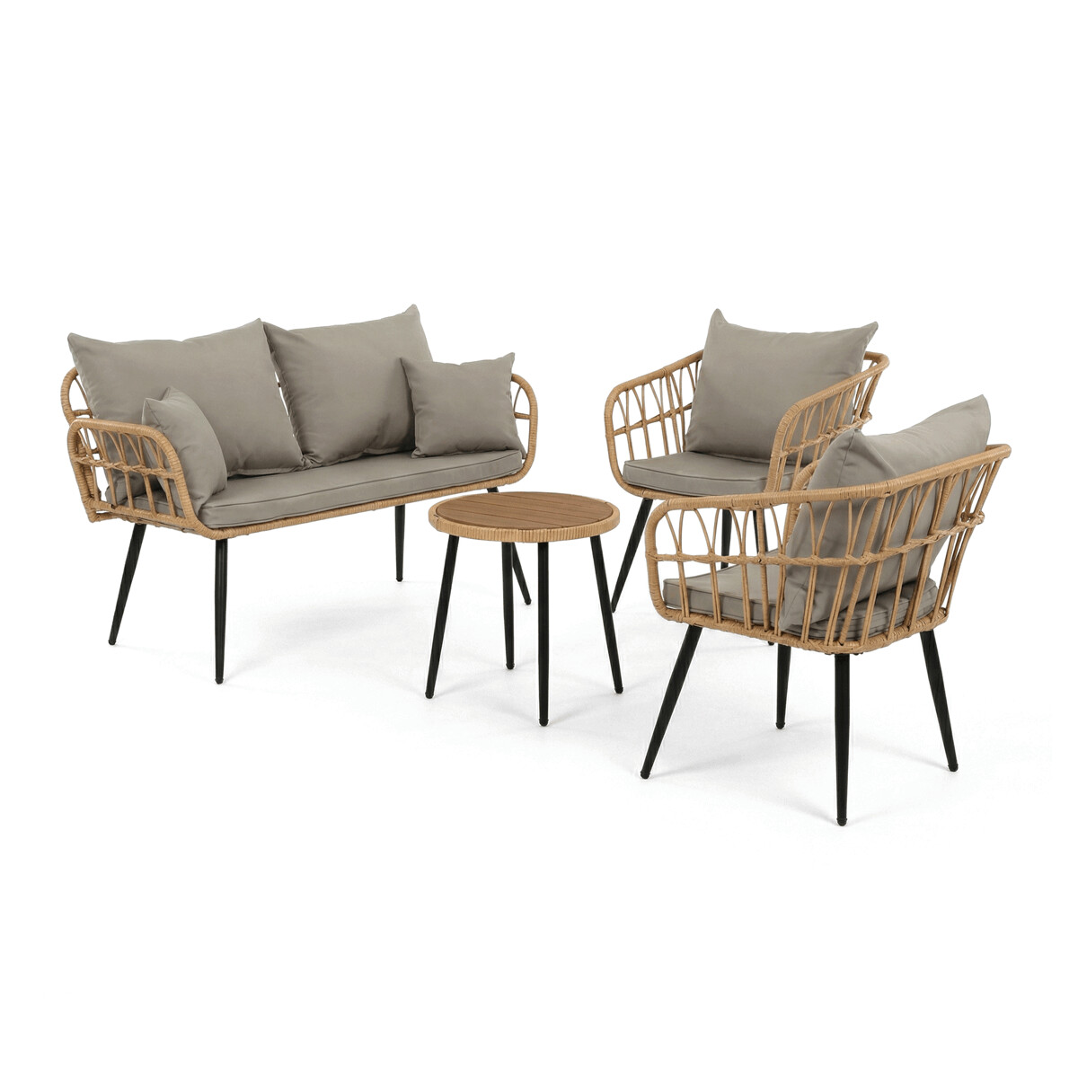 Záhradná sedacia súprava AZ-F1508 NAT kombinuje pevnú kovovú konštrukciu v čiernej farbe s odolným umelým ratanom v béžovom odtieni a polywoodovou doskou stolíka, ktorá je navrhnutá pre dlhodobé vonkajšie použitie. Súprava pozostáva z pohodlnej dvojmiestnej pohovky a dvoch samostatných kresiel, všetkých vybavených vodeodolnými sivými vankúšmi, ktoré zabezpečujú komfort aj pri vonkajšom posedení. Kovové nohy s práškovým lakom prispievajú k stabilite a odolnosti voči poveternostným vplyvom, zatiaľ čo ľahko otvorená konštrukcia operadiel a podrúčok podporuje vzdušnosť a moderný vzhľad. Polywoodová doska stolíka je ľahko udržiavateľná a dopĺňa celkový dizajn súpravy, ktorá je ideálna na relaxáciu na terase či záhrade. Nosnosť jednotlivých sedadiel zodpovedá štandardným požiadavkám pre vonkajší nábytok, čo zaručuje bezpečné a pohodlné používanie.