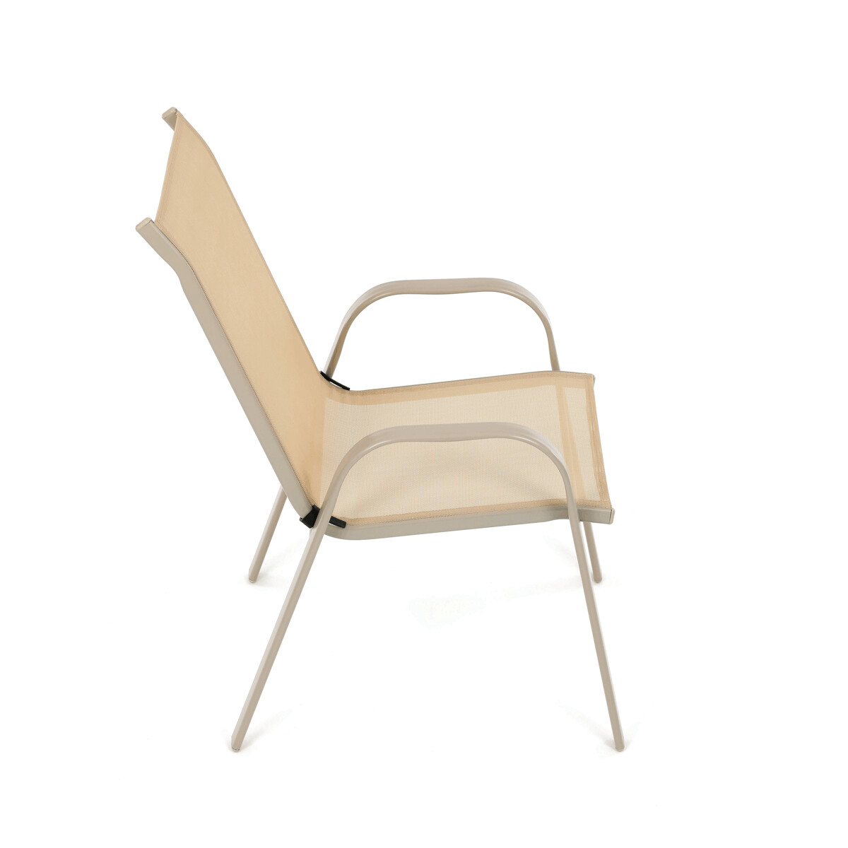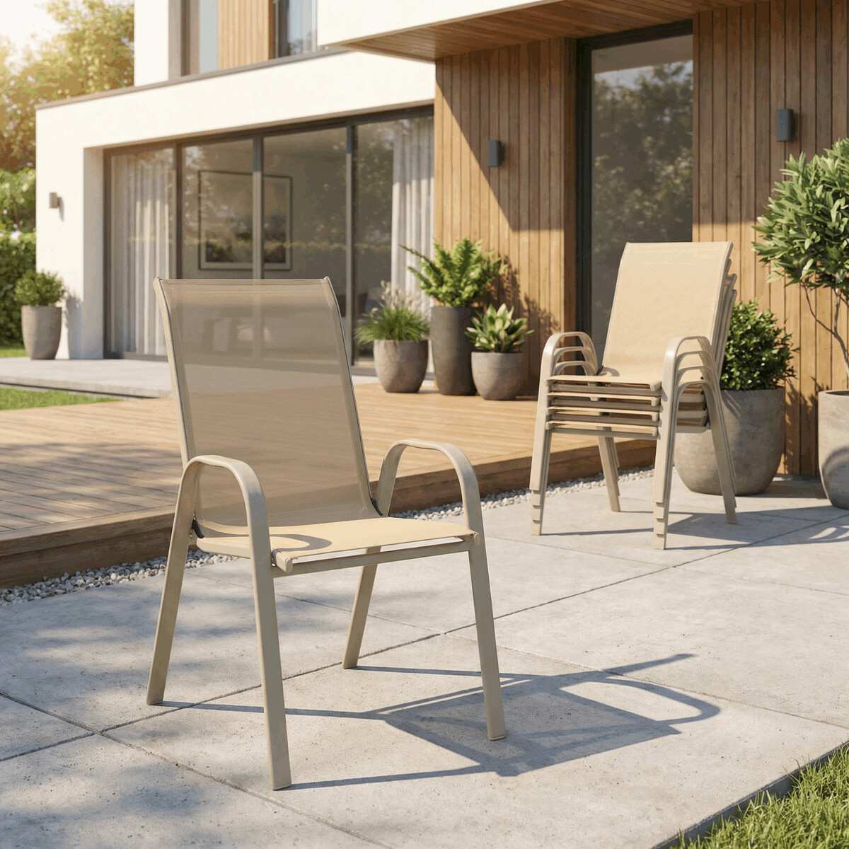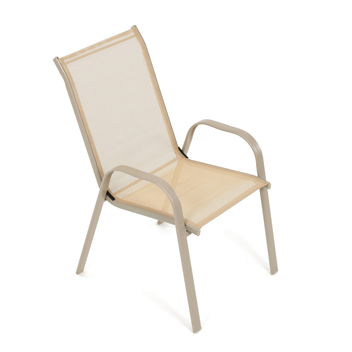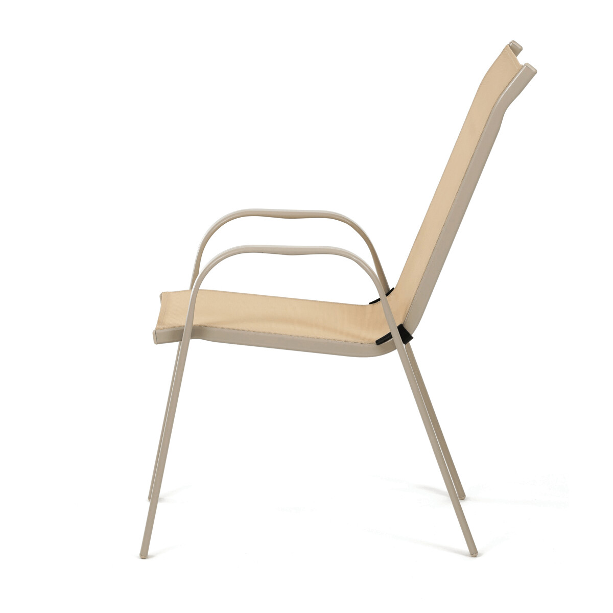 Záhradná stolička v krémovom prevedení kombinuje pevný kovový rám so sedadlom a operadlom z krémovej sieťoviny, ktoré zaisťujú pohodlné posedenie vonku. Konštrukcia je navrhnutá tak, aby bola stohovateľná, čo uľahčuje skladovanie a manipuláciu pri sezónnom ukladaní. Kovová podnož je opatrená práškovým lakom, ktorý chráni proti poveternostným vplyvom a zaisťuje dlhú životnosť. Ergonomický tvar operadla podporuje správne držanie tela počas odpočinku. Rozmery a nosnosť zodpovedajú bežným štandardom záhradného nábytku, čo umožňuje univerzálne použitie na terasách, balkónoch aj záhradách.