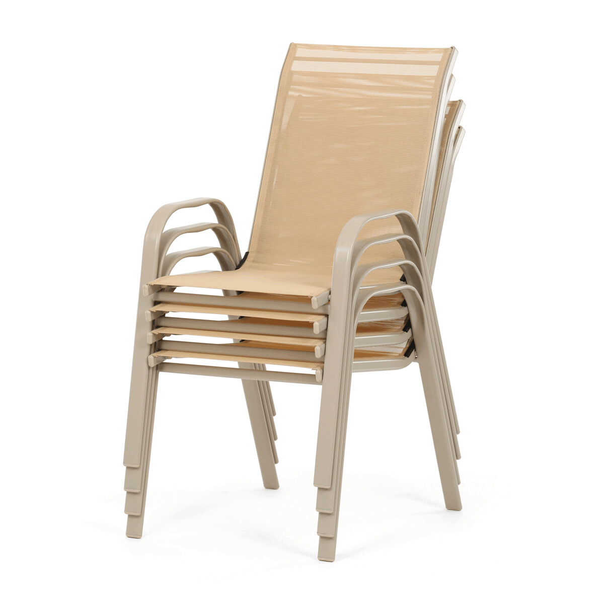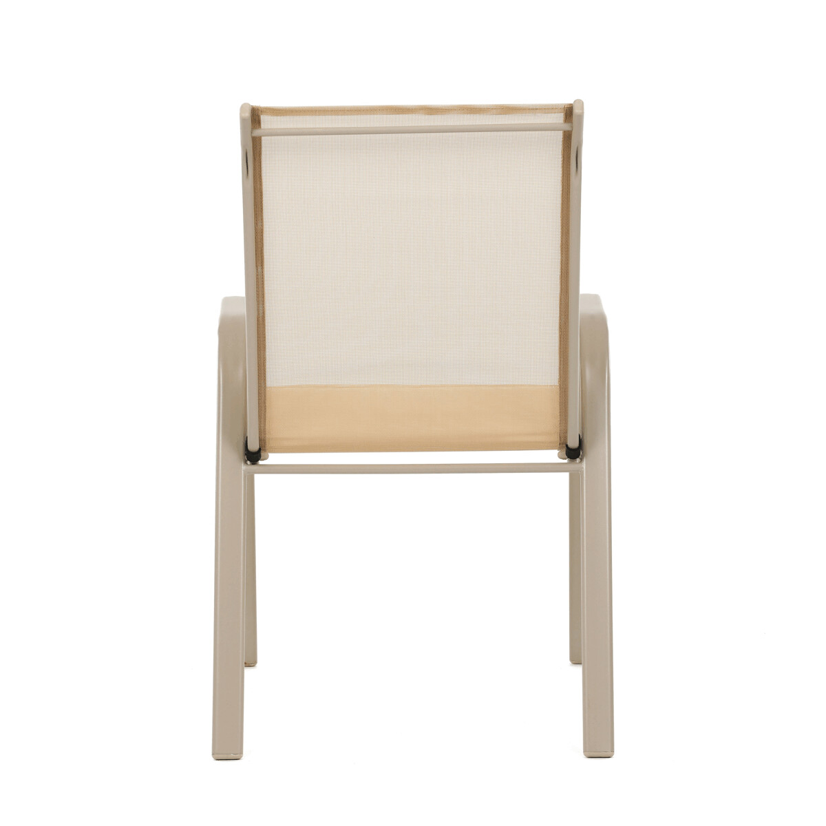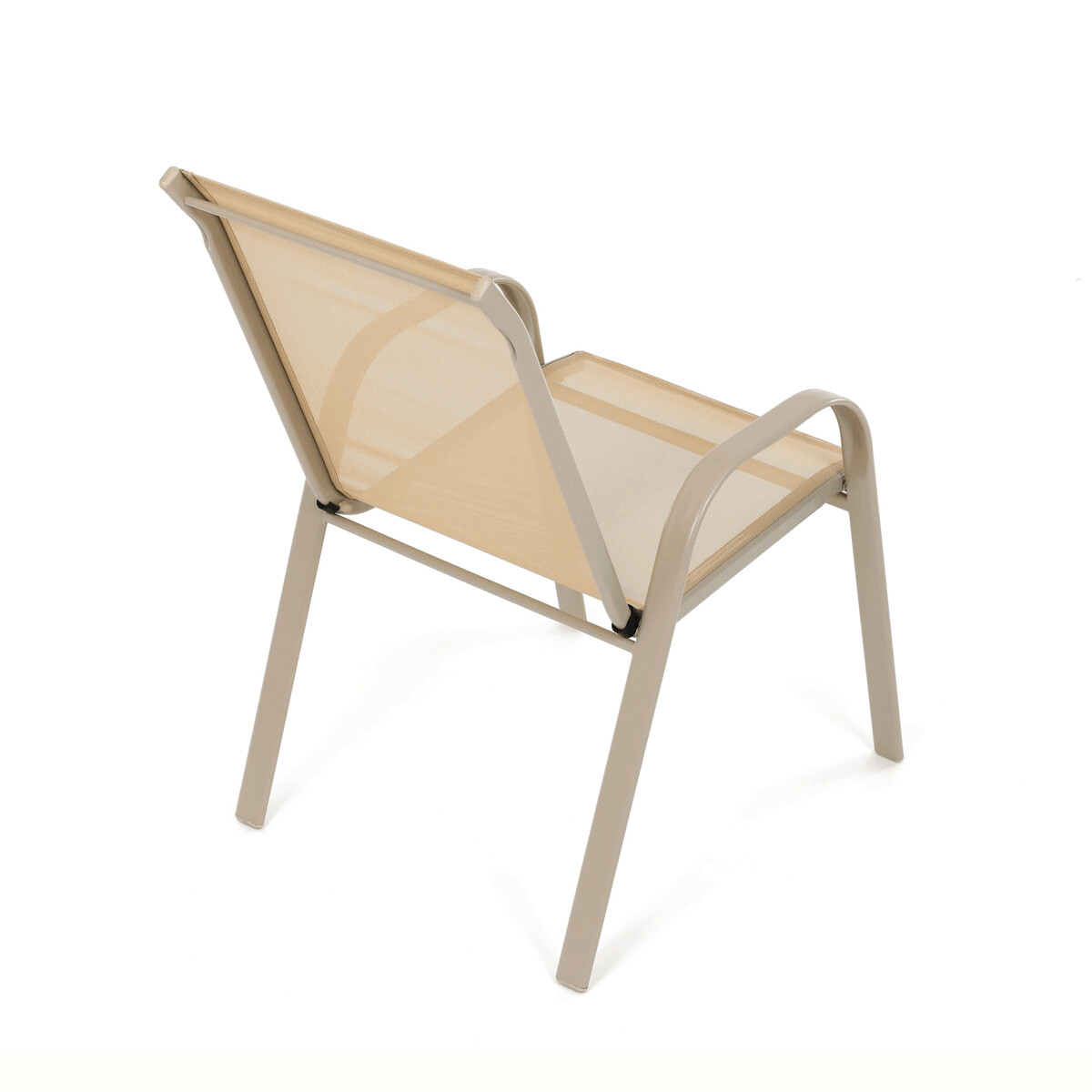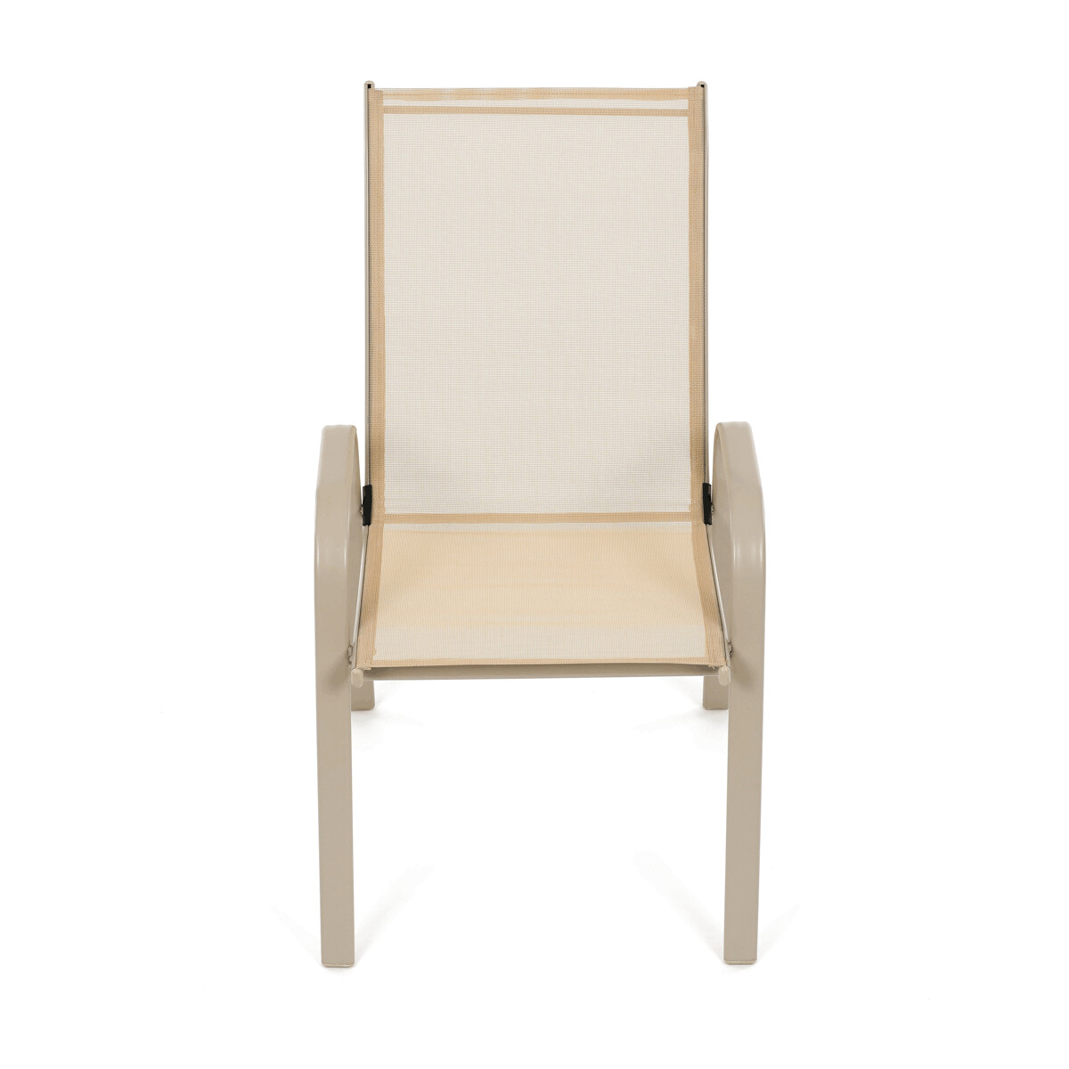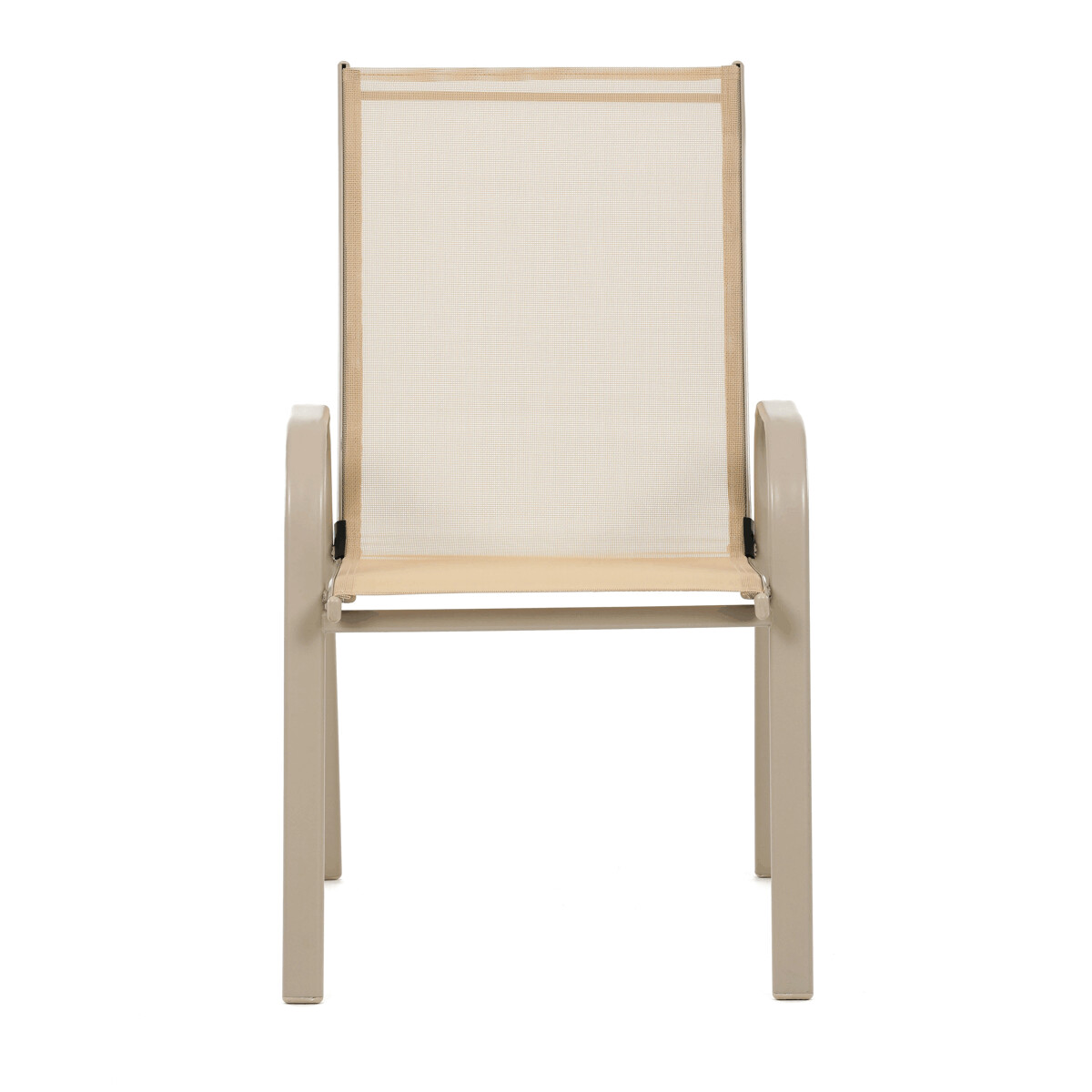 Záhradná stolička v krémovom prevedení kombinuje pevný kovový rám so sedadlom a operadlom z krémovej sieťoviny, ktoré zaisťujú pohodlné posedenie vonku. Konštrukcia je navrhnutá tak, aby bola stohovateľná, čo uľahčuje skladovanie a manipuláciu pri sezónnom ukladaní. Kovová podnož je opatrená práškovým lakom, ktorý chráni proti poveternostným vplyvom a zaisťuje dlhú životnosť. Ergonomický tvar operadla podporuje správne držanie tela počas odpočinku. Rozmery a nosnosť zodpovedajú bežným štandardom záhradného nábytku, čo umožňuje univerzálne použitie na terasách, balkónoch aj záhradách.