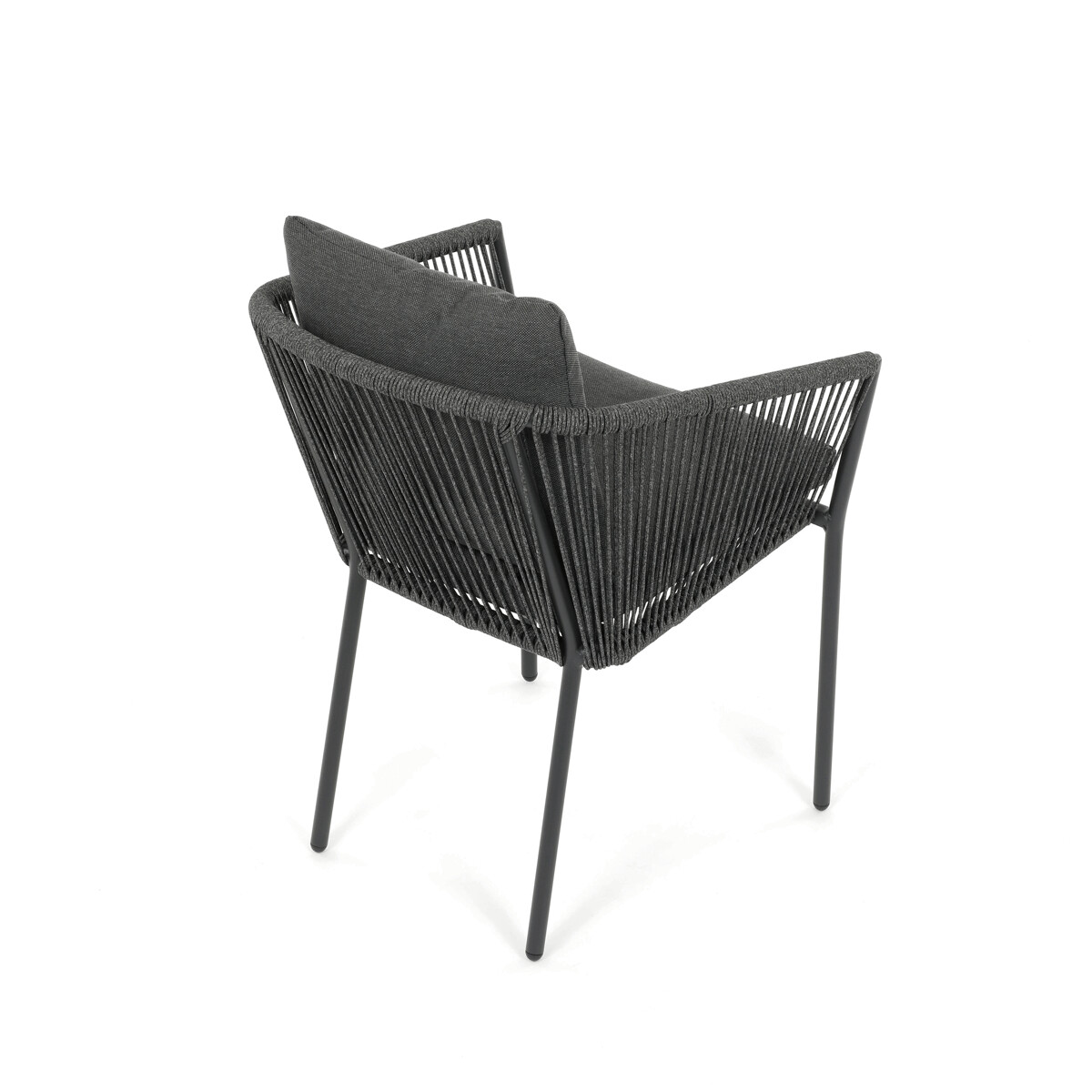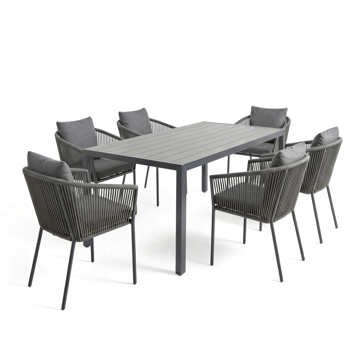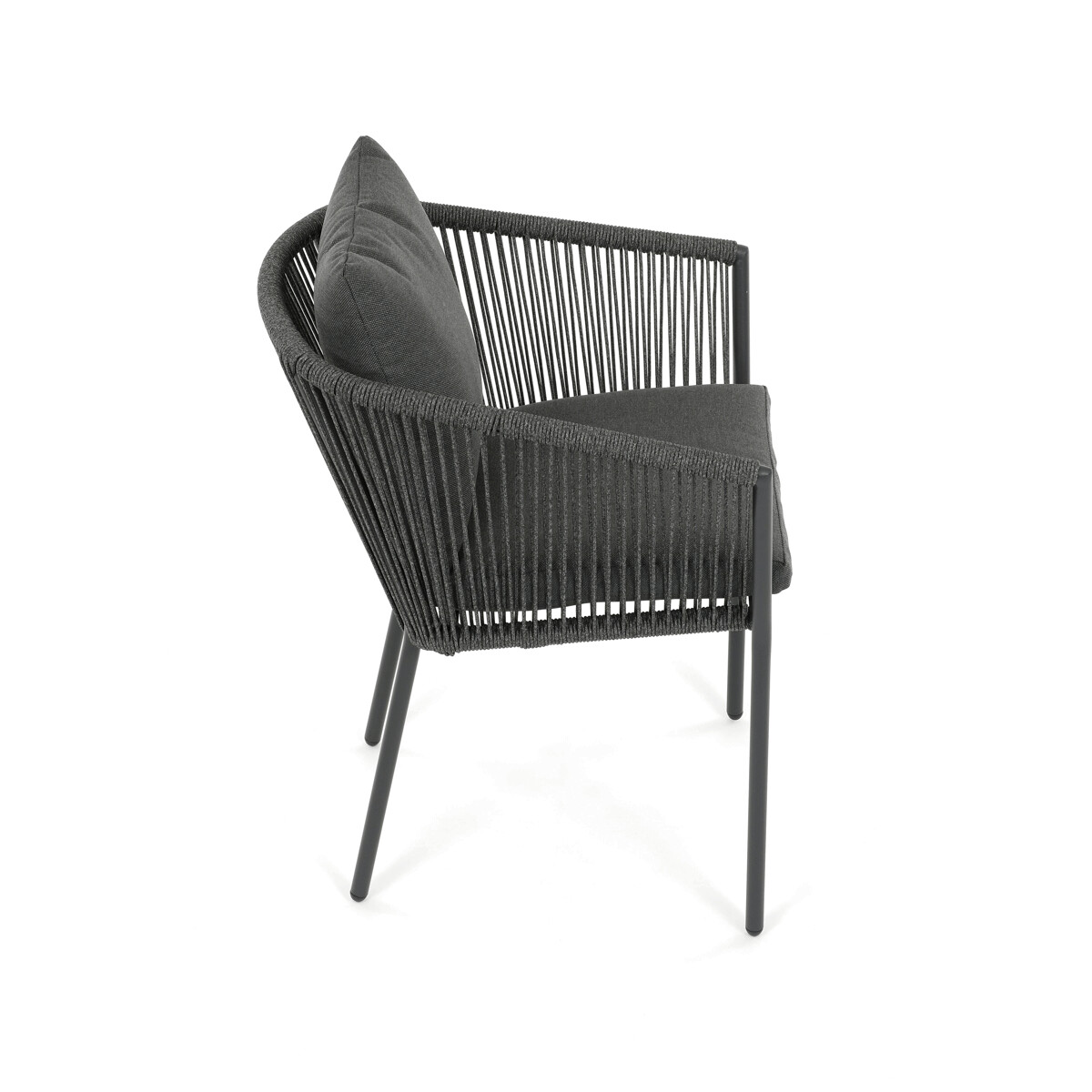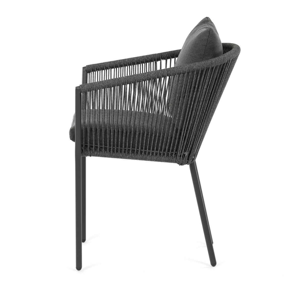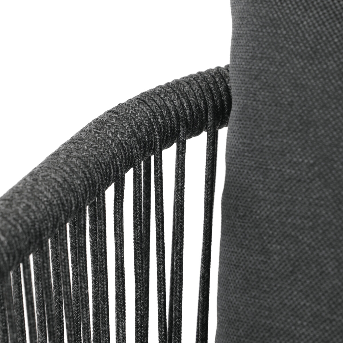 Záhradná stolička s pevným hliníkovým rámom v šedom odtieni ponúka stabilitu a dlhú životnosť aj pri vonkajšom použití. Operadlo a sedák sú čalúnené rýchloschnúcou šedou látkou, ktorá je vodeodolná a ľahko sa udržiava, čo zabezpečuje komfort aj pri meniacom sa počasí. Dizajn stoličky dopĺňa moderné prevedenie s opletením z odolných vlákien, ktoré prispieva k celkovej pevnosti a vizuálnej ľahkosti. Vďaka ergonomickému tvaru operadla a sedáka poskytuje pohodlné sedenie počas záhradných posedení. Nosnosť stoličky zodpovedá štandardným požiadavkám pre vonkajší nábytok, čo ju robí vhodnou na každodenné používanie.