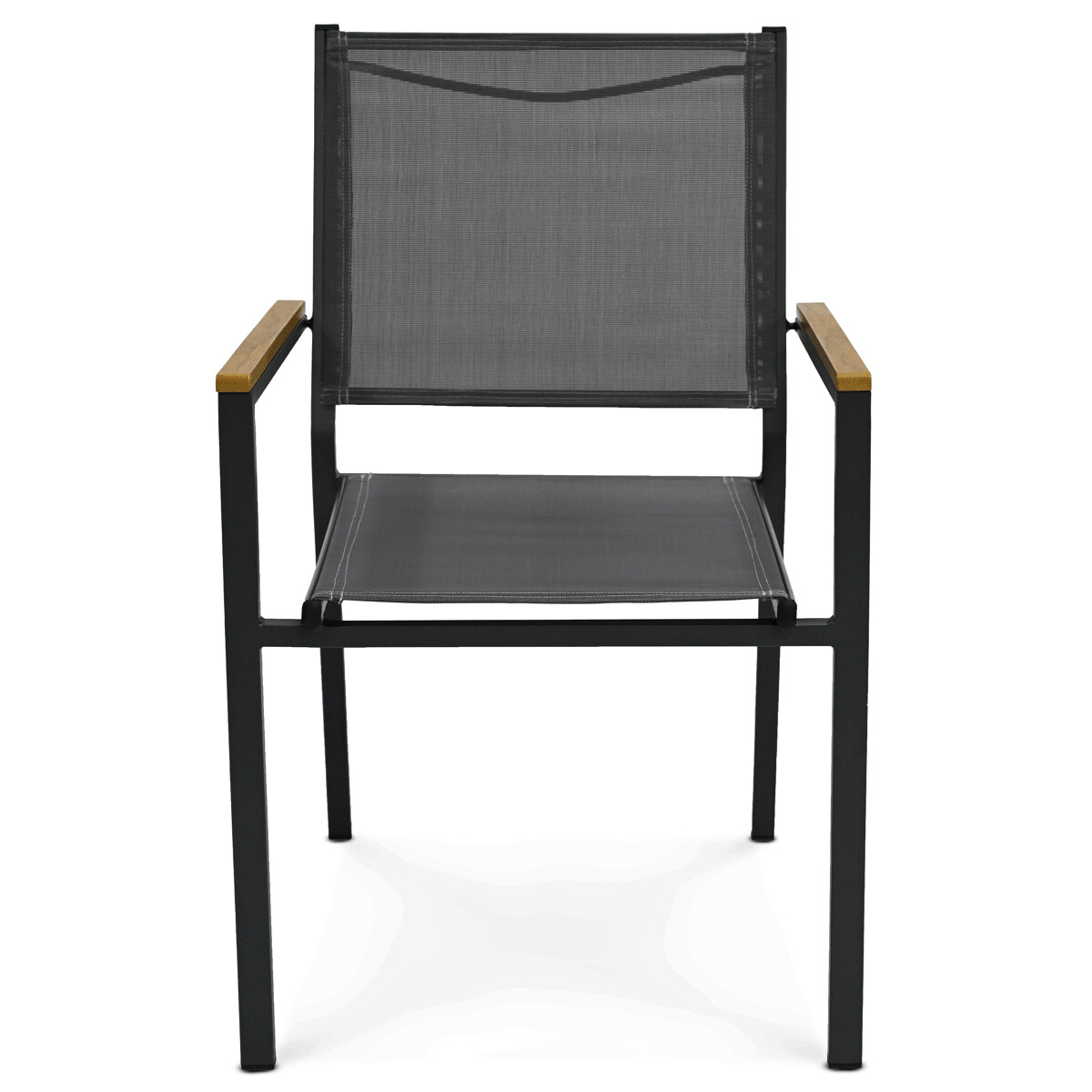 Záhradná stolička s kovovým rámom v sivej farbe ponúka pevné a stabilné prevedenie vhodné pre vonkajšie použitie. Sedák a operadlo sú potiahnuté odolnou textíliou, ktorá zabezpečuje pohodlie a jednoduchú údržbu. Prírodné polywoodové podrúčky pridávajú stoličke príjemný estetický kontrast a zároveň komfort pri sedení. Vďaka možnosti stohovania je stolička praktická na skladovanie a úsporu miesta. Je ideálnou voľbou pre záhradné posedenie, terasy či balkóny.