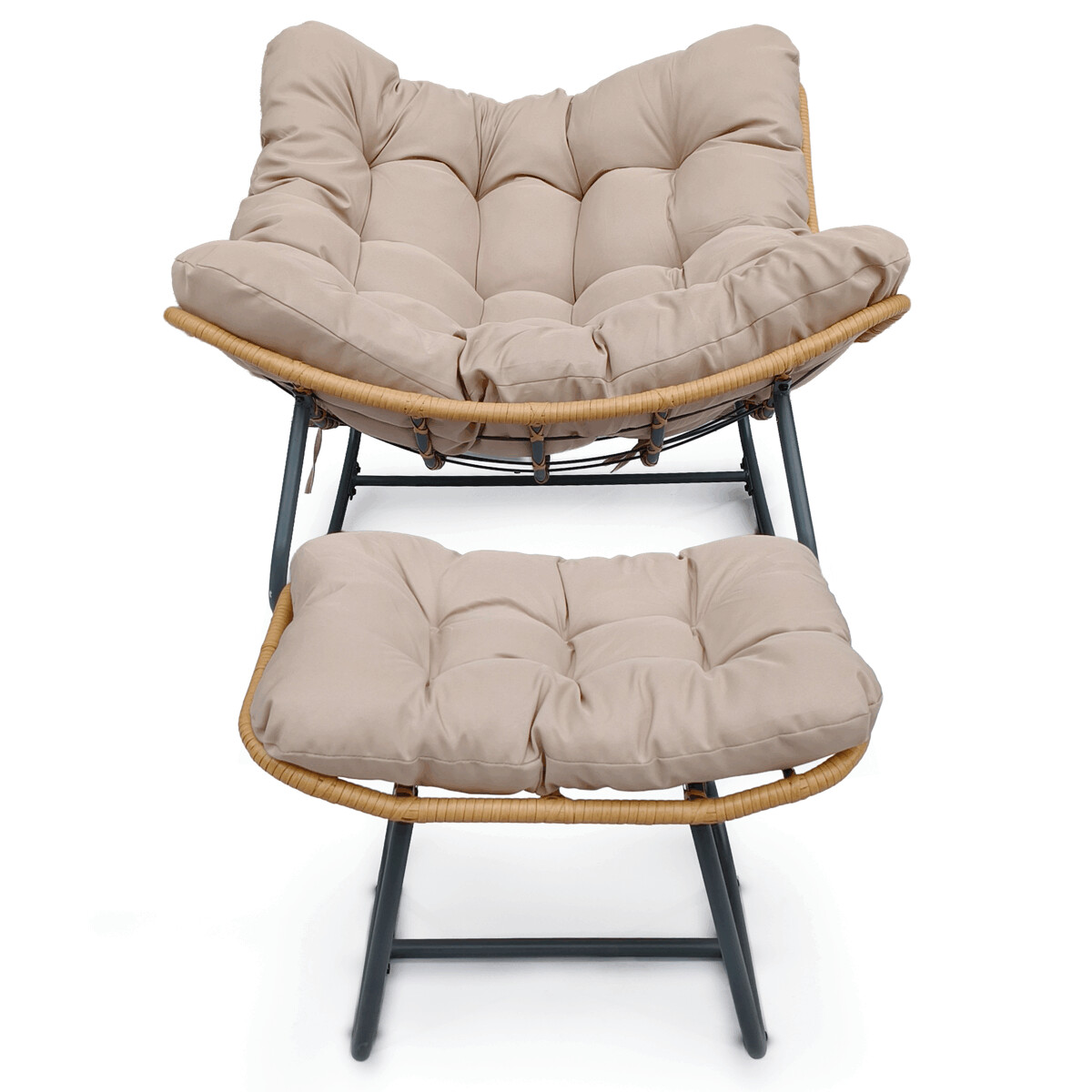 Záhradné hojdacie kreslo s podnožkou v krémovom odtieni kombinuje pevný kovový rám s ľahkým polyratanovým opletením, ktoré dodáva celku príjemnú vizuálnu ľahkosť. Silné polstrovanie z béžovej látky zabezpečuje pohodlné sedenie a oporu, zatiaľ čo hojdací mechanizmus umožňuje relaxáciu s jemným pohybom. Konštrukcia nôh je navrhnutá pre stabilitu a jednoduchú manipuláciu, čo oceníte pri presúvaní kresla na balkón či terasu. Vďaka použitým materiálom je kreslo vhodné na vonkajšie použitie s dôrazom na dlhú životnosť a komfort. Rozmery a nosnosť sú prispôsobené bežným potrebám záhradného nábytku.