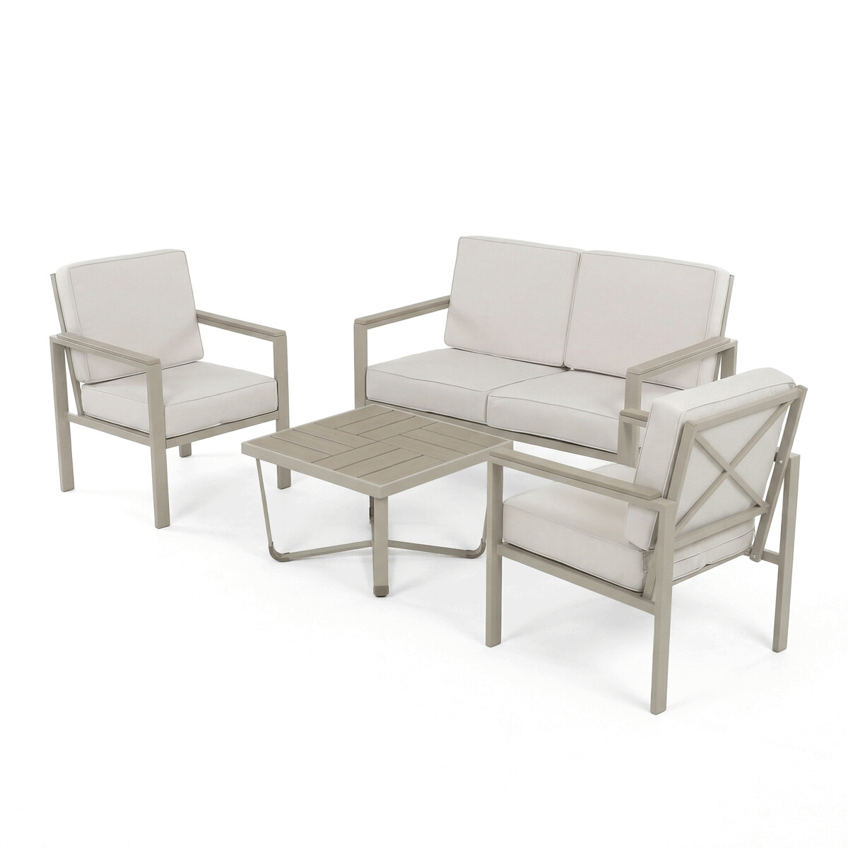 Záhradná zostava v béžovom prevedení kombinuje pevný kovový rám s pohodlnými sedákmi potiahnutými odolnou látkou v béžovej farbe. Dosky stolíka aj podrúčky sú vyrobené z polywoodu, materiálu známeho svojou vysokou odolnosťou voči poveternostným vplyvom a ľahkou údržbou. Konštrukcia zostavy je navrhnutá tak, aby poskytovala stabilitu a komfort pri vonkajšom posedení, pričom polstrovanie zabezpečuje pohodlné sedenie aj počas dlhšieho používania. Súčasťou sú dve samostatné kreslá a dvojmiestna pohovka, ktoré spolu s praktickým stolíkom vytvárajú ideálny priestor na relaxáciu na záhrade či terase. Celkový dizajn je jednoduchý a moderný, vhodný pre rôzne vonkajšie priestory.