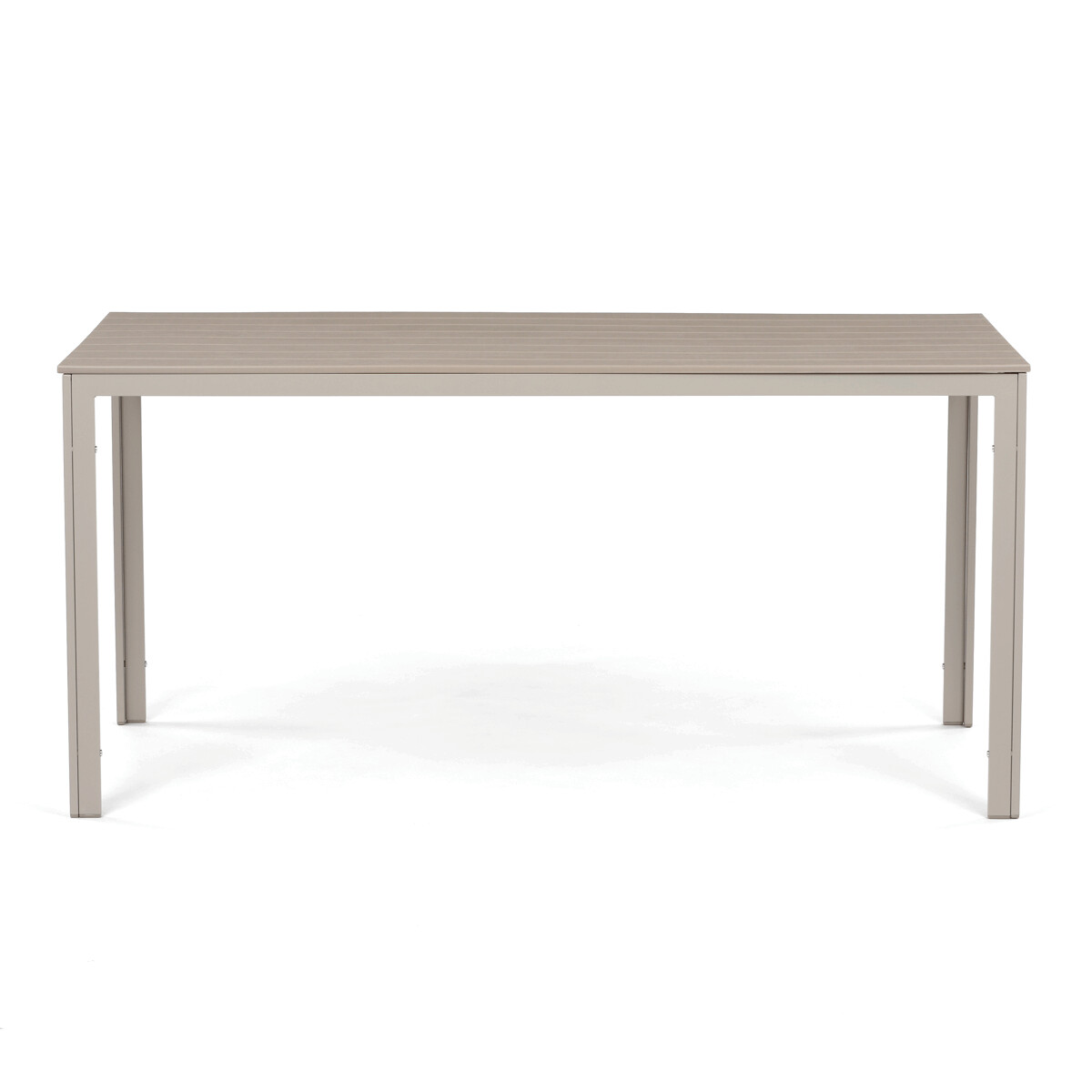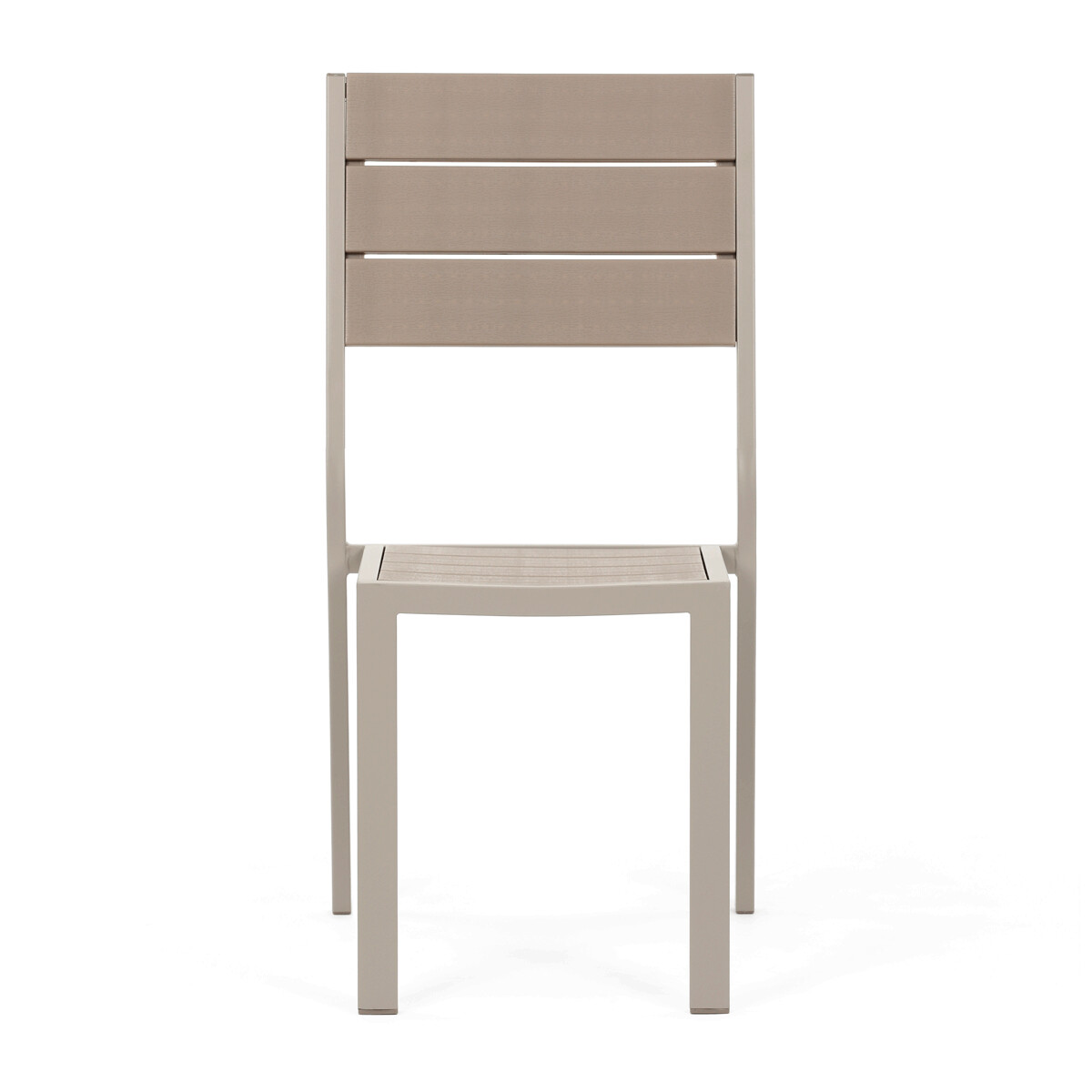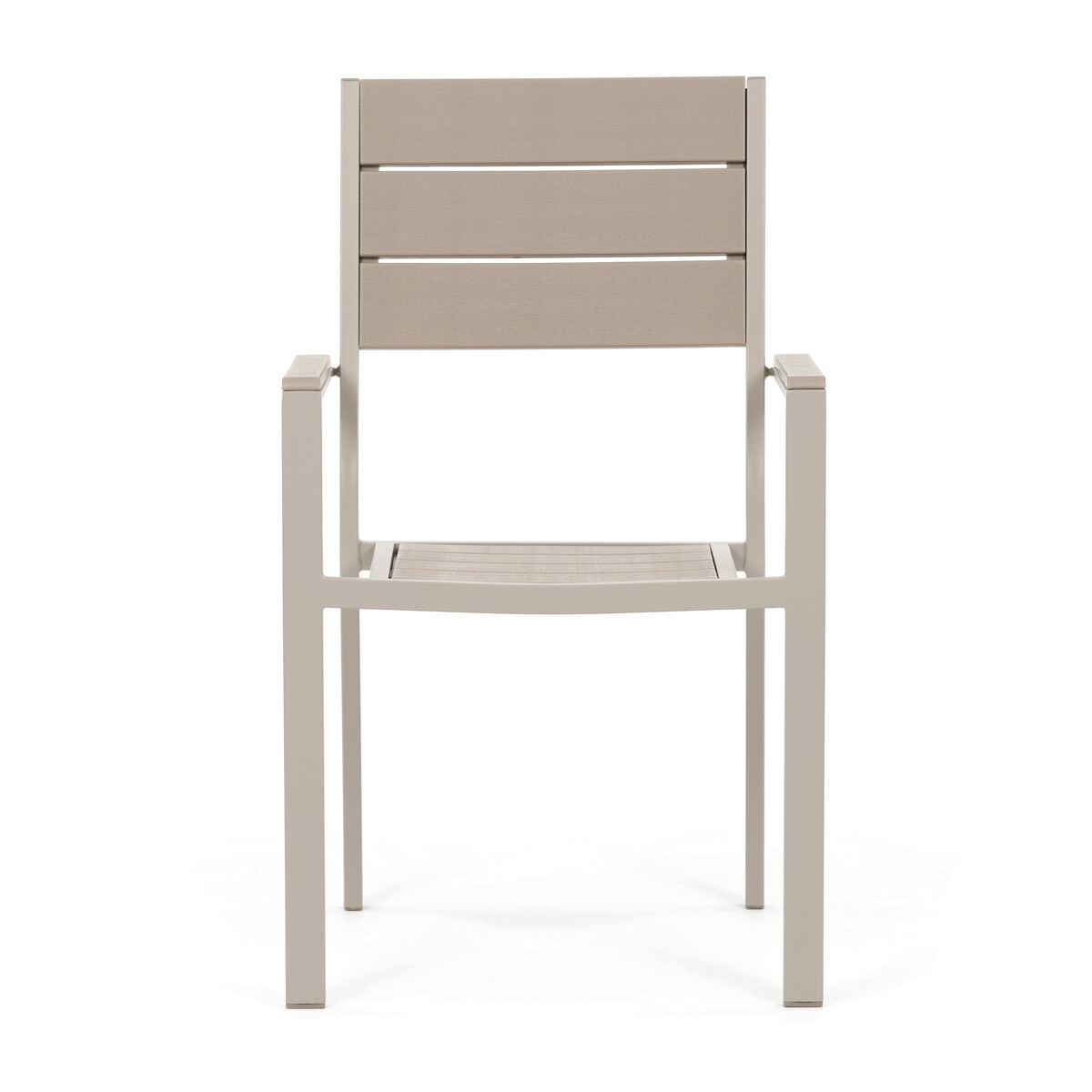 Záhradná zostava AZS-B1656 CRM ponúka praktické a pevné riešenie pre vonkajšie posedenie. Stôl s rozmermi 156 × 78 cm má dosku z polywoodu, materiálu odolného voči poveternostným vplyvom a ľahko udržiavateľného, ktorý verne napodobňuje vzhľad dreva. Rám stola aj stoličiek je vyrobený z kovu v béžovom odtieni s práškovo nanesenou povrchovou úpravou, ktorá zabezpečuje stabilitu a dlhú životnosť. Sada obsahuje šesť stoličiek, z ktorých dve majú operadlá a podrúčky pre pohodlnejšie sedenie, zatiaľ čo ostatné sú bez podrúčok, čo umožňuje variabilné usporiadanie. Dizajn s vodorovnými lamelami na sedadlách a operadlách podčiarkuje moderný a zároveň nadčasový vzhľad celej zostavy.