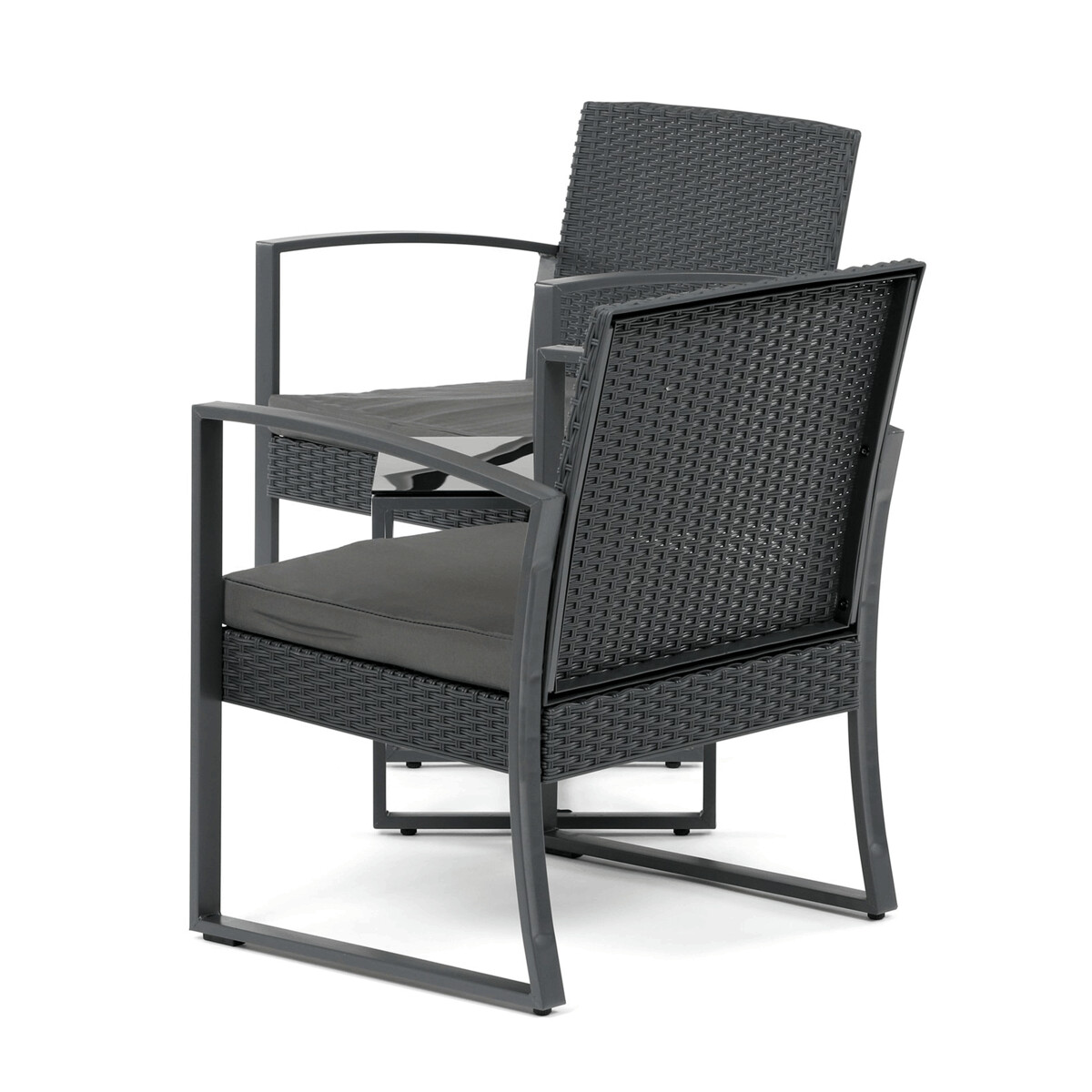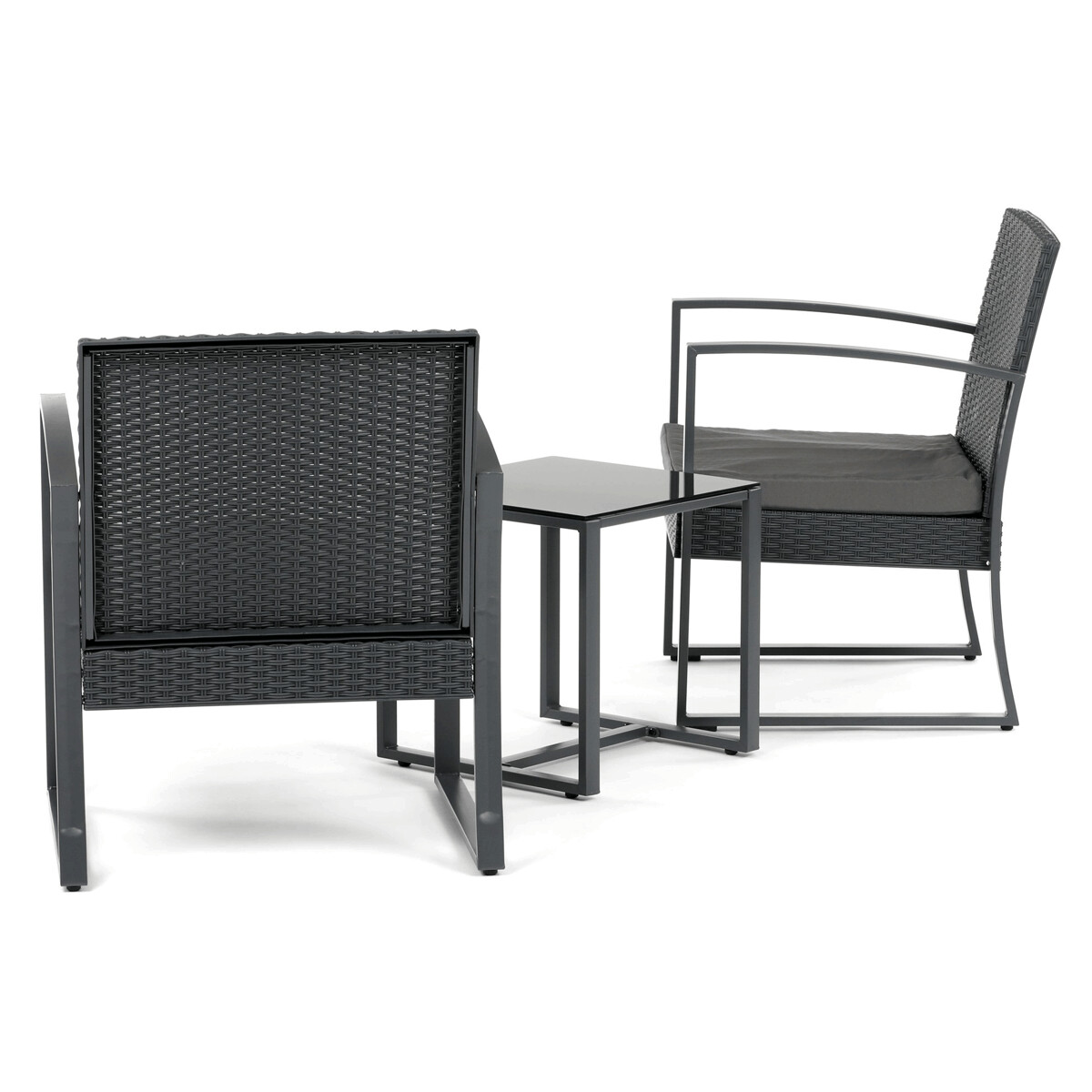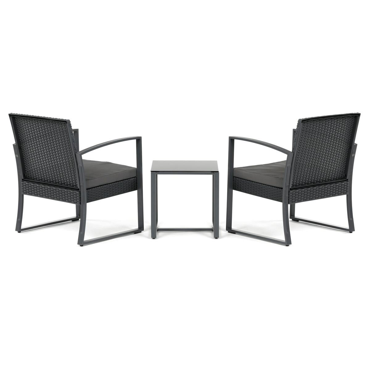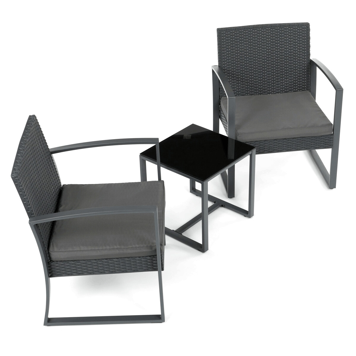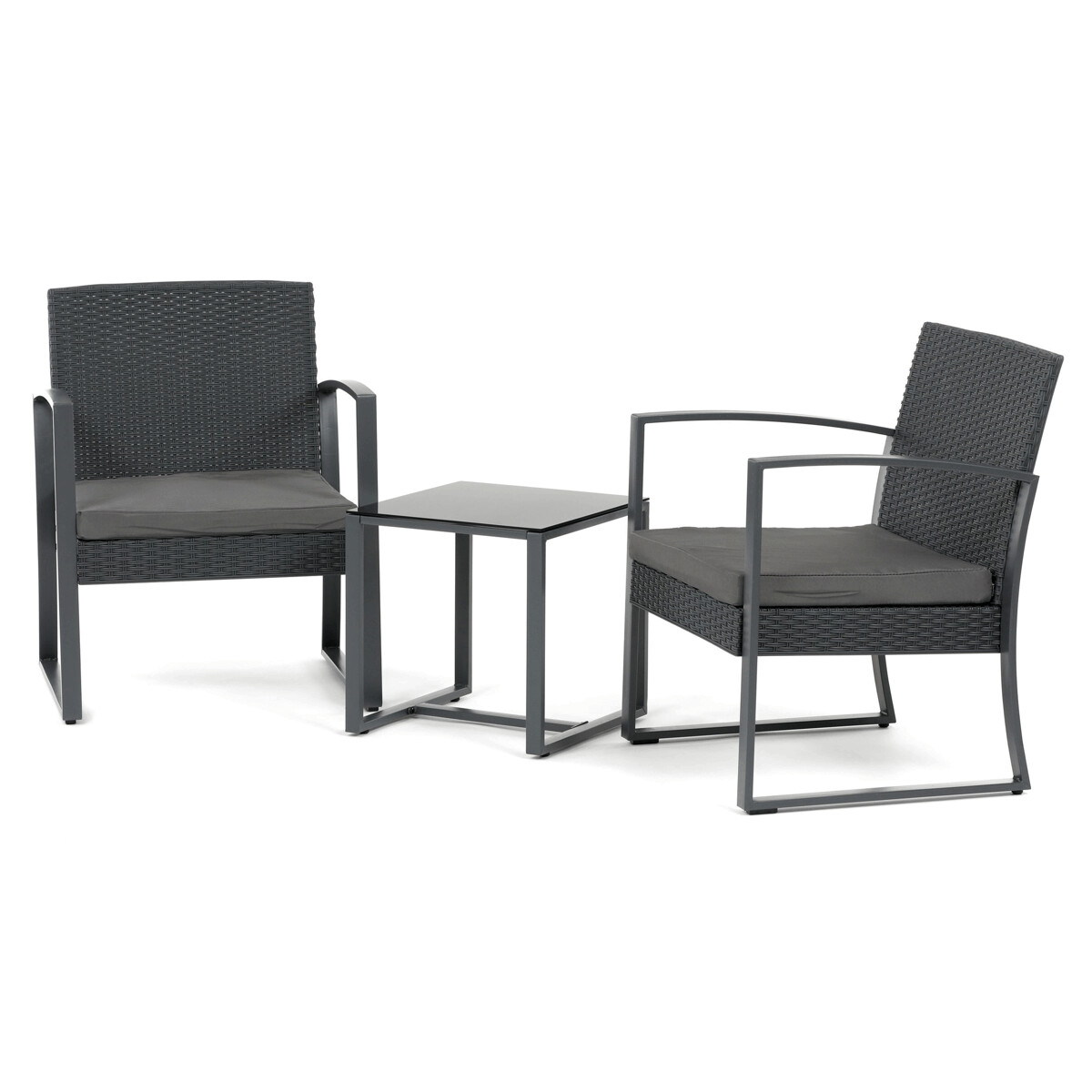 Záhradný set 1+2 v šedom prevedení kombinuje pevnú kovovú konštrukciu s odolným polyratanom, ktorý je vhodný na vonkajšie použitie. Súčasťou sú dve pohodlné kreslá s polstrovanými sedákmi potiahnutými šedou látkou, ktoré zabezpečujú komfortné posedenie. Stolová doska je vyrobená z čierneho tvrdeného skla, ktoré sa ľahko udržiava a dodáva celému setu moderný vzhľad. Stabilný rám z kovu zaručuje dlhú životnosť a bezpečnosť pri používaní. Vďaka kompaktným rozmerom je set ideálny na balkóny, terasy či menšie záhrady.