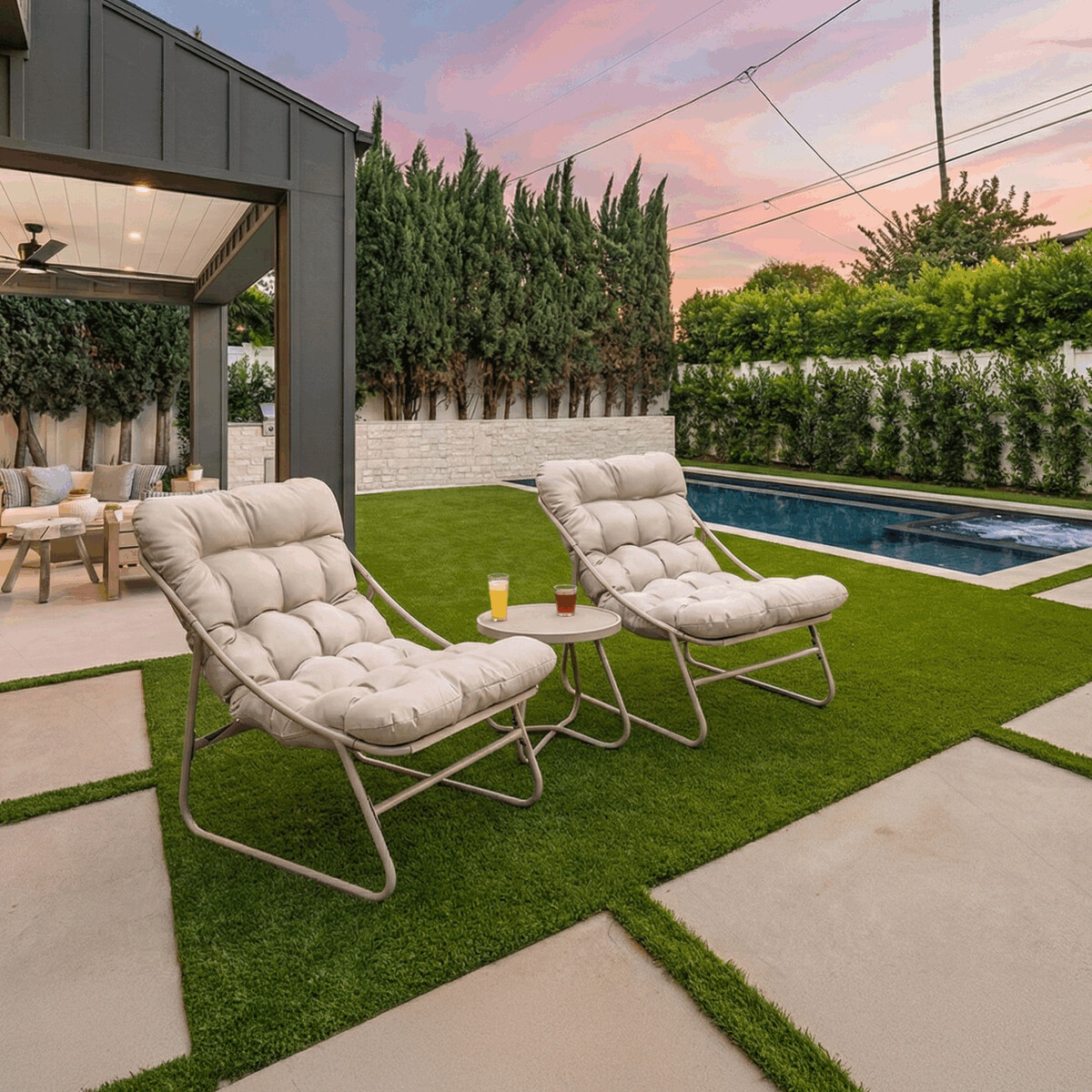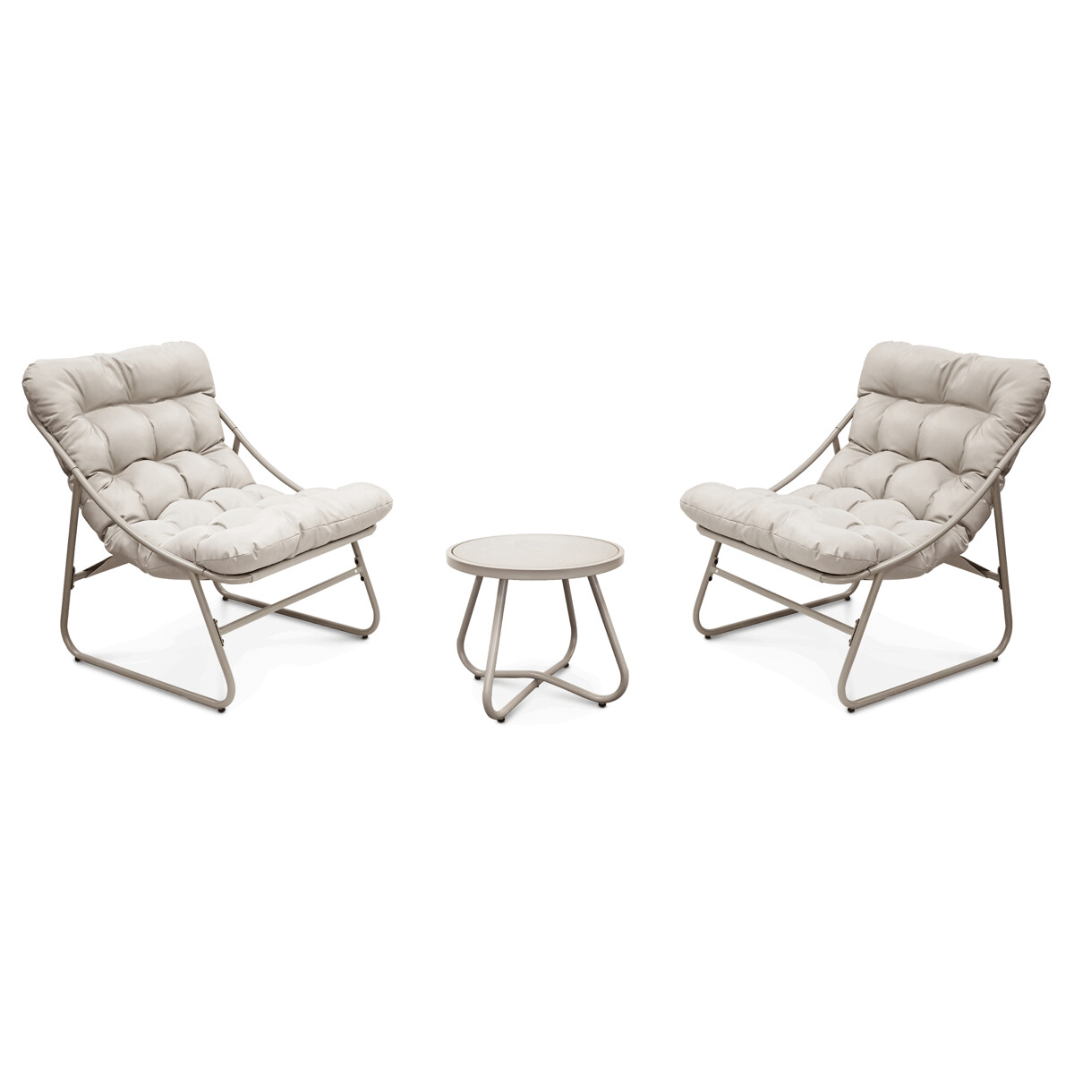 Záhradná zostava 1+2 v krémovom prevedení kombinuje nadčasový dizajn s pevným kovovým rámom, ktorý zabezpečuje stabilitu a dlhú životnosť. Súčasťou sú dve pohodlné kreslá s čalúnením z mäkkej látky, ktorá je príjemná na dotyk a vhodná na vonkajšie použitie. Nízky stolík s doskou z tvrdeného skla ponúka odolný a ľahko udržiavateľný povrch ideálny na odkladanie nápojov či drobných predmetov. Kovové rámy majú jemne zaoblené tvary, ktoré podčiarkujú elegantný a vzdušný vzhľad celej zostavy. Vďaka kompaktným rozmerom je táto zostava vhodná pre menšie terasy, balkóny alebo záhradné kúty.