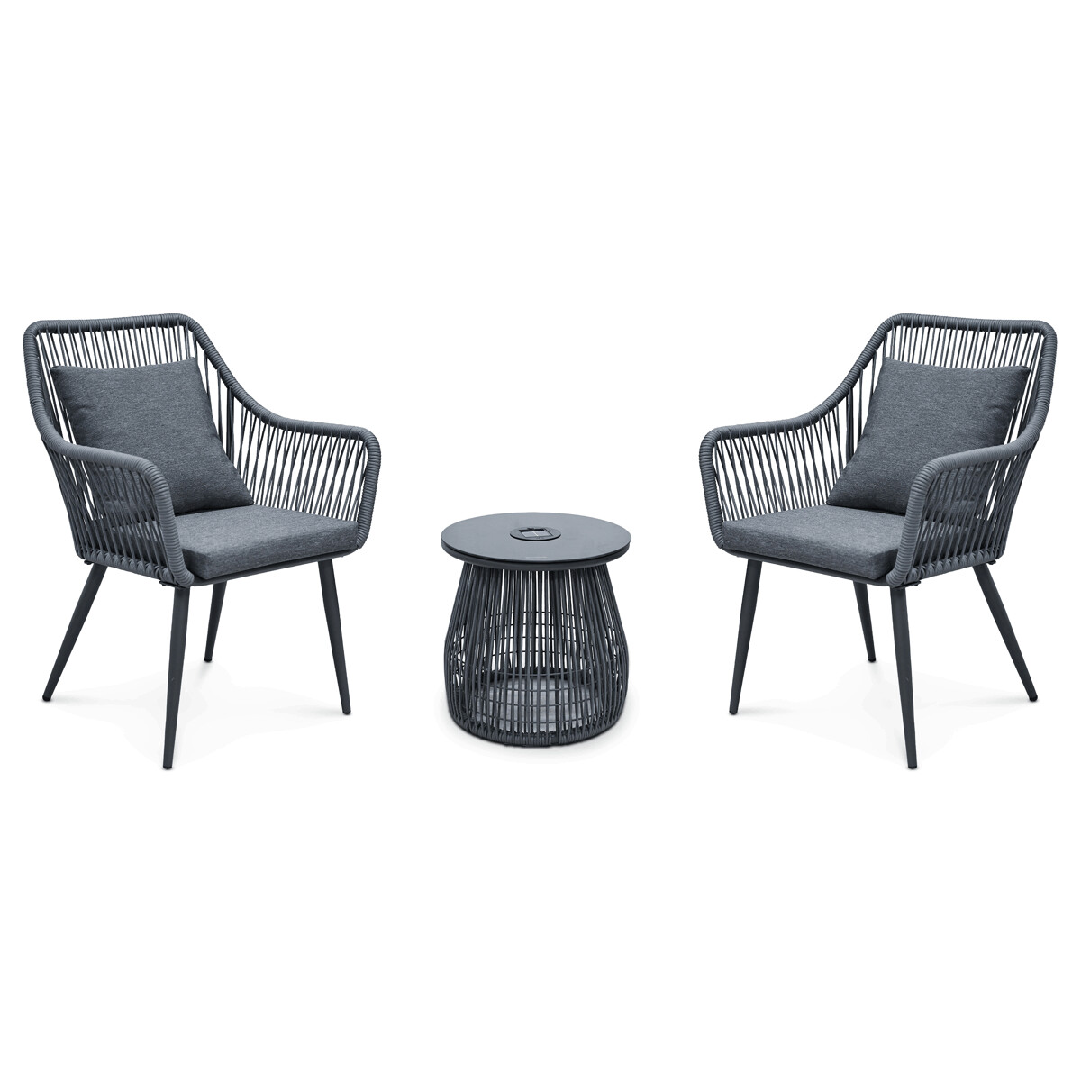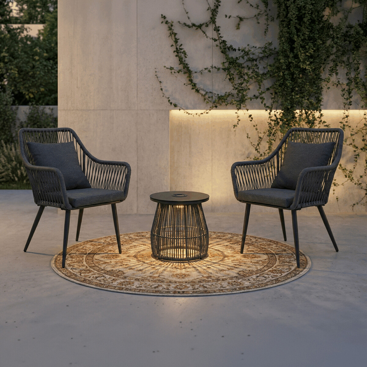 Záhradná zostava 1+2 v sivom prevedení kombinuje pevnú kovovú konštrukciu s komfortným čalúnením z látky, ktorá je navrhnutá pre jednoduchú údržbu a dlhú životnosť. Súčasťou zostavy sú dve pohodlné kreslá s ergonomicky tvarovanými opierkami a mäkkými vankúšmi, ktoré zabezpečujú príjemné posedenie. Stolová doska je vyrobená z tvrdeného skla, ktoré je odolné voči poškriabaniu a ľahko sa čistí. Inovatívne solárne podsvietenie stolíka vytvára príjemnú atmosféru večerného posedenia a zároveň je energeticky úsporné. Celá zostava je ideálna na relaxáciu na terase či záhrade, pričom jej stabilná konštrukcia zaručuje bezpečnosť a nosnosť vhodnú pre bežné používanie.
