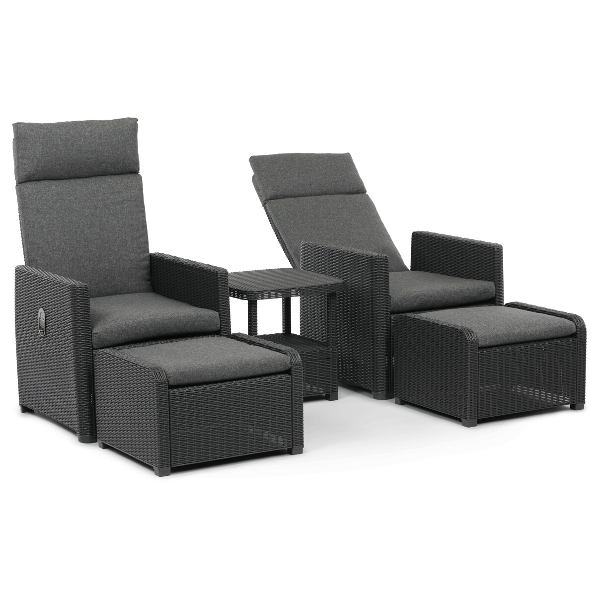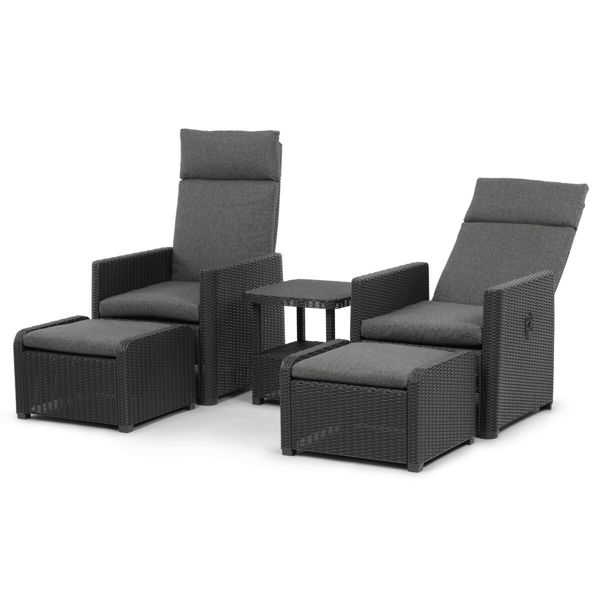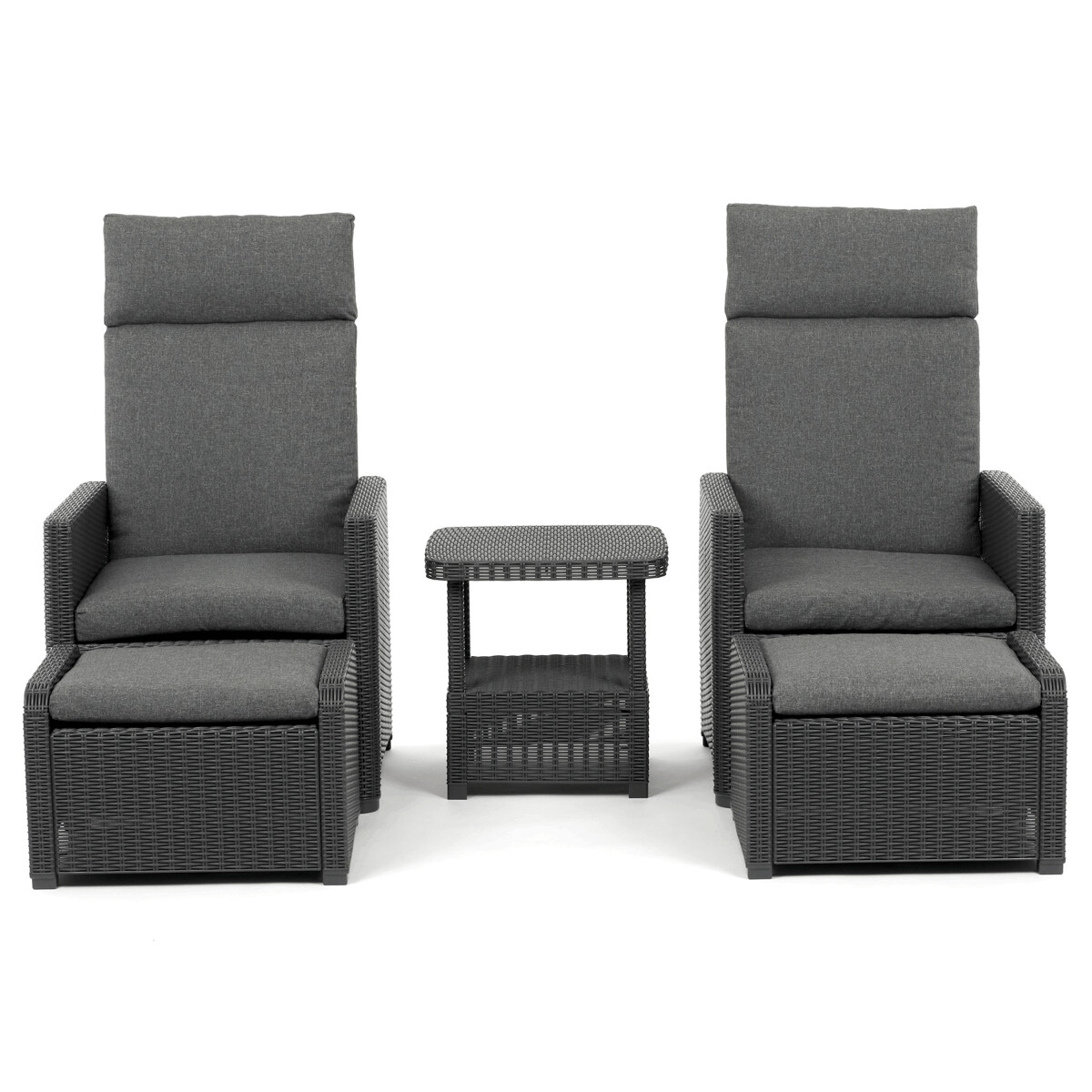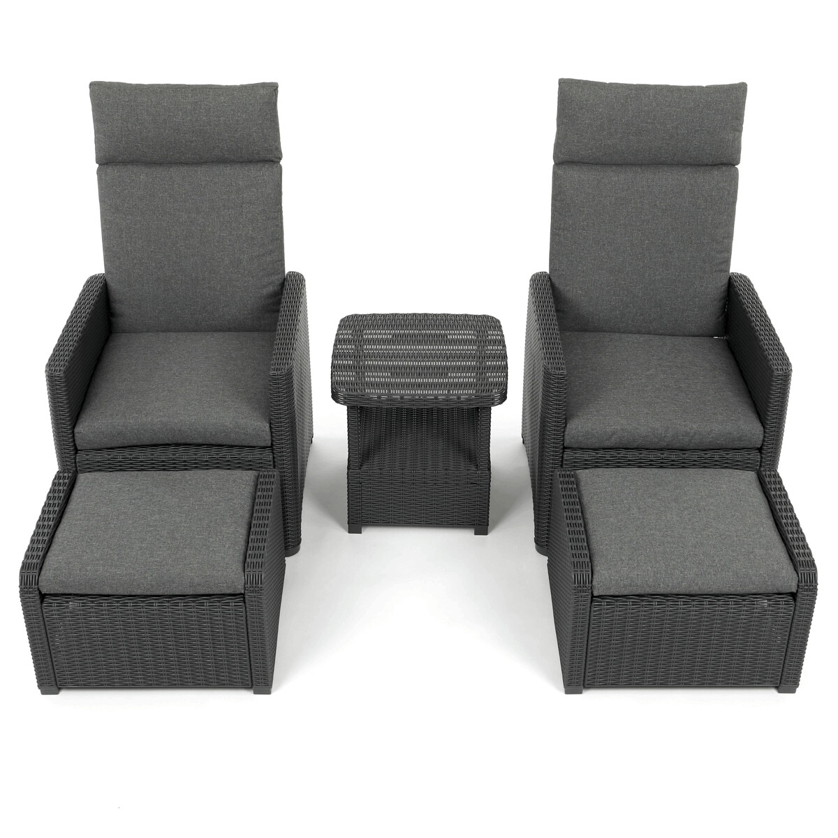Záhradný set 1+2 v šedom prevedení kombinuje pevný kovový rám s výplňou z polyratanu ktoré zaisťuje ľahkú údržbu a dlhú životnosť aj pri vonkajšom použití. Sada obsahuje dve polohovacie kreslá s nastaviteľným sklonom operadla pre maximálny komfort a dva bonusové taburety, ktoré je možné využiť ako podnožky alebo ďalšie sedacie plochy. Súčasťou je aj praktický stolík s doskou z umelého ratanu, ktorý dopĺňa celkový vzhľad a funkčnosť setu. Ideálna voľba na relaxáciu na záhrade, terase či balkóne.