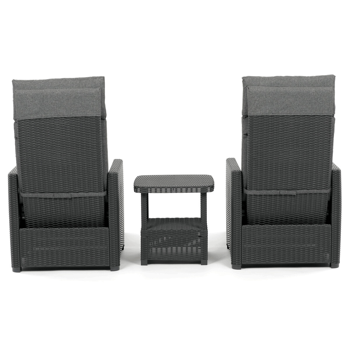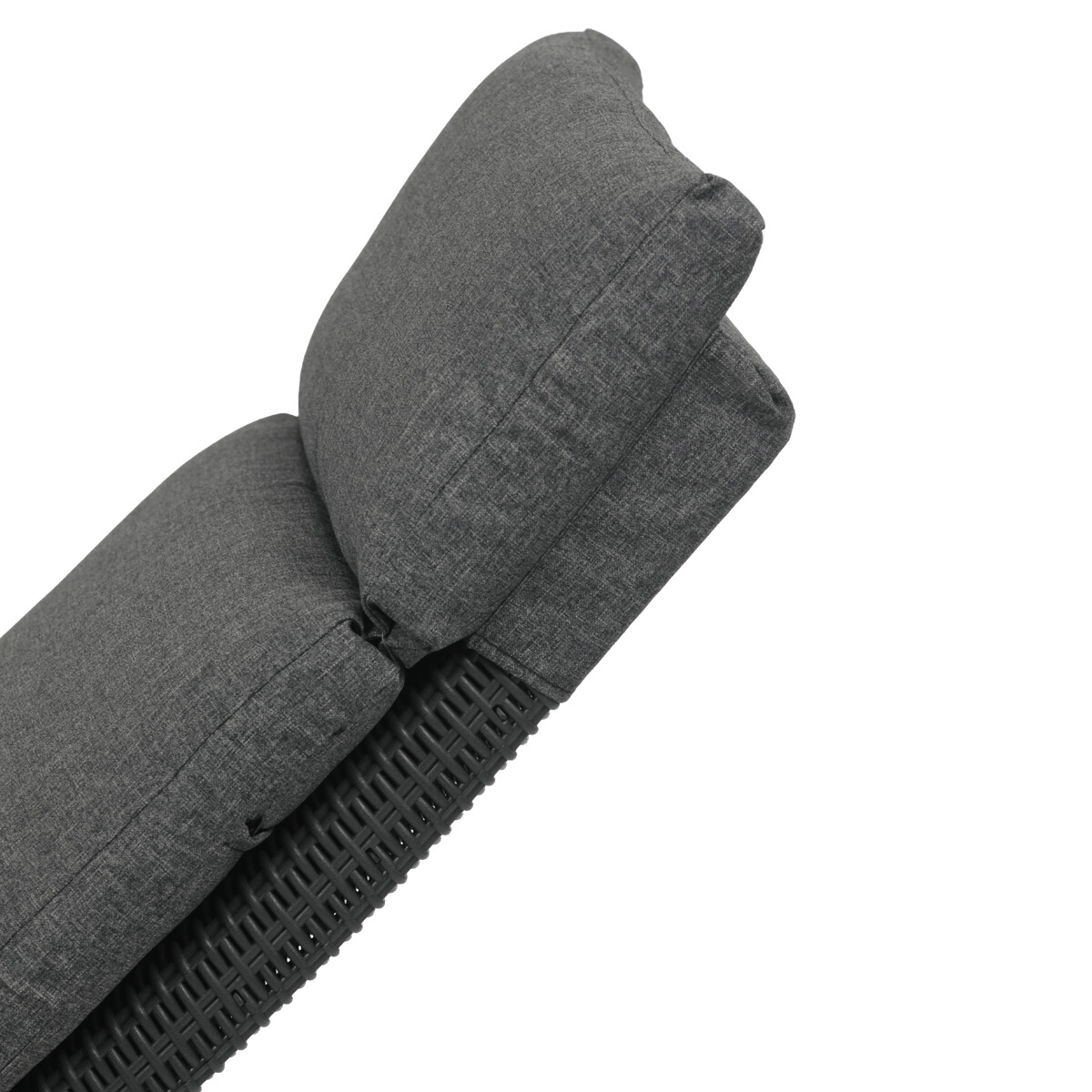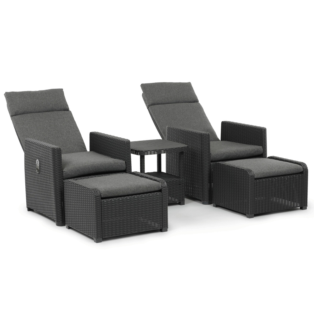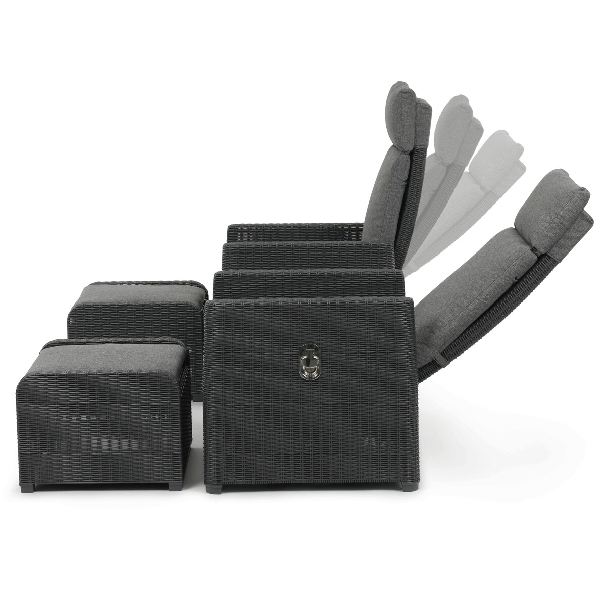Záhradný set 1+2 v šedom prevedení kombinuje pevný kovový rám s výplňou z polyratanu ktoré zaisťuje ľahkú údržbu a dlhú životnosť aj pri vonkajšom použití. Sada obsahuje dve polohovacie kreslá s nastaviteľným sklonom operadla pre maximálny komfort a dva bonusové taburety, ktoré je možné využiť ako podnožky alebo ďalšie sedacie plochy. Súčasťou je aj praktický stolík s doskou z umelého ratanu, ktorý dopĺňa celkový vzhľad a funkčnosť setu. Ideálna voľba na relaxáciu na záhrade, terase či balkóne.