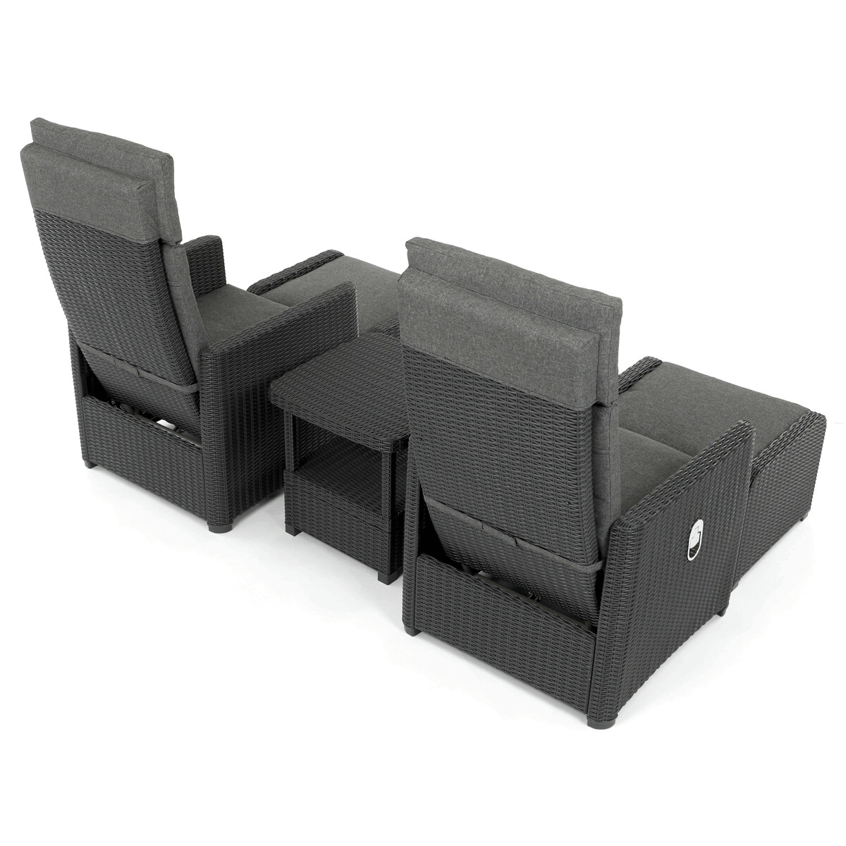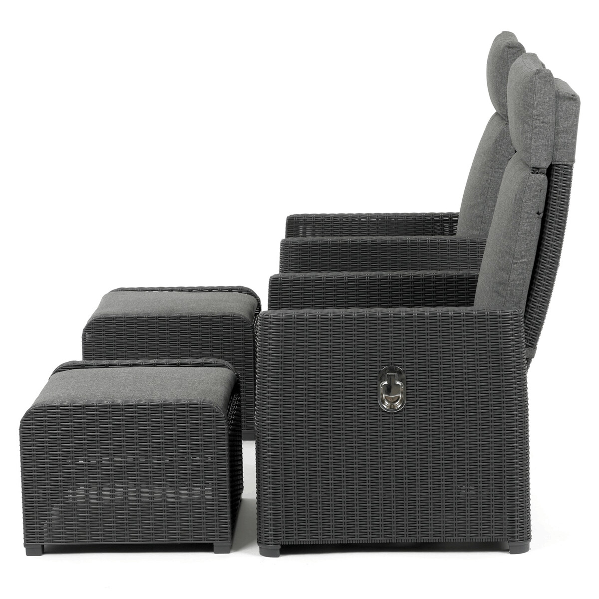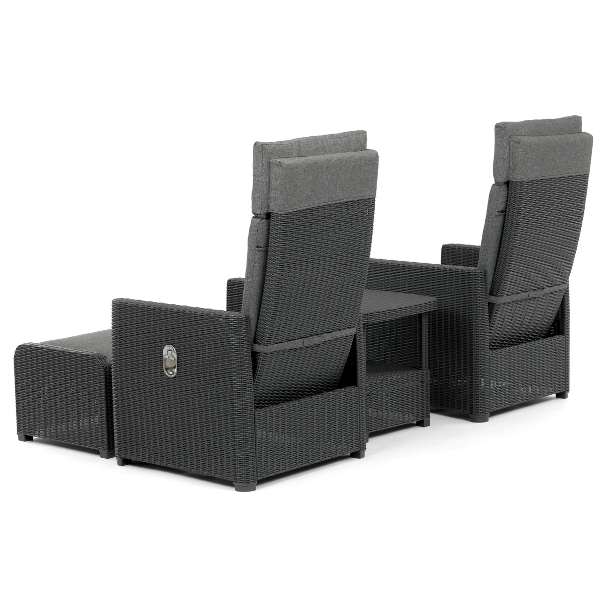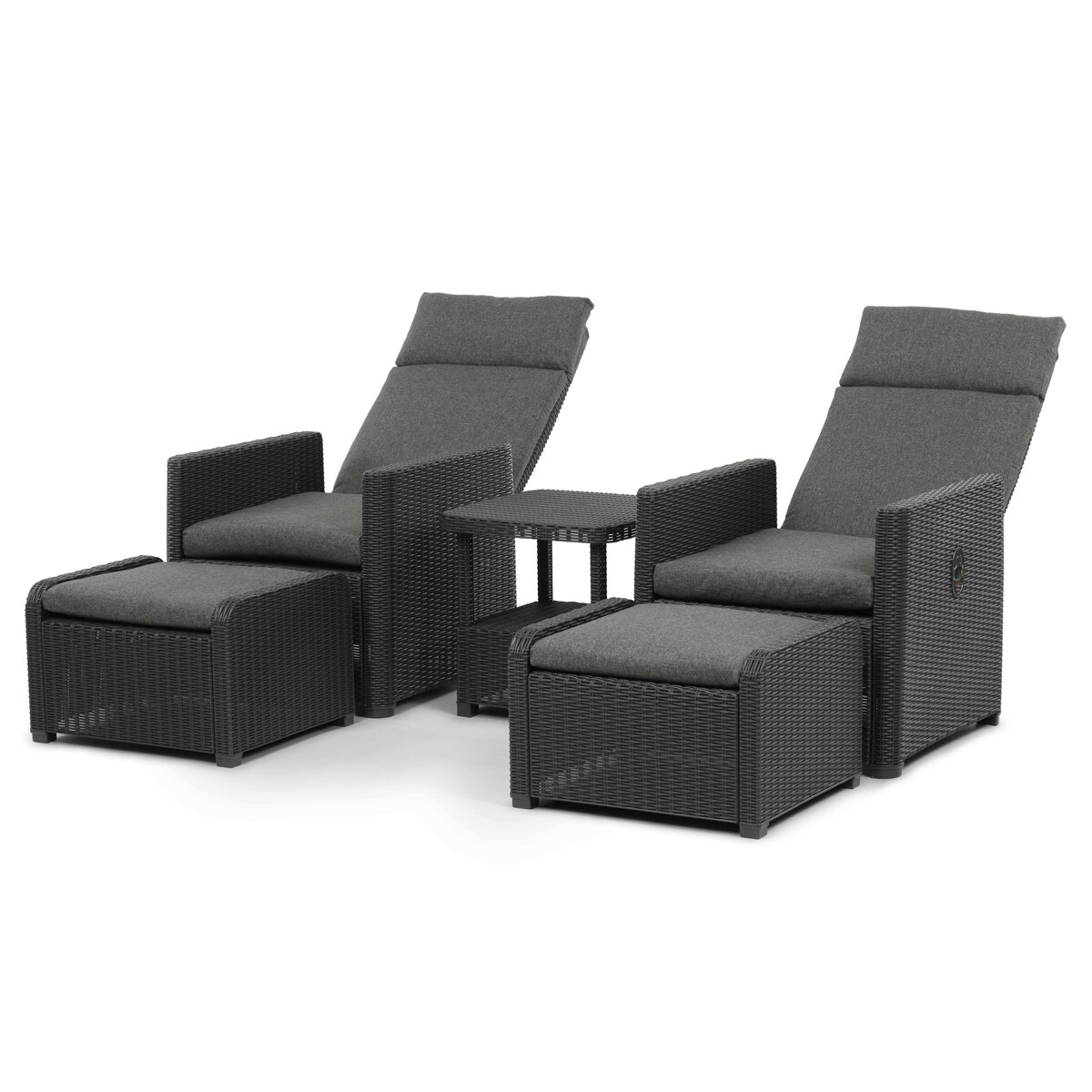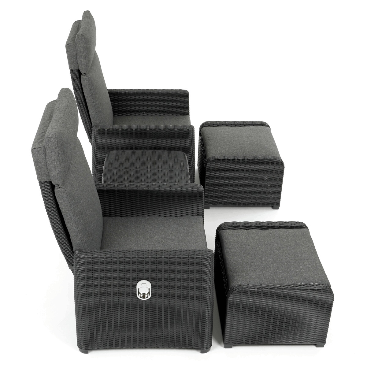 Záhradný set 1+2 v šedom prevedení kombinuje pevný kovový rám s výplňou z polyratanu ktoré zaisťuje ľahkú údržbu a dlhú životnosť aj pri vonkajšom použití. Sada obsahuje dve polohovacie kreslá s nastaviteľným sklonom operadla pre maximálny komfort a dva bonusové taburety, ktoré je možné využiť ako podnožky alebo ďalšie sedacie plochy. Súčasťou je aj praktický stolík s doskou z umelého ratanu, ktorý dopĺňa celkový vzhľad a funkčnosť setu. Ideálna voľba na relaxáciu na záhrade, terase či balkóne.