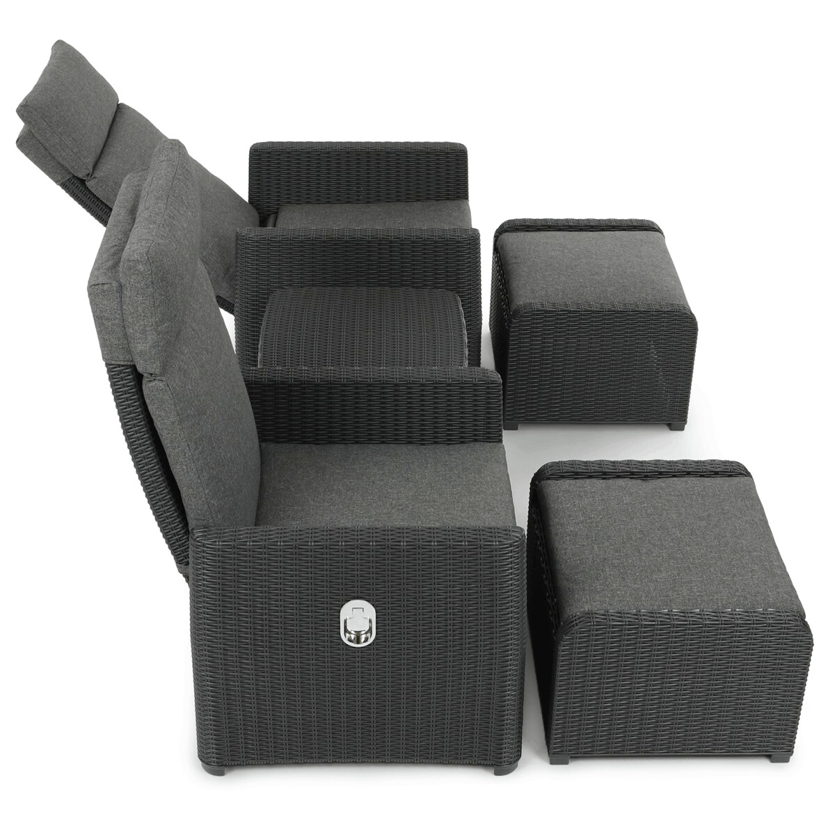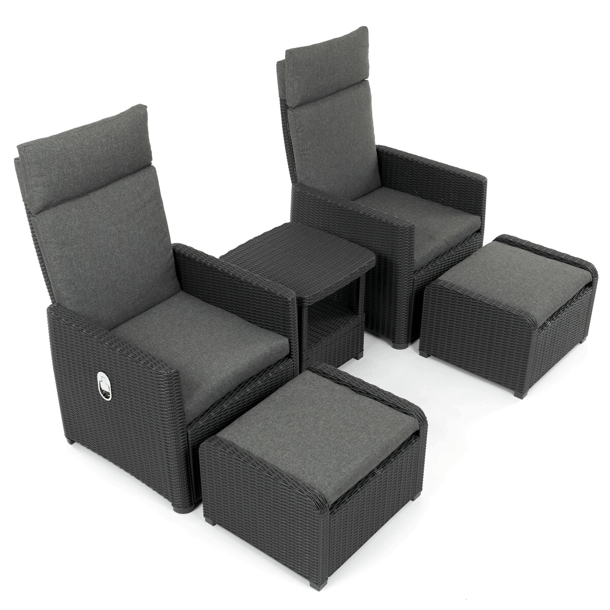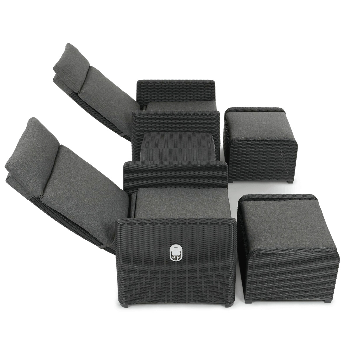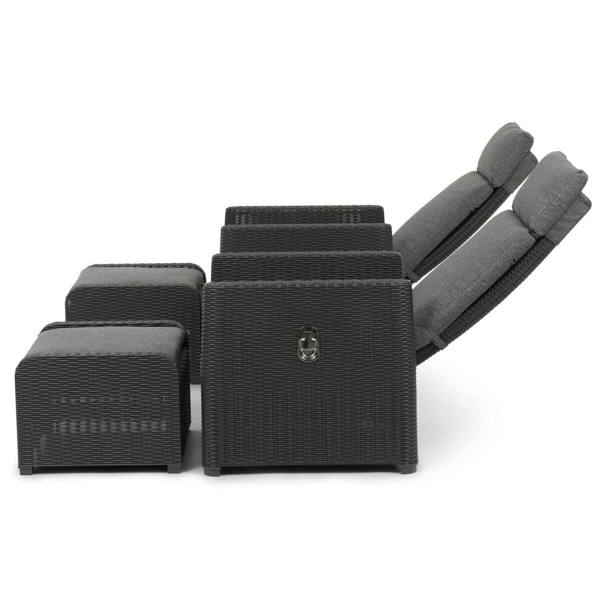 Záhradný set 1+2 v šedom prevedení kombinuje pevný kovový rám s výplňou z polyratanu ktoré zaisťuje ľahkú údržbu a dlhú životnosť aj pri vonkajšom použití. Sada obsahuje dve polohovacie kreslá s nastaviteľným sklonom operadla pre maximálny komfort a dva bonusové taburety, ktoré je možné využiť ako podnožky alebo ďalšie sedacie plochy. Súčasťou je aj praktický stolík s doskou z umelého ratanu, ktorý dopĺňa celkový vzhľad a funkčnosť setu. Ideálna voľba na relaxáciu na záhrade, terase či balkóne.