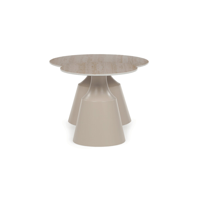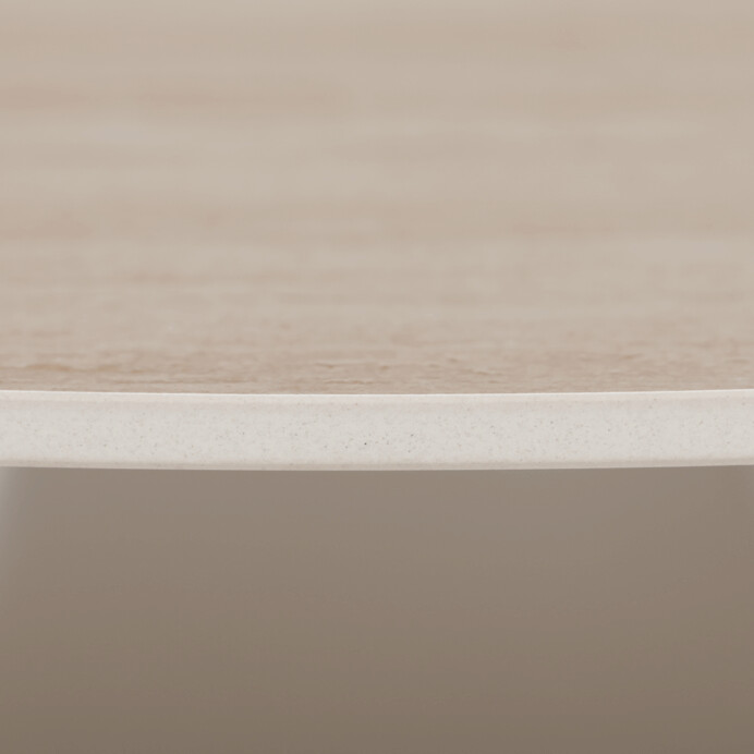 Sada dvoch konferenčných stolov v béžovom odtieni kombinuje keramické dosky s matnou povrchovou úpravou a stabilné kovové podnože, ktoré zabezpečujú pevnosť a dlhú životnosť. Väčší stôl má priemer 70 cm a výšku 43,5 cm, menší potom priemer 50 cm a výšku 48,5 cm, čo umožňuje variabilné usporiadanie v priestore. Keramická doska je odolná voči poškriabaniu a ľahko sa udržiava, čo prispieva k praktickému využitiu v moderných interiéroch. Kovová podnož je navrhnutá pre stabilitu a bezpečné umiestnenie na rôznych typoch podláh. Dizajn stolov s jemným travertínovým vzorom dodáva priestoru prírodný a zároveň súčasný vzhľad.