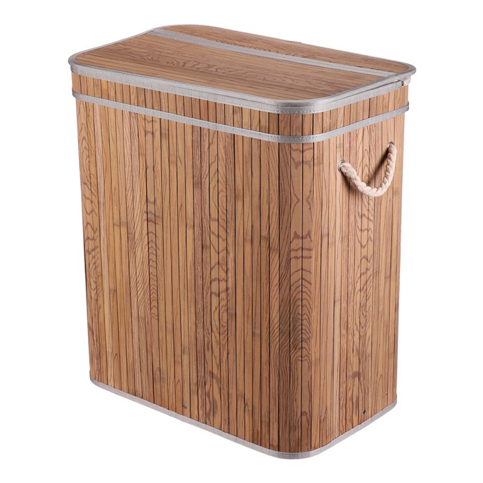 Práčkový kôš z bambusu v šedo-hnedom odtieni ponúka praktické a estetické riešenie na uloženie bielizne. Kôš je vybavený vekom, ktoré pomáha udržať priestor uprataný a zároveň zabraňuje šíreniu pachov. Pevné prevedenie z bambusových lamiel je doplnené textilným lemovaním a dvoma pevnými úchytmi z prírodného povrazu pre jednoduchú manipuláciu. Vďaka svojmu prírodnému vzhľadu sa hodí do rôznych typov interiérov, najmä tých s prírodnými alebo rustikálnymi prvkami. Rozmery koša umožňujú dostatočnú kapacitu pre bežné domáce použitie.