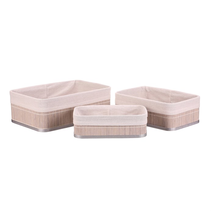 Sada troch regálových košov v sivom prevedení kombinuje prírodný bambus s látkovým lemovaním, ktoré zabezpečuje jemný kontrast a príjemný vzhľad. Koše majú pevné dno a steny z bambusových lamiel usporiadaných do pravidelného vzoru, čo prispieva k ich stabilite a zároveň ľahkosti. Látkový lem v hornej časti košov uľahčuje manipuláciu a dodáva výrobku decentný dizajnový detail. Vhodné sú na organizáciu drobných predmetov v regáloch, skriniach alebo na pracovných stoloch, kde pomáhajú udržať poriadok a prehľadnosť. Vďaka prírodnému materiálu sa ľahko udržiavajú a prinášajú do priestoru prírodnú atmosféru.