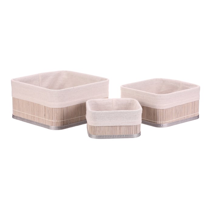 Sada troch regálových košov v sivom prevedení kombinuje prírodný bambus s textilným lemovaním, ktoré dod...zobraziť celý popis produktu