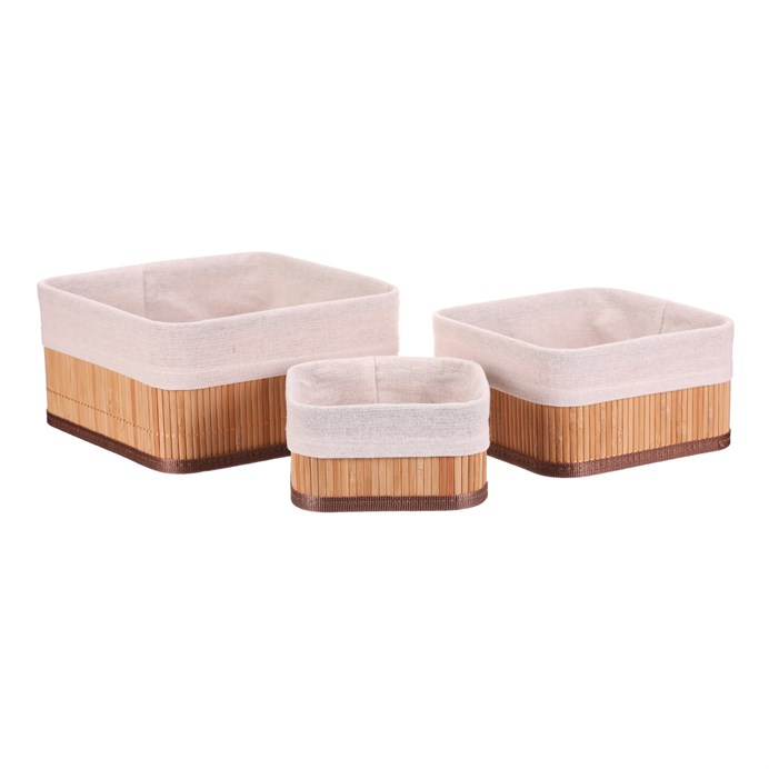 Sada troch regálových košov v prírodnom prevedení kombinuje pevné bambusové telo s jemnou textilnou výstelkou v béžovej farbe. Koše sú navrhnuté pre praktické usporiadanie drobných predmetov v regáloch, skriniach alebo na pracovných stoloch. Prírodné materiály zabezpečujú kvalitné spracovanie a jednoduchú údržbu, zatiaľ čo rôzne veľkosti košov umožňujú flexibilné využitie podľa potreby. Jemné lemovanie spodnej časti dodáva košom stabilitu a zároveň estetický detail. Sada je vhodná pre všetkých, ktorí hľadajú funkčné a zároveň vizuálne príjemné riešenie úložného priestoru.