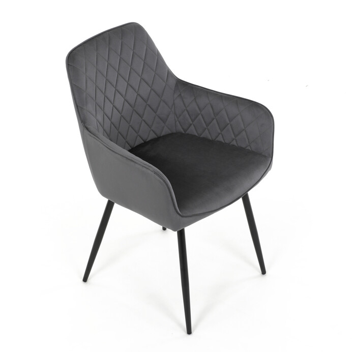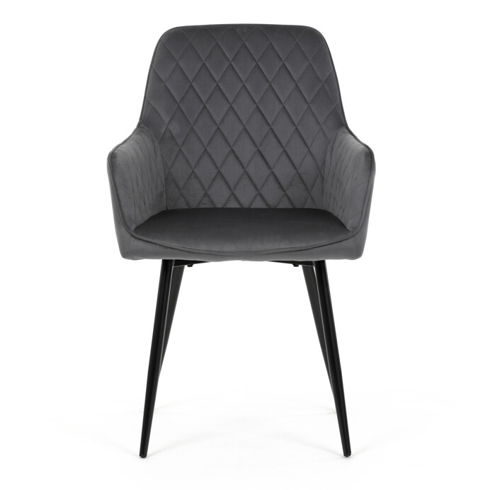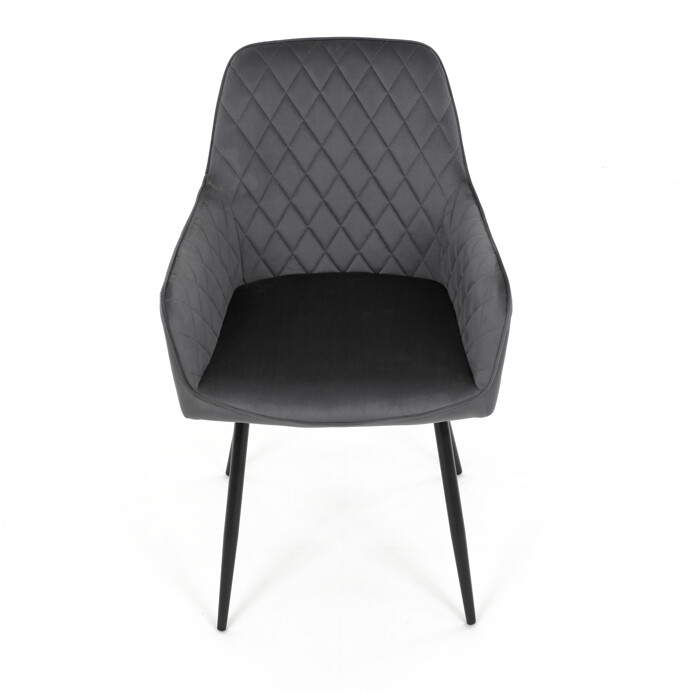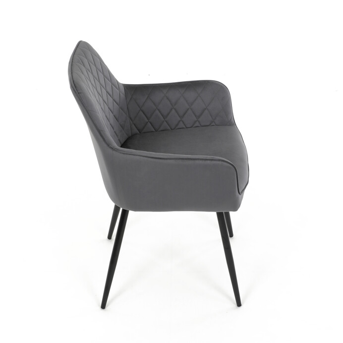 Jedálenská stolička s poťahom zo sivej zamatovej látky ponúka príjemný dotyk a vizuálne zaujímavý dizajn vďaka prešívaniu v kosoštvorcovom vzore na operadle aj podrúčkach. Pevné kovové nohy v čiernom matnom prevedení zabezpečujú stabilitu a dlhú životnosť. Ergonomicky tvarované operadlo s integrovanými podrúčkami podporuje pohodlné sedenie počas dlhších jedál aj stretnutí. Sedák je dostatočne široký a vyplnený mäkkou výplňou, ktorá prispieva k pohodliu. Stolička je vhodná do moderných aj klasických interiérov, kde vynikne jej kombinácia zamatu a kovu.