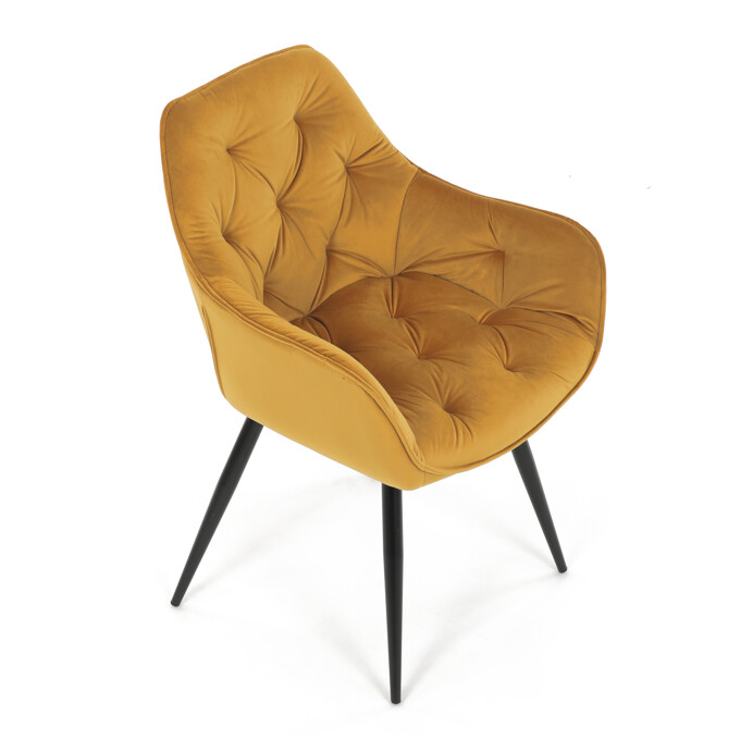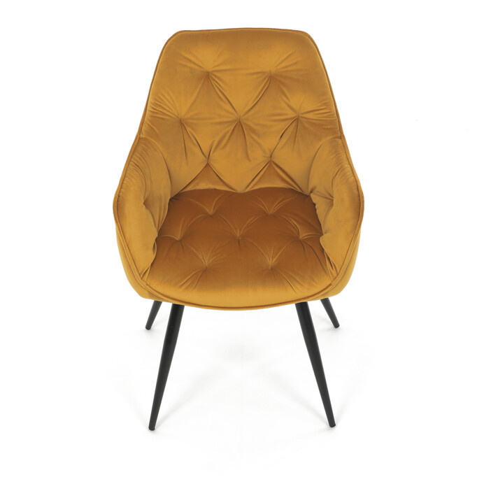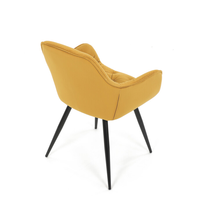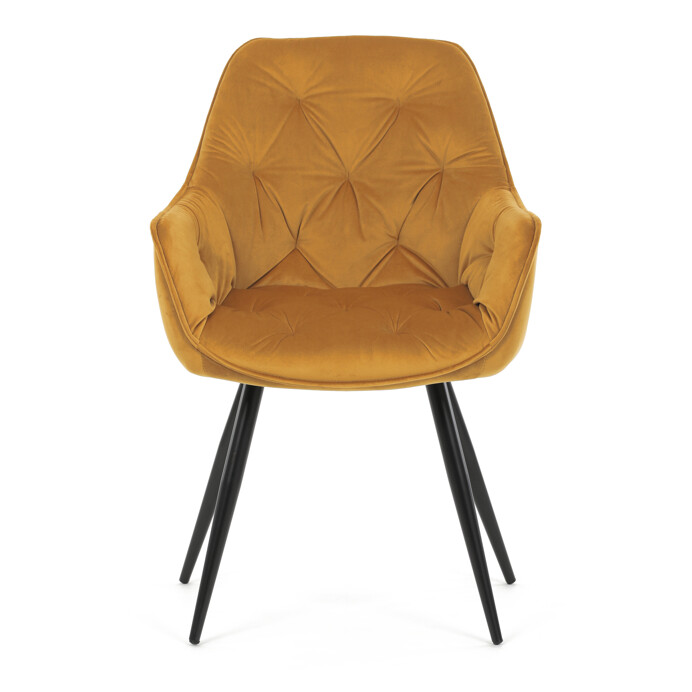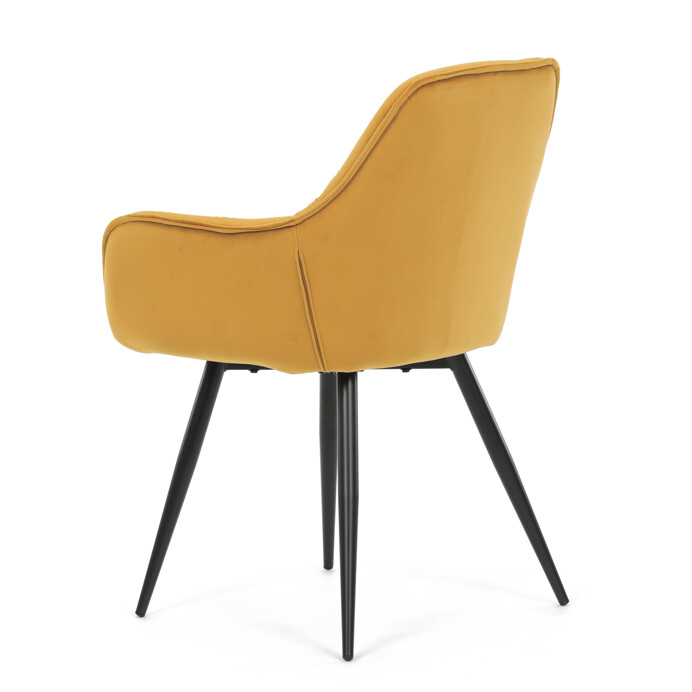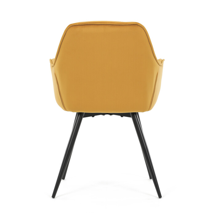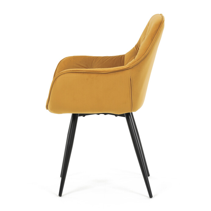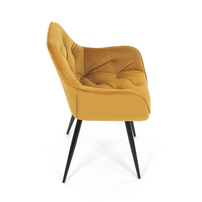 Jedálenská stolička s čalúnením v žltej zamatovej látke ponúka pohodlné sedenie vďaka mäkkému polstrovaniu a ergonomicky tvarovaným podrúčkam. Dizajnové prešívanie na operadle a sedáku dodáva stoličke štýlový vzhľad a zároveň zvýrazňuje jej elegantný profil. Pevná kovová štvornohá podnož s matným čiernym lakom zabezpečuje stabilitu a dlhú životnosť. Stolička je určená na použitie v jedálňach aj moderných interiéroch, kde vynikne jej výrazná farba aj kvalitné spracovanie. Nenáročná údržba látky a robustná konštrukcia podporujú každodenný komfort a funkčnosť.