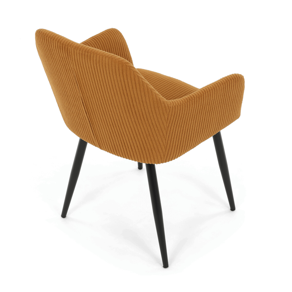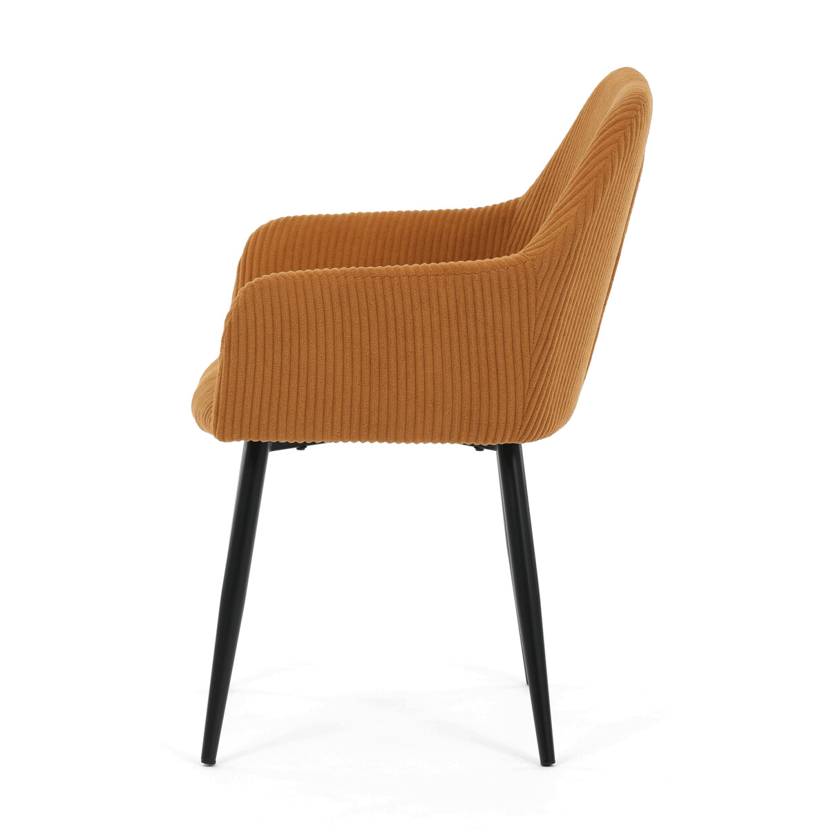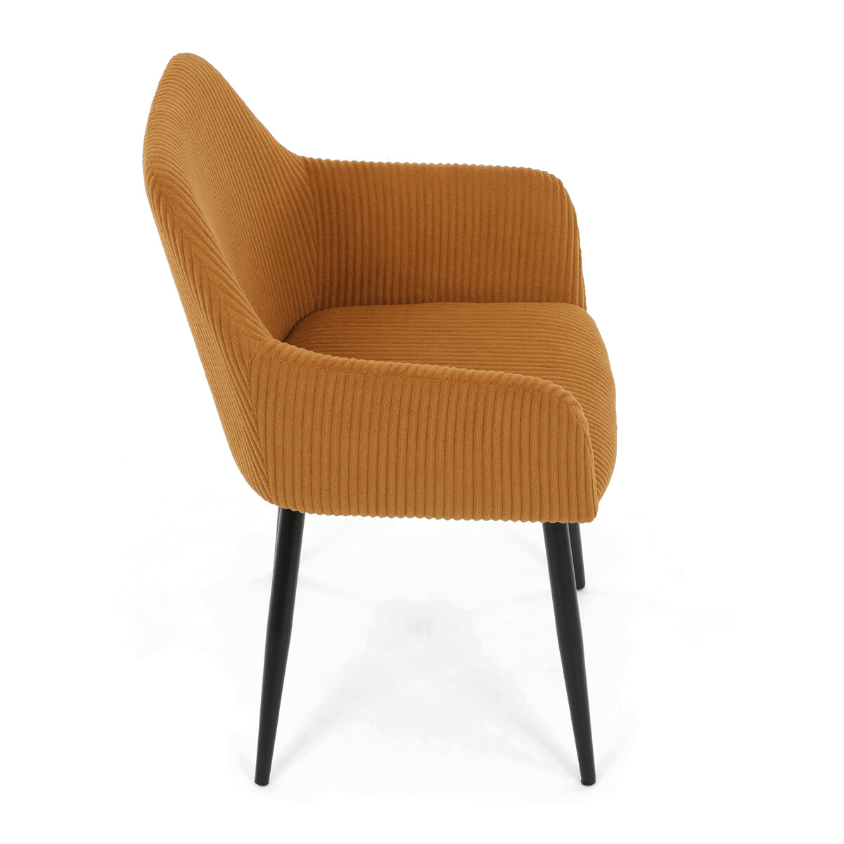 Čalúnená stolička s podrúčkami v horčicovo žltom manšestri ponúka pohodlné sedenie s príjemnou textúrou látky, ktorá je príjemná na dotyk a ľahko sa udržiava. Sedák aj operadlo sú vyplnené mäkkou penou, ktorá zabezpečuje komfort aj pri dlhšom sedení. Stabilné kovové nohy v čiernom matnom prevedení dodávajú stoličke pevnosť a zároveň moderný vzhľad. Podrúčky sú ergonomicky tvarované a čalúnené rovnakým materiálom ako sedák, čo prispieva k celkovému pohodliu a estetike. Stolička je určená na bežné používanie v jedálňach či kancelárskych priestoroch, kde oceníte kombináciu dizajnu a funkčnosti.