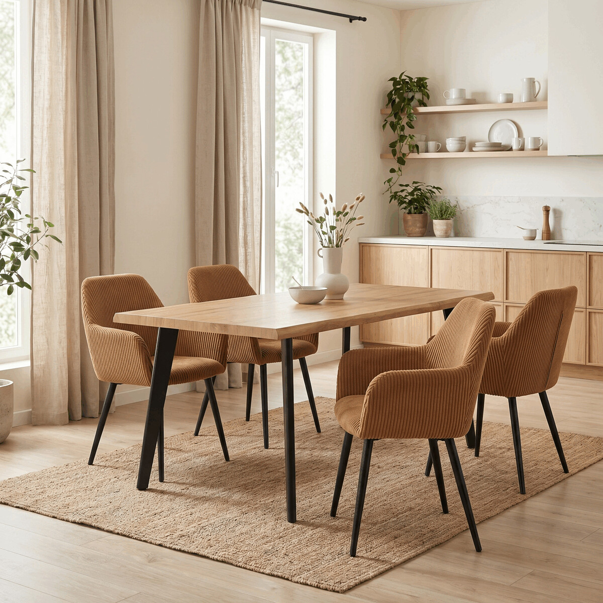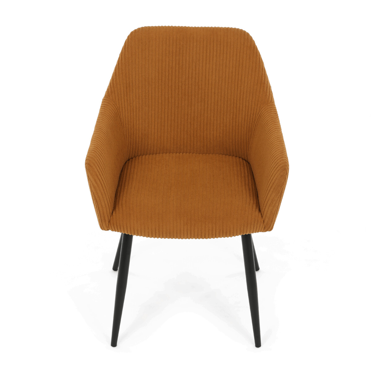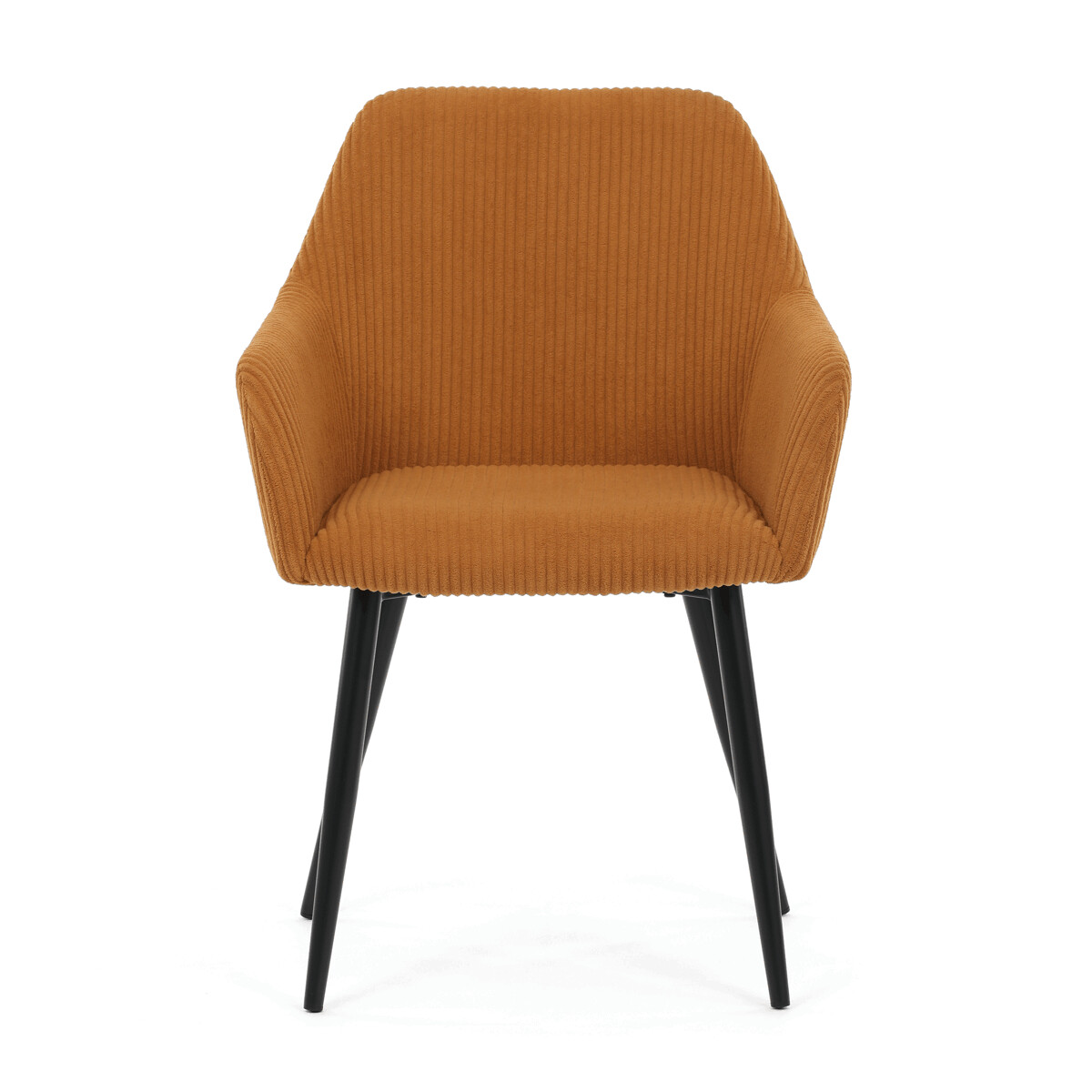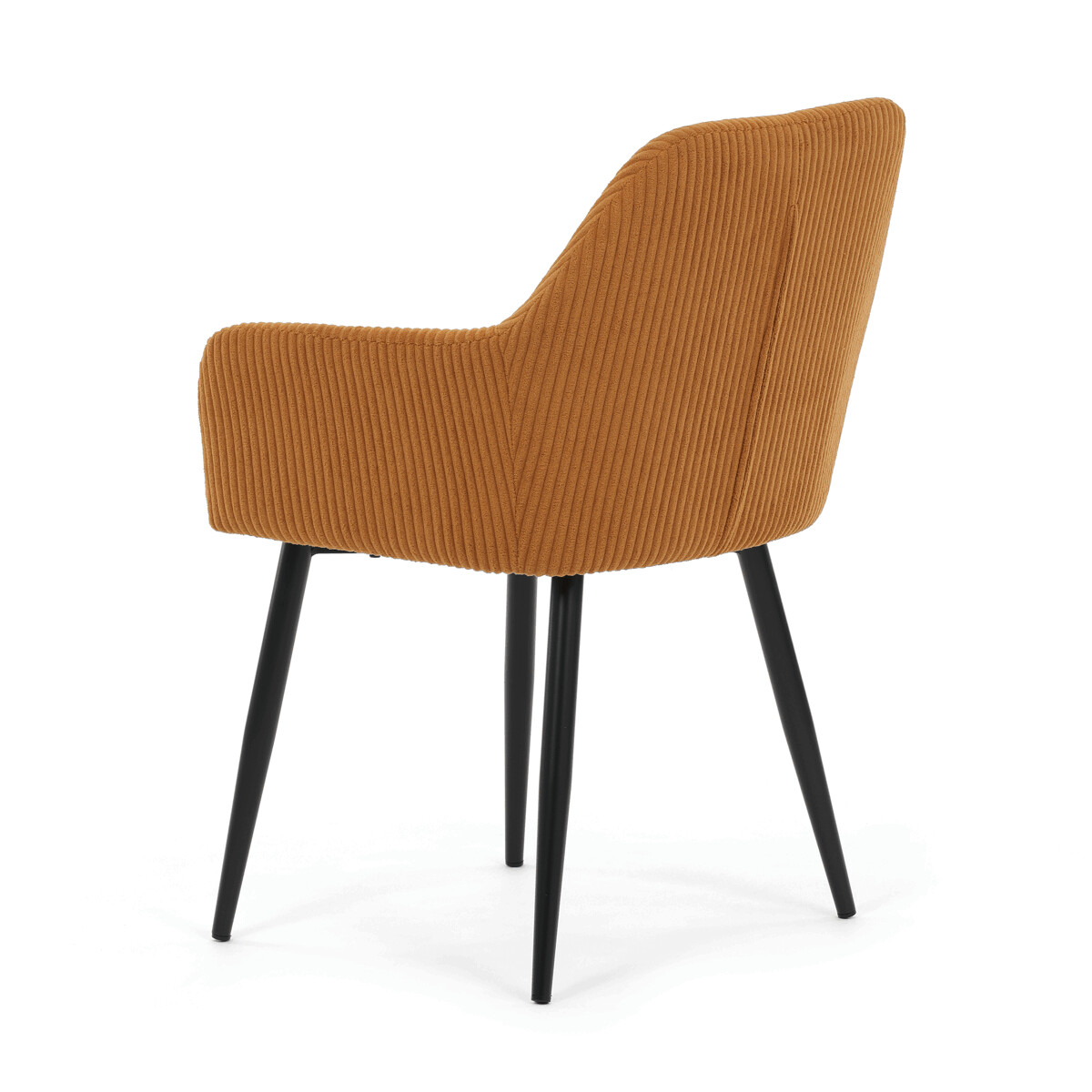 Čalúnená stolička s podrúčkami v horčicovo žltom manšestri ponúka pohodlné sedenie s príjemnou textúrou látky, ktorá je príjemná na dotyk a ľahko sa udržiava. Sedák aj operadlo sú vyplnené mäkkou penou, ktorá zabezpečuje komfort aj pri dlhšom sedení. Stabilné kovové nohy v čiernom matnom prevedení dodávajú stoličke pevnosť a zároveň moderný vzhľad. Podrúčky sú ergonomicky tvarované a čalúnené rovnakým materiálom ako sedák, čo prispieva k celkovému pohodliu a estetike. Stolička je určená na bežné používanie v jedálňach či kancelárskych priestoroch, kde oceníte kombináciu dizajnu a funkčnosti.