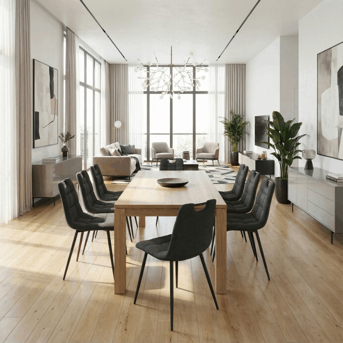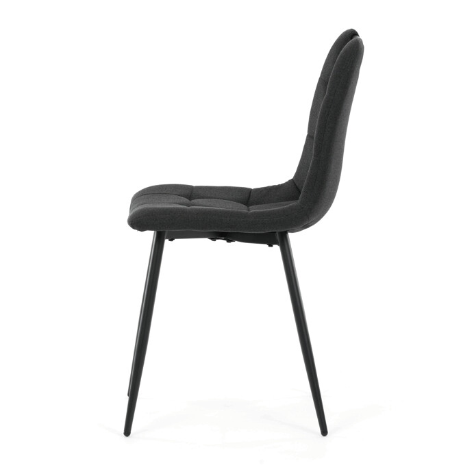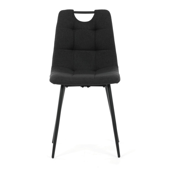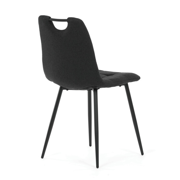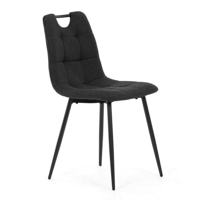 Jedálenská stolička s označením DCL-V2017 BK2 spája moderný dizajn s praktickými detailmi. Sedák a operadlo sú potiahnuté čiernou látkou, ktorá sa ľahko udržiava a je doplnená dizajnovým prešitím pre zvýraznenie estetického dojmu. Čierne kovové nohy s matnou povrchovou úpravou zabezpečujú stabilitu a pevnosť celej stoličky. Súčasťou operadla je praktické madlo, ktoré uľahčuje manipuláciu a prenášanie stoličky. Stolička nemá podrúčky ani otočný mechanizmus, čo ju robí vhodnou do jedálenských priestorov s obmedzeným miestom.