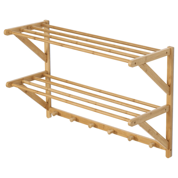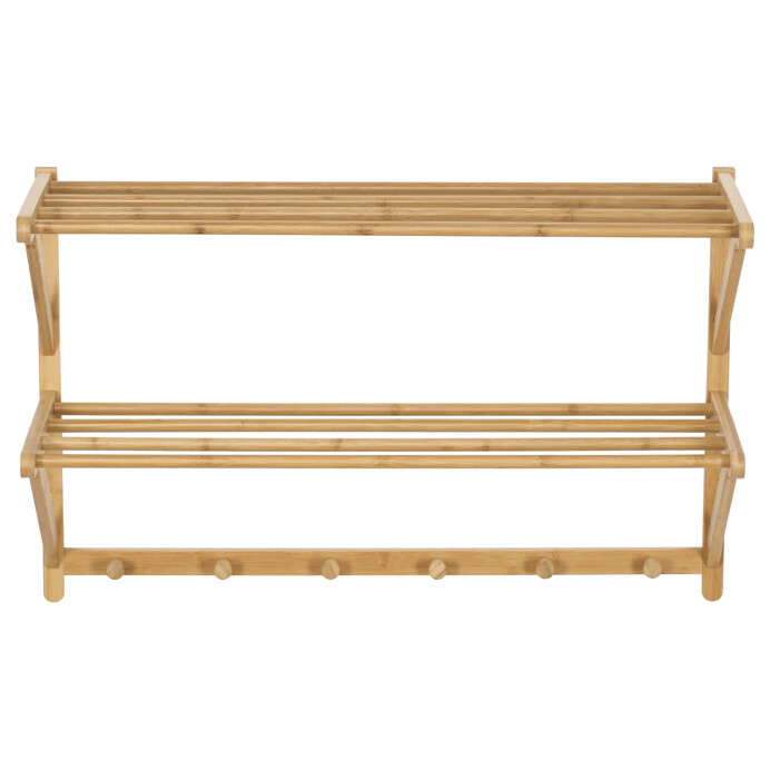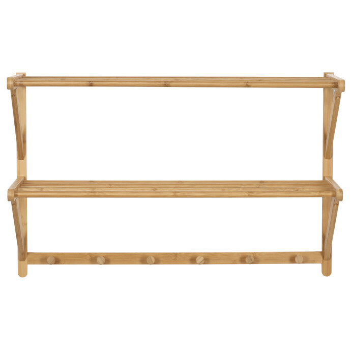 Nástenná polica s vešiakmi je vyrobená z masívneho bambusu v prírodnom odtieni, ktorý prináša do interiéru príjemnú a sviežu atmosféru. Polica ponúka dve úložné plochy tvorené pevnými tyčami, ktoré sú vhodné na odkladanie drobných predmetov či textilu. Spodná časť je vybavená šiestimi guľatými vešiakmi, ktoré umožňujú praktické zavesenie kabátov, klobúkov alebo tašiek. Vďaka kvalitnému spracovaniu a stabilnému uchyteniu na stenu je polica vhodná do vstupných hál, chodieb aj spální. Prírodný bambus sa ľahko udržiava a je navrhnutý pre dlhú životnosť.