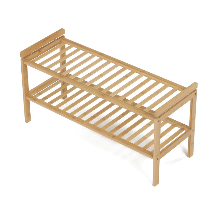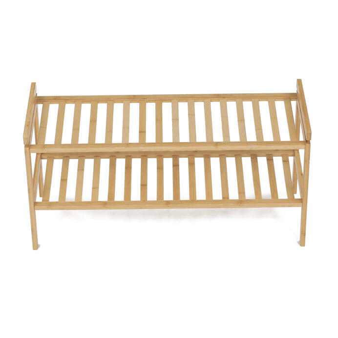Botník s dvoma policami je vyrobený z masívneho bambusu v prírodnom odtieni, ktorý zabezpečuje pevnosť a dlhú životnosť. Otvorená polica s vodorovnými latkami umožňuje efektívne vetranie a rýchle schnutie obuvi. Jednoduchý a funkčný dizajn botníka sa hodí do rôznych interiérov, kde ponúka praktické riešenie na uskladnenie topánok. Stabilný rám a rovné nohy zaručujú bezpečné a pevné postavenie. Rozmery botníka umožňujú uloženie viacerých párov obuvi bez zbytočnej náročnosti na priestor.