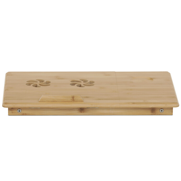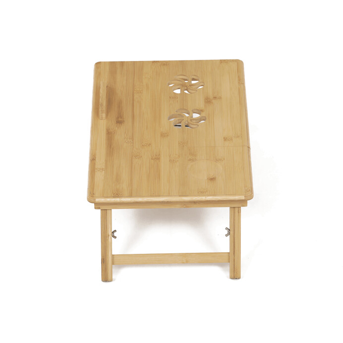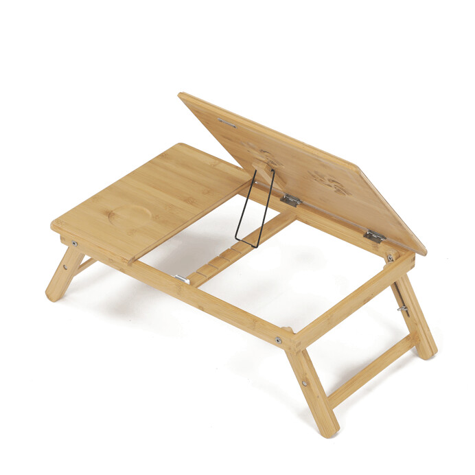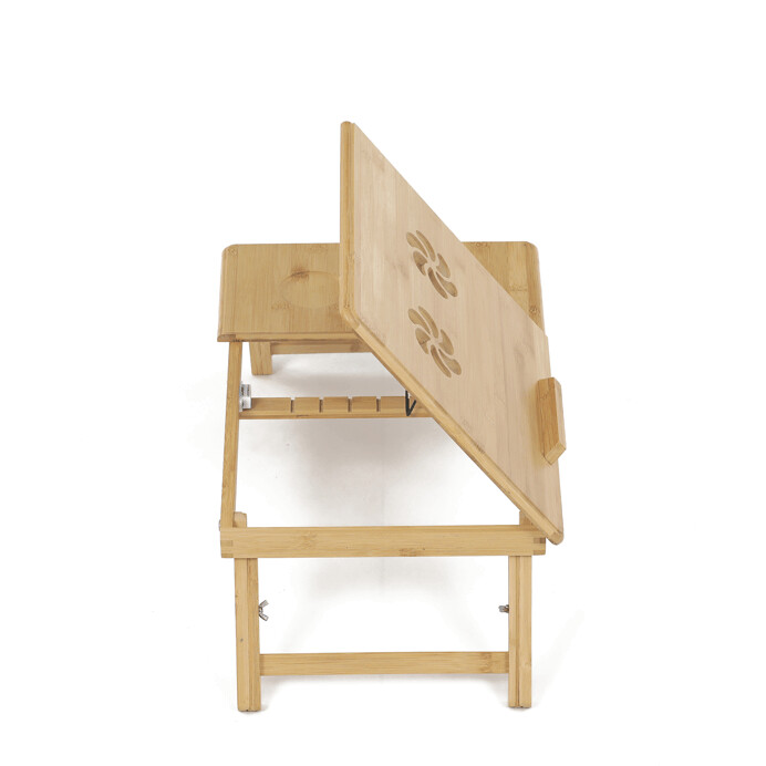 Skladací stolík na notebook z masívneho bambusu v prírodnom odtieni ponúka praktické a estetické riešenie pre prácu aj oddych. Doska stolíka je rozdelená na dve časti, pričom hlavná časť je nastaviteľná do niekoľkých uhlov a vybavená ventilačnými otvormi pre lepšie chladenie zariadenia. Vedľajšia plocha slúži ako odkladací priestor napríklad na myš alebo šálku. Pevné nohy z masívneho bambusu sú vybavené protišmykovými koncovkami a umožňujú jednoduché skladanie pre úsporu miesta pri skladovaní či preprave. Vďaka kvalitnému prírodnému materiálu sa stolík ľahko udržiava a je navrhnutý pre dlhú životnosť.