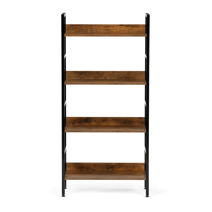 Regál so štyrmi policami ponúka dostatok odkladacieho priestoru na knihy, dekorácie a ďalšie predmety. Police sú vyrobené z MDF s dekorom starého dreva v hnedom odtieni, ktorý dodáva nábytku rustikálny charakter. Stabilný kovový rám s čiernym lakom zabezpečuje pevnosť a dlhú životnosť regálu. Otvorená konštrukcia umožňuje jednoduchý prístup a zároveň pôsobí vzdušne v interiéri. Regál je vhodný do obývačky, pracovne alebo kancelárie.