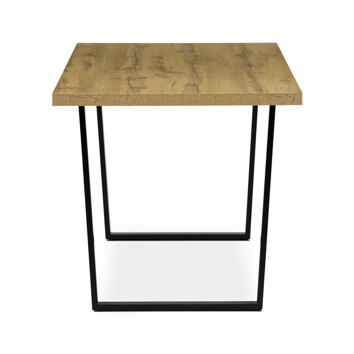 Jedálenský stôl s rozmermi 160x80x76 cm kombinuje dosku z hnedého lamina s dekorom dubu a stabilnú kovovú podnož v čiernom matnom prevedení. Doska je opatrená ABS hranou, ktorá chráni okraje pred poškodením a uľahčuje údržbu, zatiaľ čo matný povrch zabezpečuje príjemný vzhľad bez lesku. Pevná kovová podnož poskytuje vysokú stabilitu a nosnosť, čo umožňuje pohodlné využitie v jedálenských priestoroch. Materiál dosky je navrhnutý pre jednoduchú údržbu a odolnosť voči bežnému opotrebovaniu, čo prispieva k dlhej životnosti stola. Tento model je ideálnou voľbou pre moderné interiéry, kde sa kladie dôraz na funkčnosť a jednoduchý dizajn.