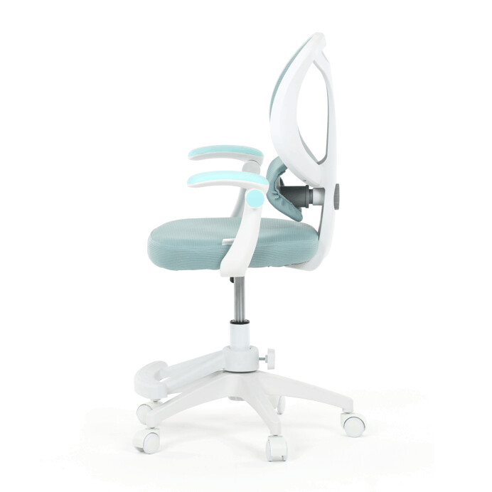 Detská kancelárska stolička s modrou sieťovinou ponúka pohodlné a vzdušné sedenie vďaka priedušnému materiálu operadla a sedáku. Biele plastové nohy s piatimi kolieskami zabezpečujú stabilitu a ľahkú mobilitu po rôznych typoch podláh. Odklápacie podrúčky umožňujú flexibilné využitie priestoru, zatiaľ čo nastaviteľná bedrová opierka podporuje správne držanie chrbta počas práce alebo štúdia. Výškovo nastaviteľný sedák umožňuje prispôsobenie stoličky aktuálnej výške dieťaťa, čo prispieva k ergonómii a komfortu. Súčasťou je aj praktická opierka nôh pre zvýšenie pohodlia pri dlhšom sedení.